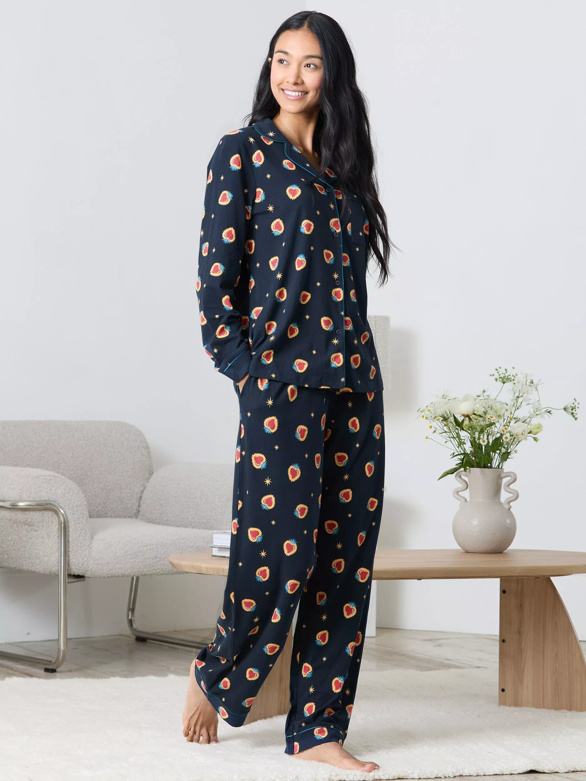 Dreamy nights start here. This pyjama set is decorated with a hand-drawn Enchanted Heart print, featuring delicate framed hearts and tiny scattered stars for a touch of magic. Made from 95% cotton, the fabric is soft, breathable and finished with a hint of stretch for all-night comfort. The revere collar shirt comes with a button-up front, chest pocket and tonal piping, while the matching bottoms feature an elasticated waistband and side pockets. Wrapped in romance, they're the perfect gift for someone special or treat yourself to the comfort you deserve, either way, it's love at first lounge. Romantic details, timeless comfort.