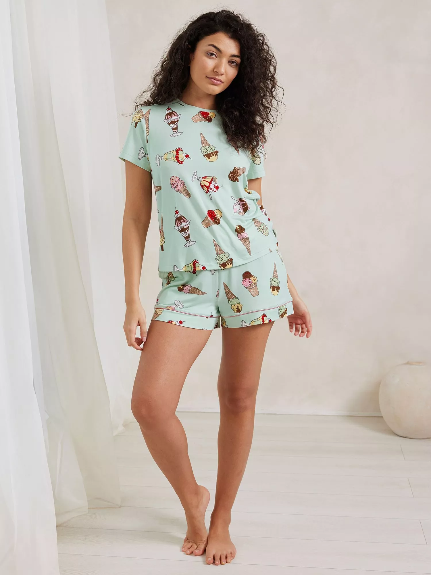 Your essential pj for holidays and summer adventures, these mint green short pyjamas feature a hand-drawn print of delicious ice cream sundaes, intricately detailed with flakes, sprinkles and even cherries on top.