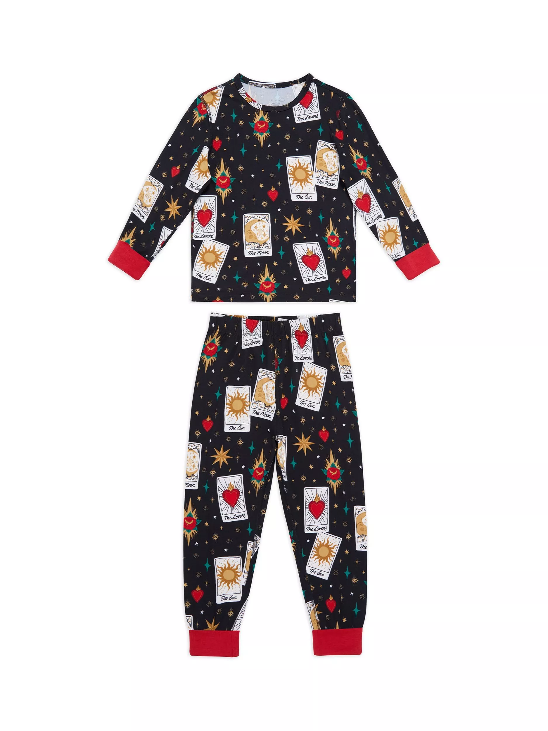 Dream of the future in these tarot card inspired pyjamas, crafted from soft yet durable jersey. The elasticated waist and ‘grow-with-me’ fold over cuffs keep up with growth spurts, while the tagless, sensory-friendly printed label design ensures all night comfort. With a round crew neck, long sleeves, and full-length bottoms, this set is written in the stars for little stargazers and story-makers alike.