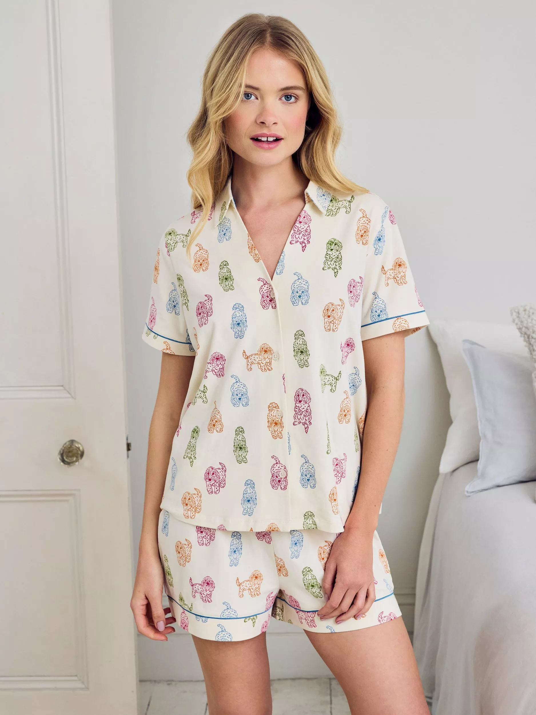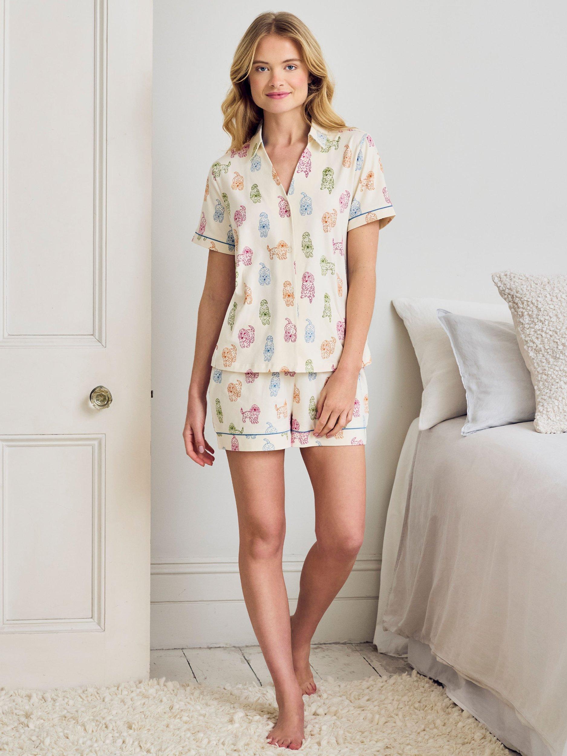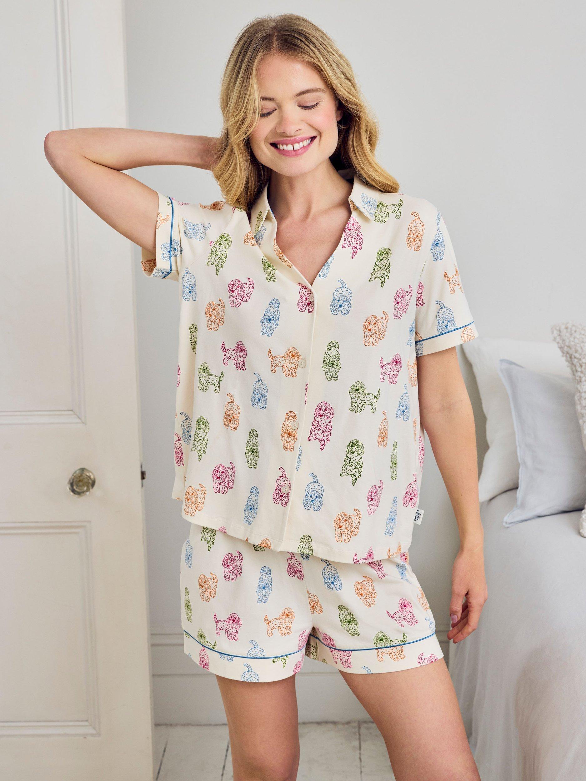 Feel-good lounging with a playful twist. This short pyjama set is made from breathable cotton jersey for a soft, easygoing fit. The Rainbow Cockapoo print brings the joy, featuring illustrated dogs in sitting, standing and lying poses. With a relaxed short-sleeve top and comfy elasticated shorts, it’s a charming little set made for sunny mornings and cosy nights in.