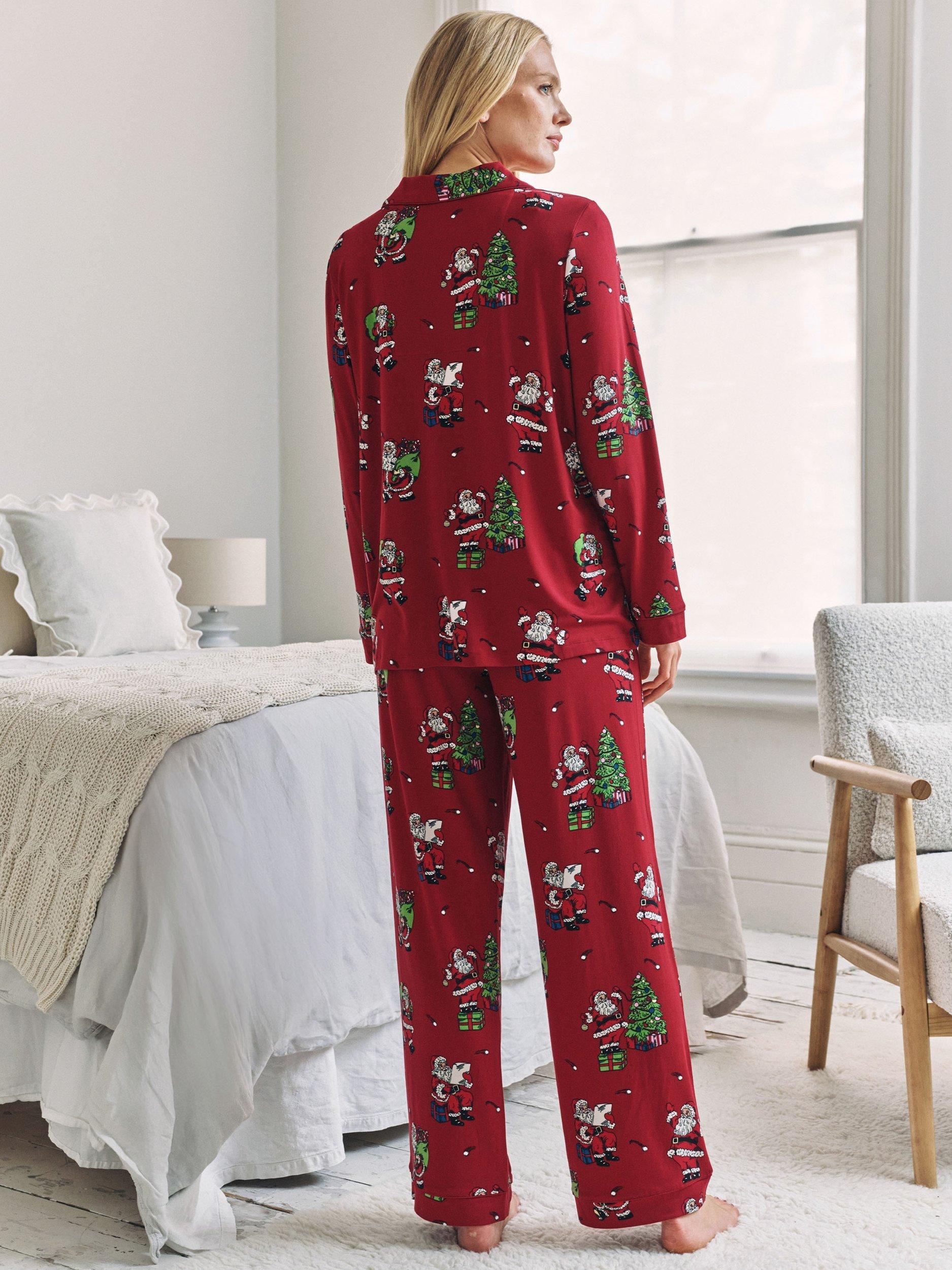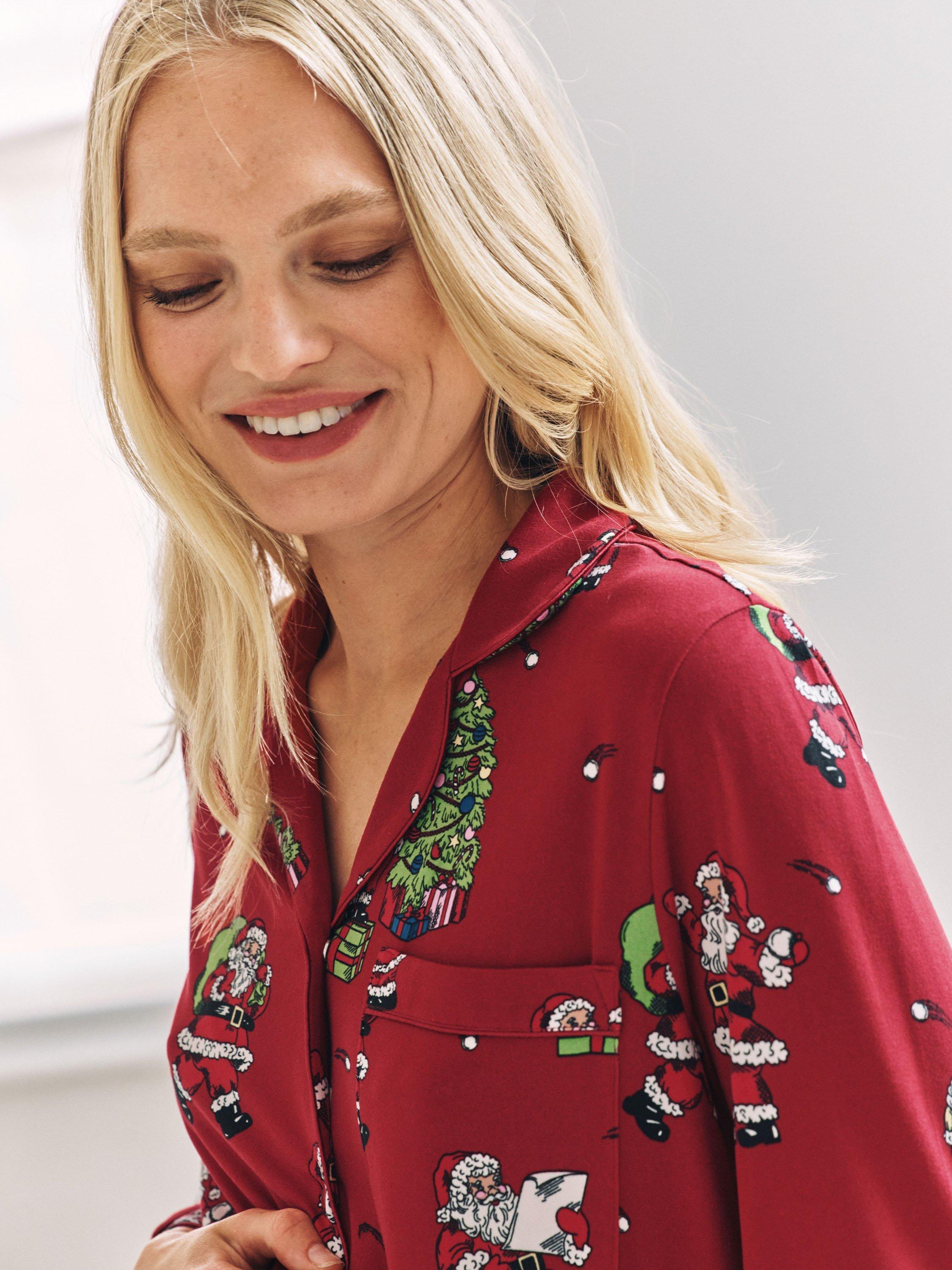 Santa takes centre stage in this playful print, shown decorating, delivering gifts, reading letters and playing in the snow. Printed across soft jersey, it’s a cosy and festive set designed with the same joyful spirit as the rest of the collection. The revere collar shirt has popper fastenings for easier nursing access once the baby has made their safe arrival, while the full over-bump band offers comfort through every trimester. A perfect way to join in the matching family moment this Christmas.
