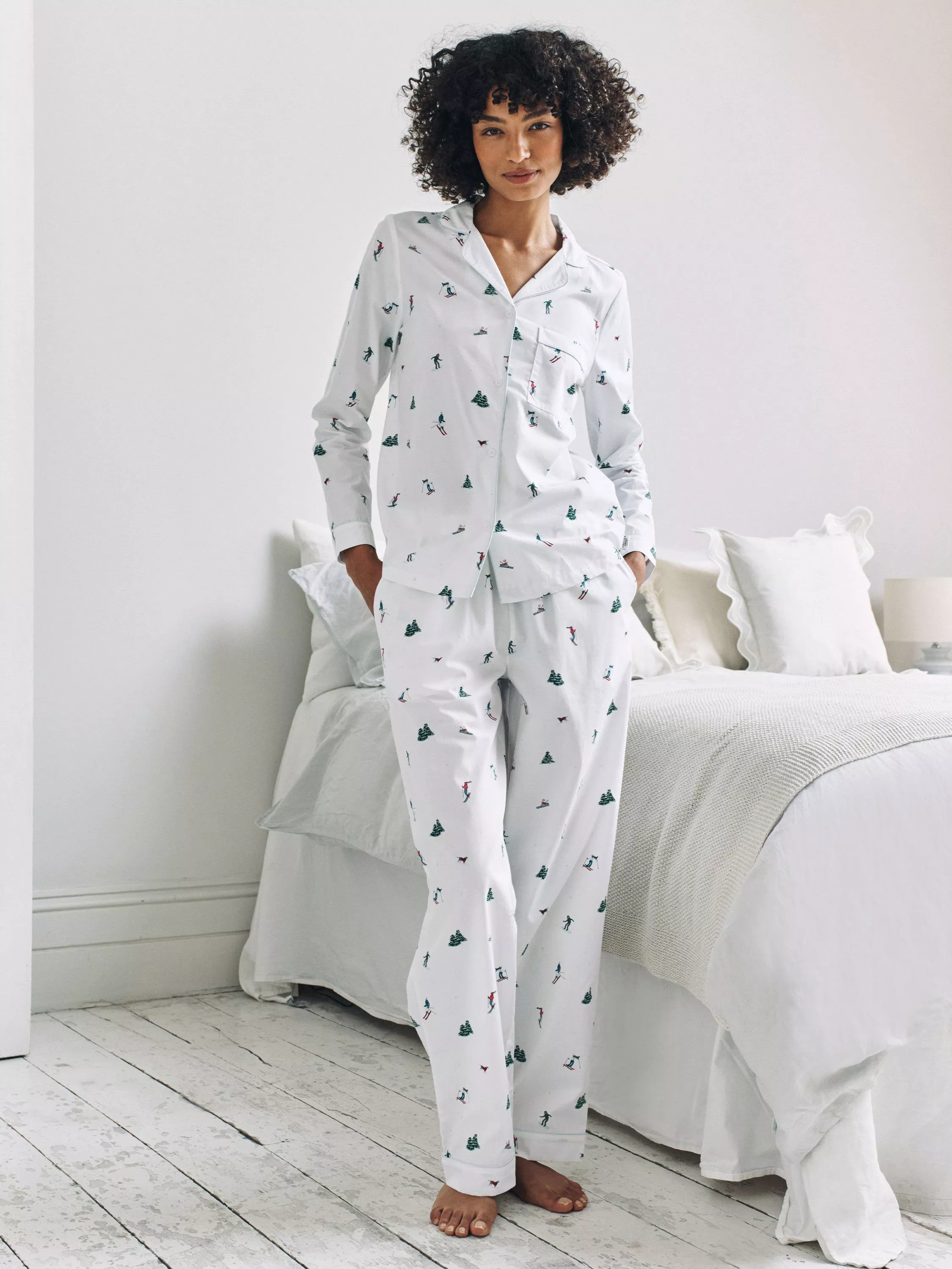 From Val-d'Isère to Whistler, this ski-inspired pyjama set brings all the thrill of the slopes to your sleepwear. Printed with playful hand-drawn skiers and snowboarders, it's a festive nod to those frosty mountain moments - perfect for celebrating Christmas in a cosy chalet (or just dreaming of one). Made from 100% cotton, the soft base is detailed with contrast piping and a classic revere collar. Finished with a chest pocket, elasticated waistband and side pockets for comfort that moves with you. Think white slopes, warm nights and chalet charm.