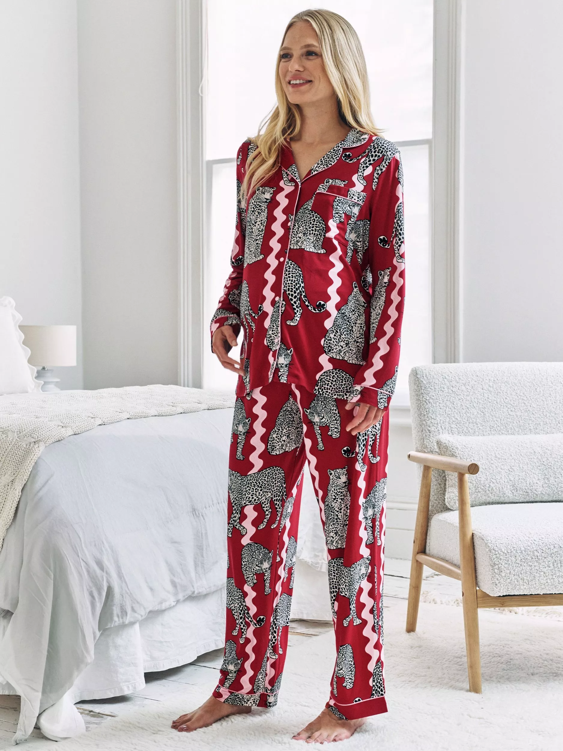 Chelsea Peers' iconic leopard gets a wintry makeover as a snow leopard, playfully scattered across wavy stripes reminiscent of ric rac ribbon. Crafted in soft jersey, this maternity set is designed for all-day comfort with a revere collar shirt, popper fastenings for easier nursing and contrasting piping. The full over-bump band stretches with you through every trimester, making it a set you’ll love wearing long after the snow melts.