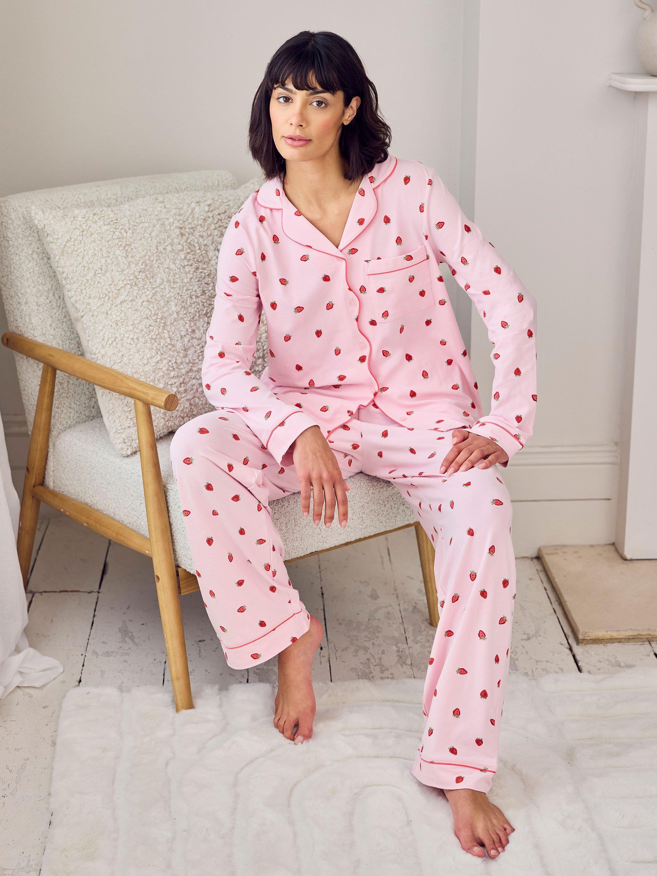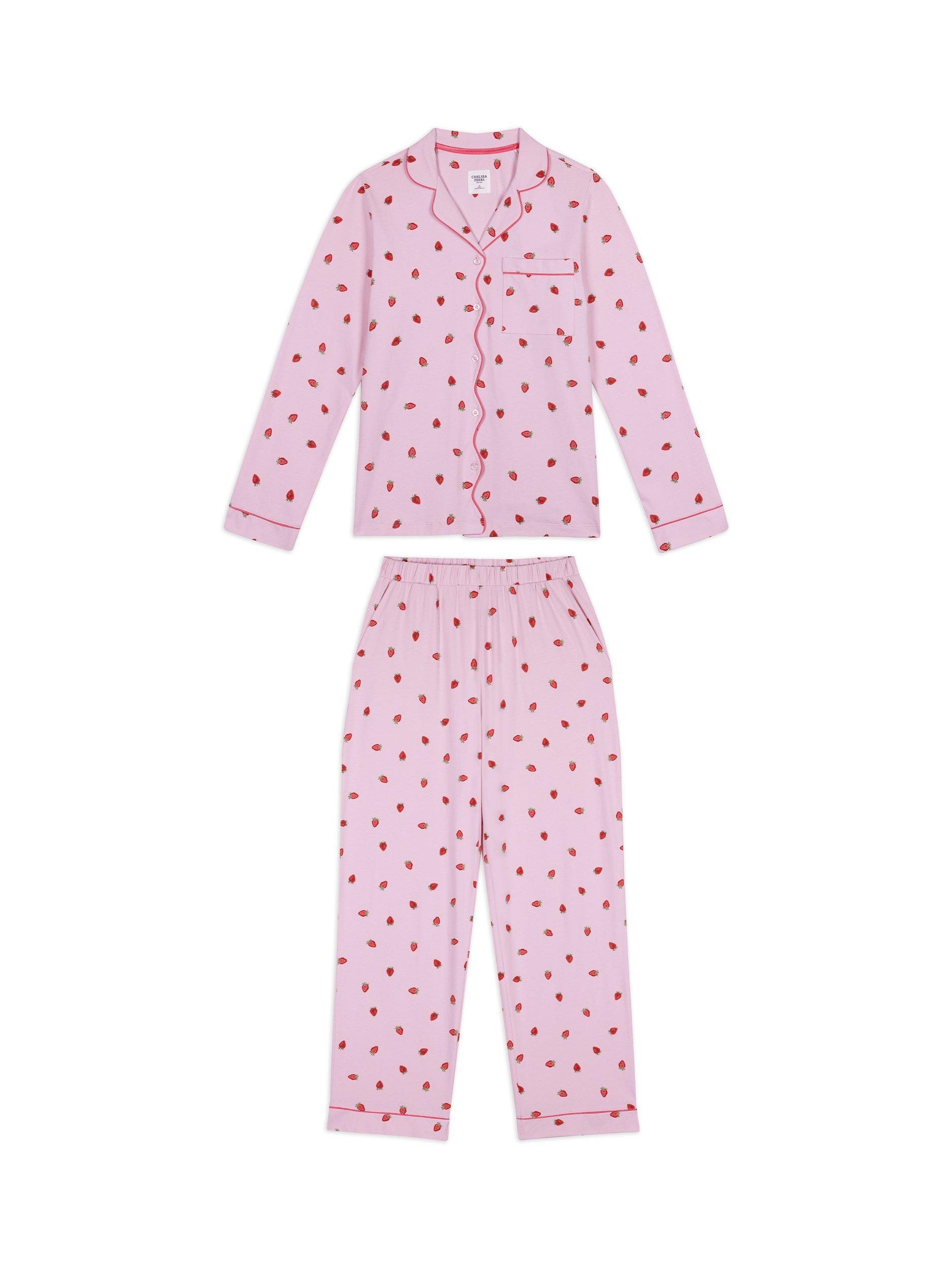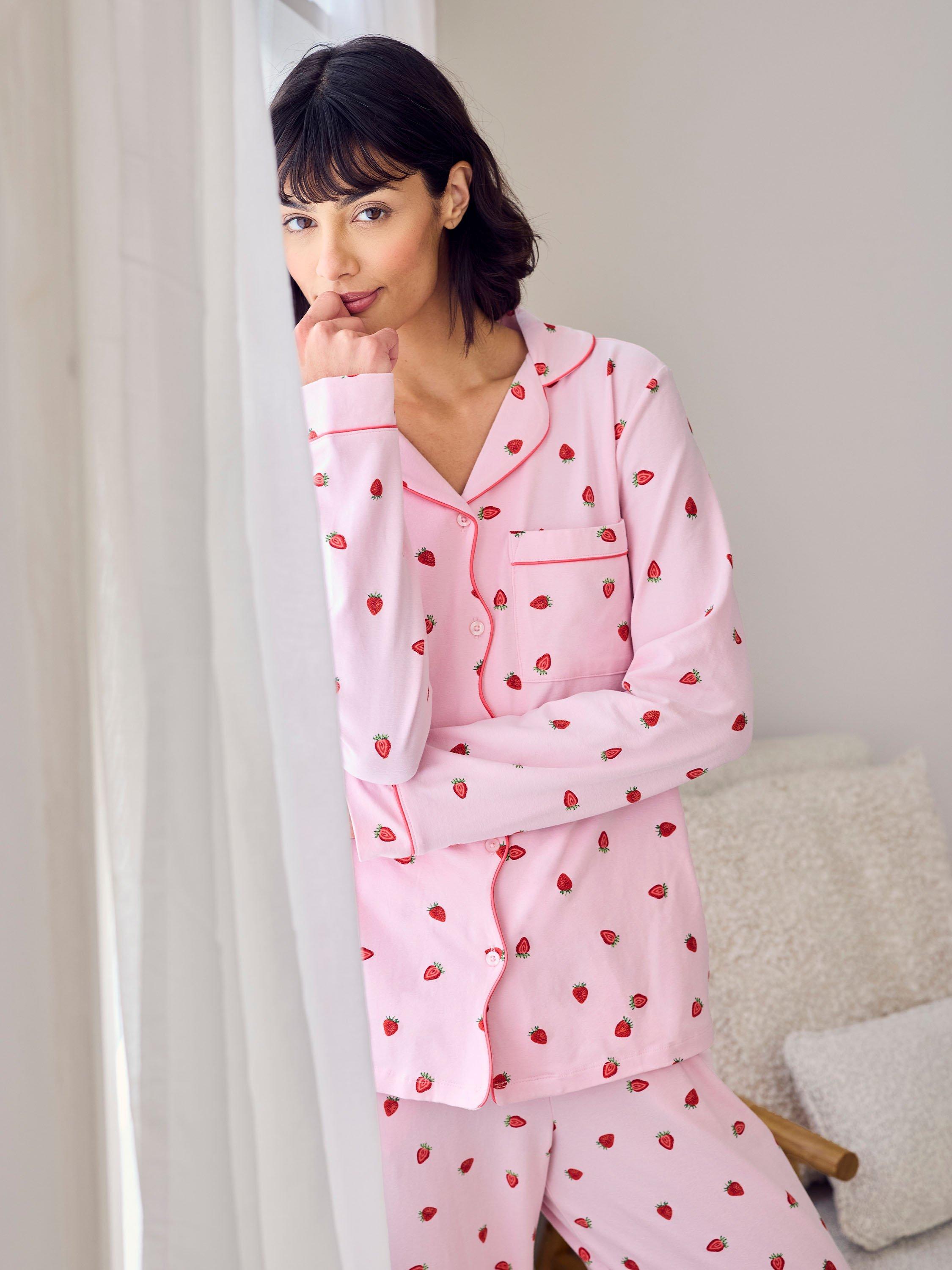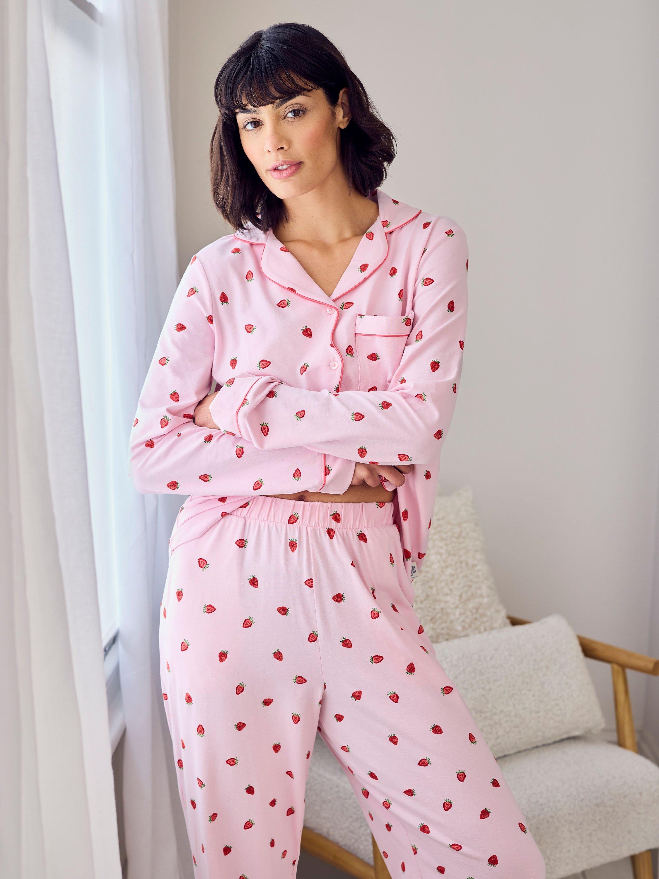Freshly picked for your wind-down. This long pyjama set is made from soft cotton jersey and printed with hand-drawn strawberries for a sweet, summery feel. The revere collar shirt is trimmed with tonal piping and a delicate scalloped placket, while the relaxed bottoms feature an elasticated waist and side pockets for everyday ease.
