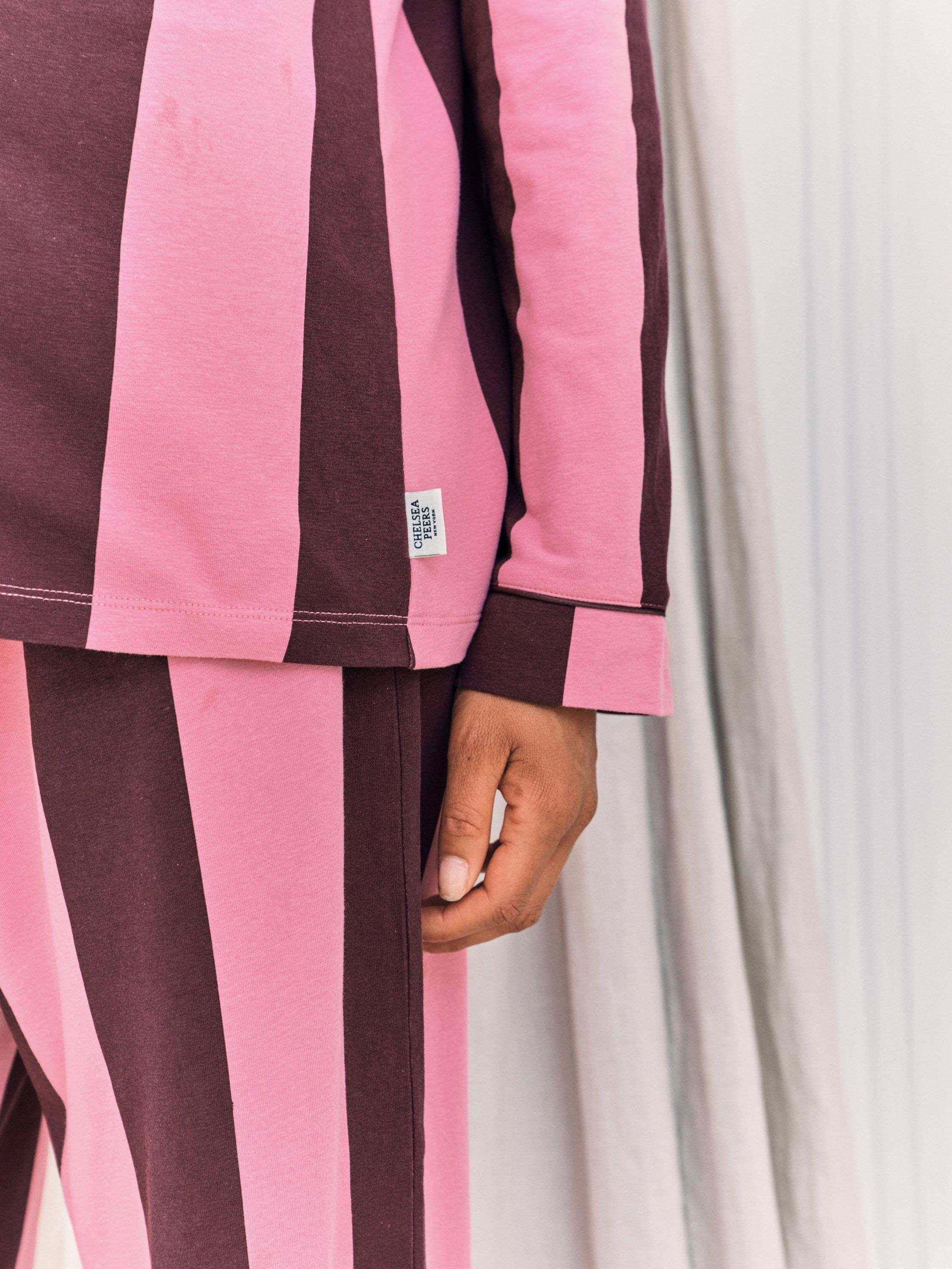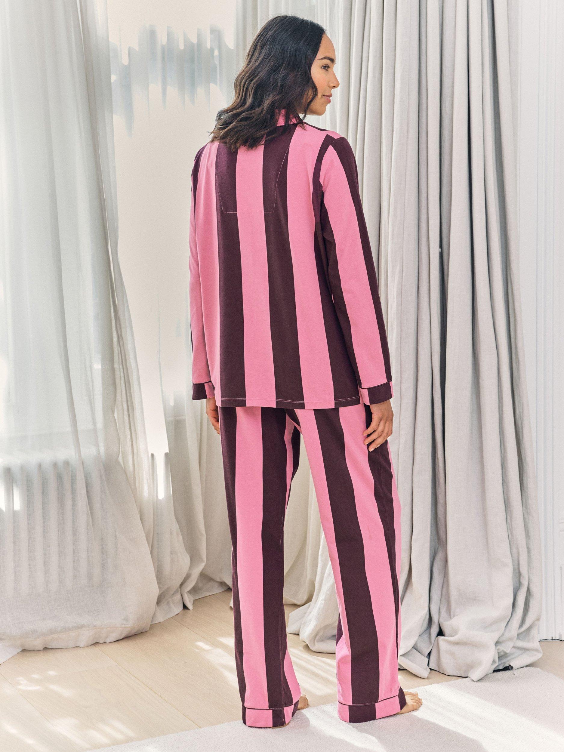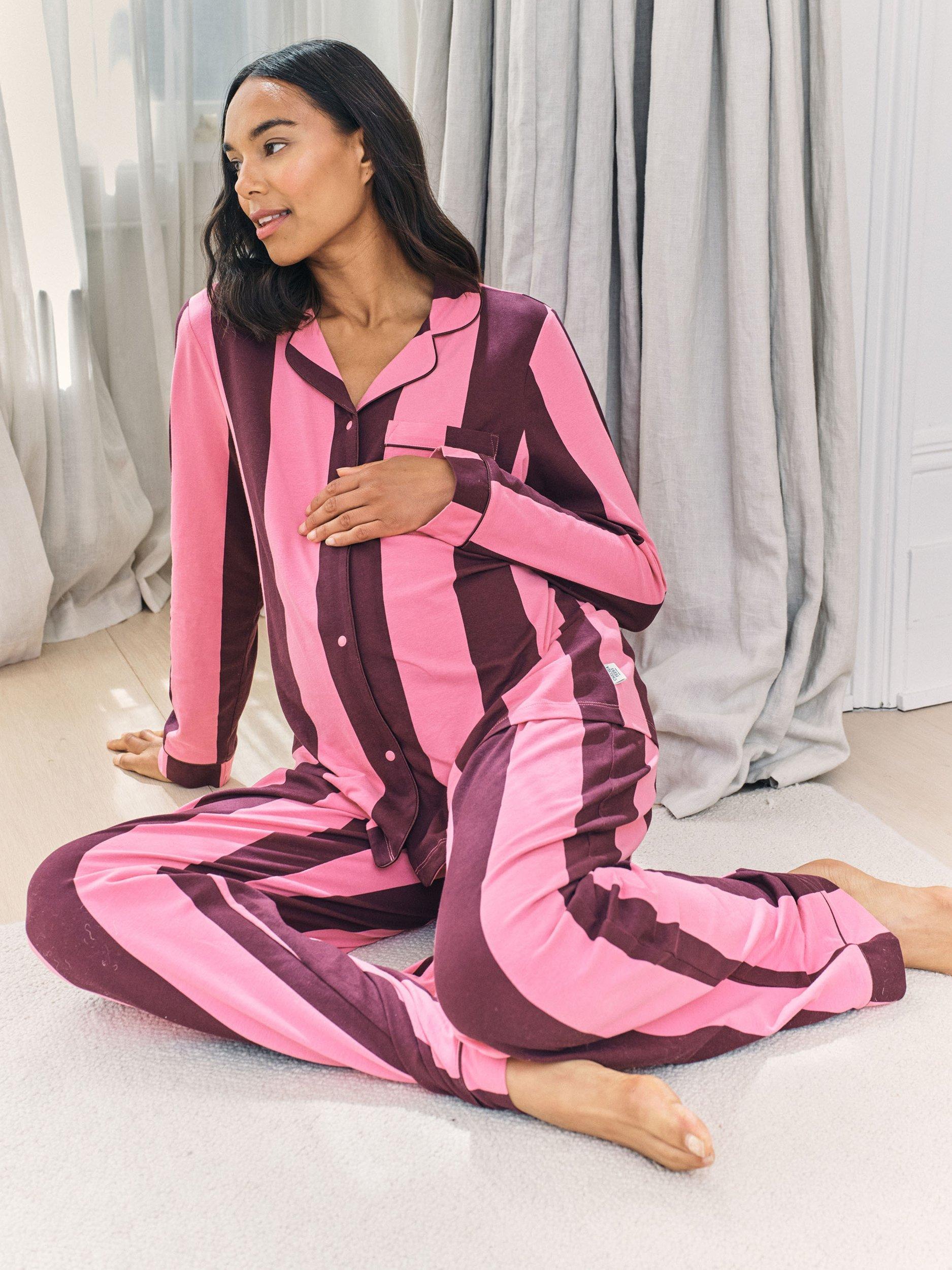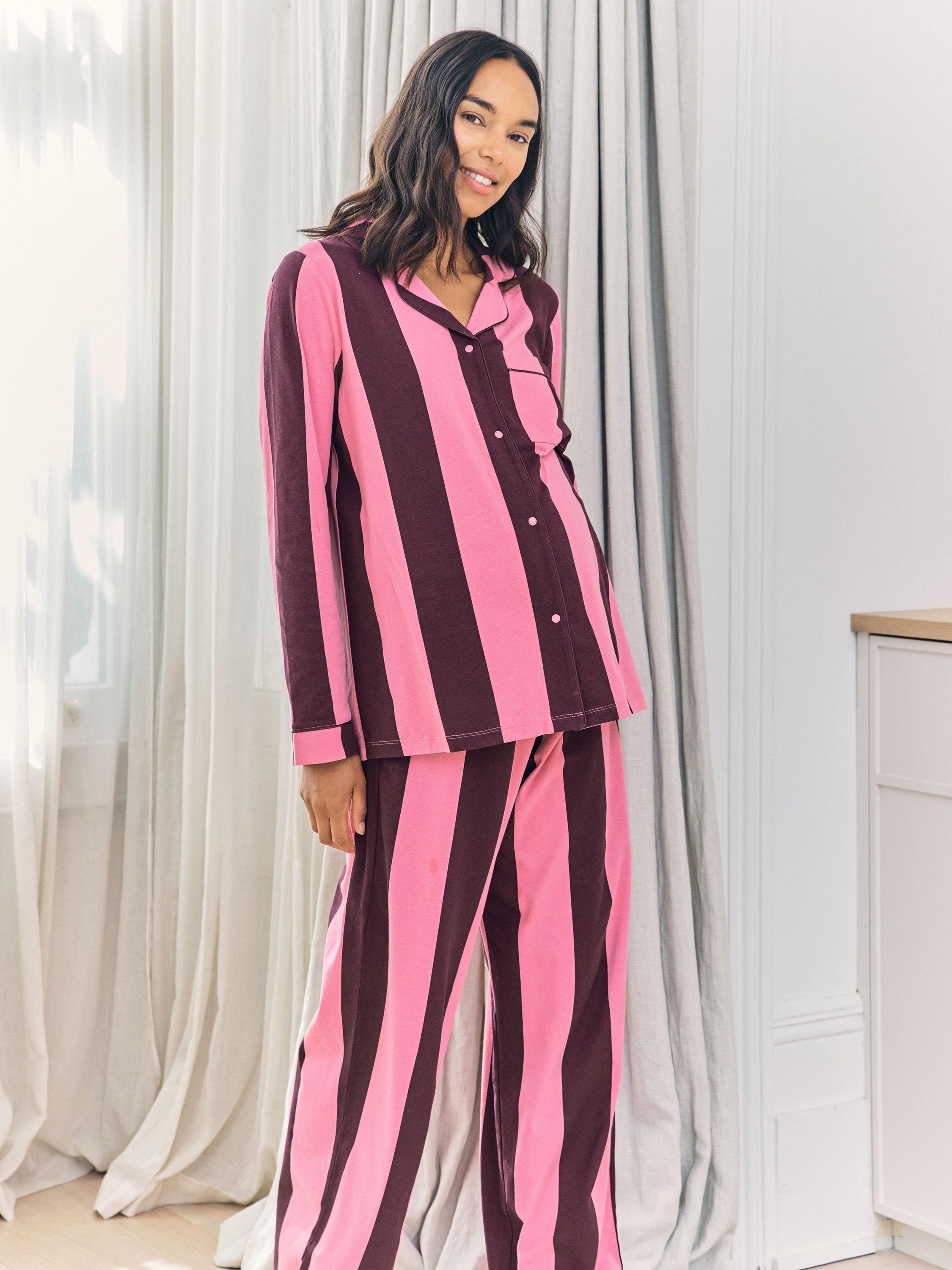 Designed for comfort at every stage of your pregnancy, this maternity pyjama set is crafted from 95% cotton with a soft, breathable finish. The revere collar shirt is elevated with bold piping and easy popper fastenings, making nursing simple when needed. The matching full-length bottoms feature a stretch jersey over-bump band for gentle support and a flexible fit through pregnancy and beyond. In striking bright stripes, this set brings a bold, playful energy to a timeless silhouette. Made for pregnancy, loved long after.