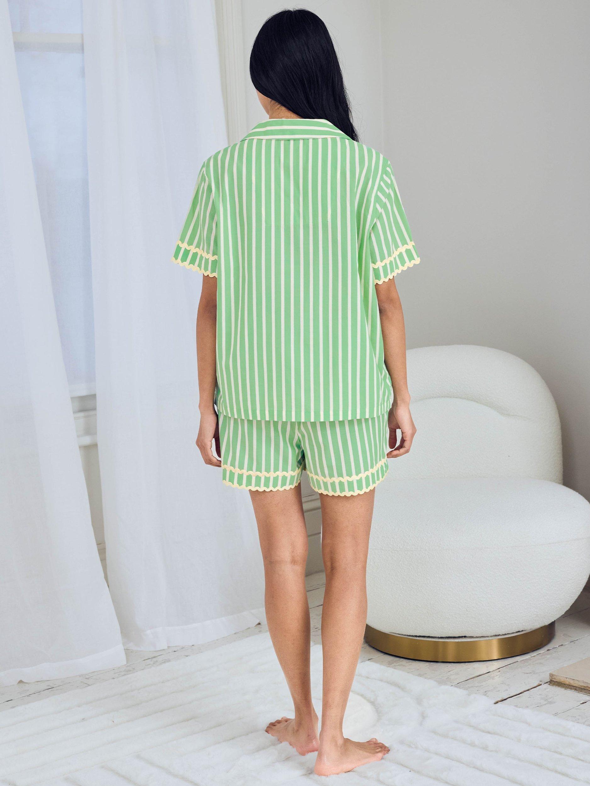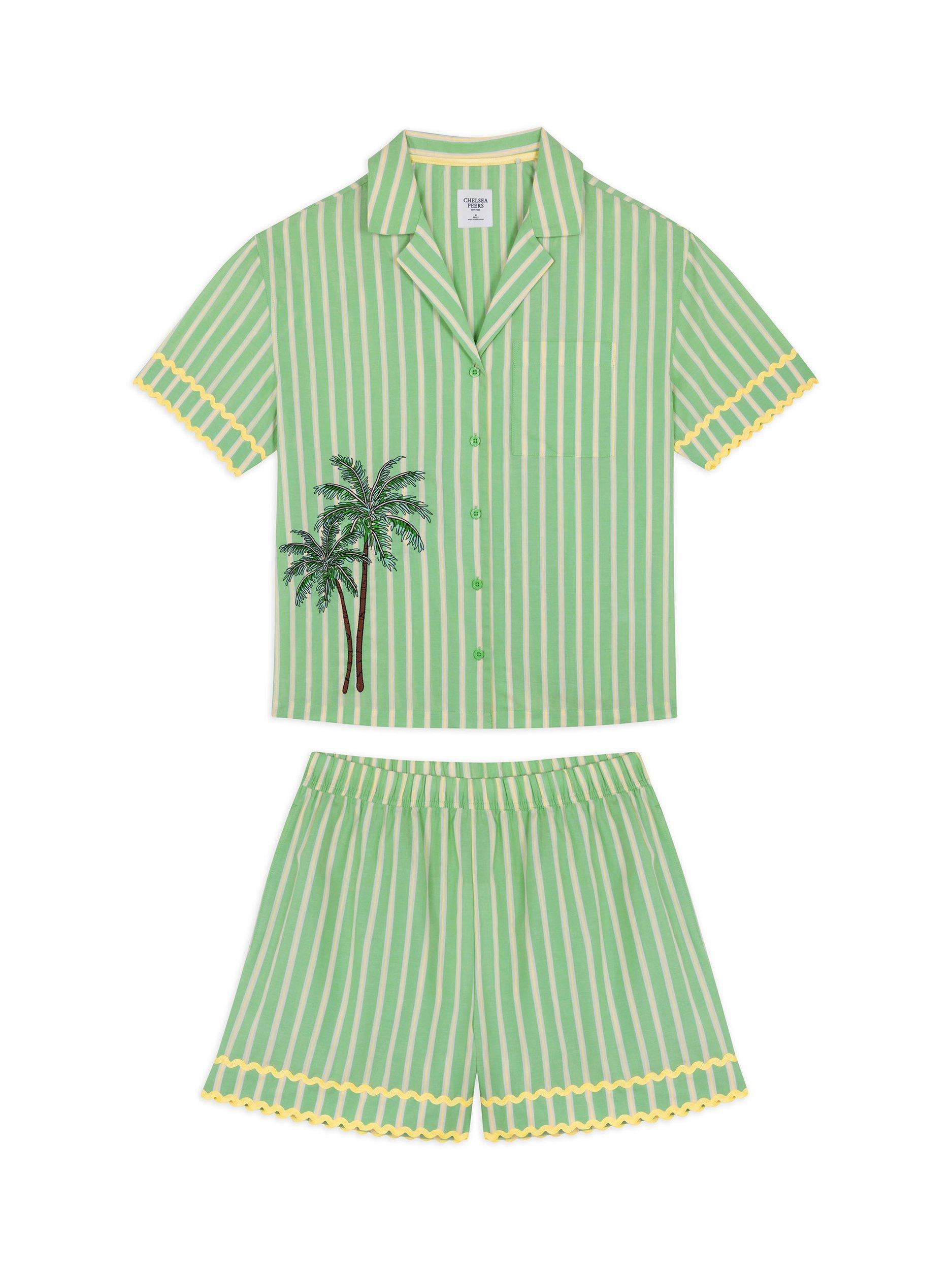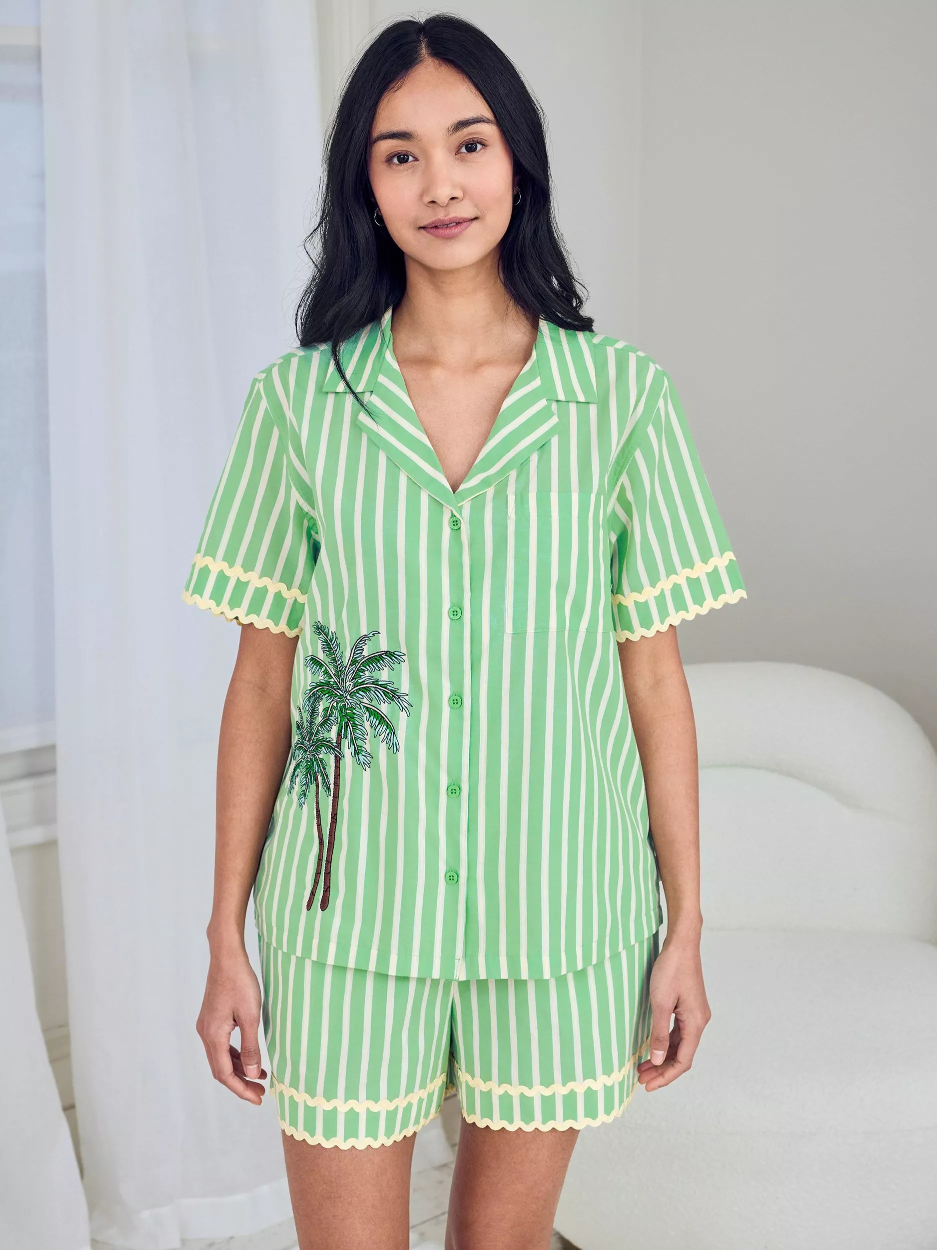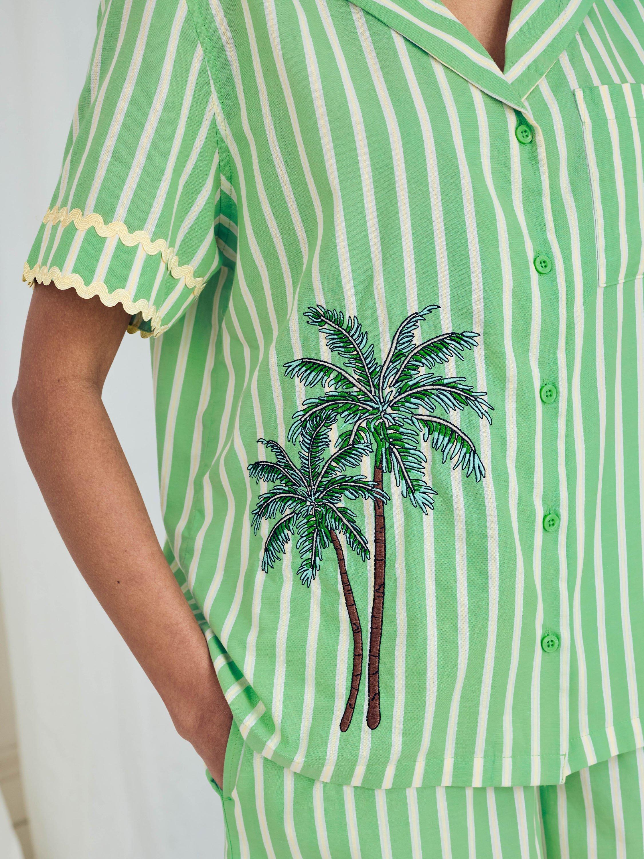 Stripes, sunshine, and a little embroidered charm. This short pyjama set is made from breathable cotton for a crisp, lightweight feel. The print pairs vertical stripes with contrast scalloped trims, while an embroidered palm tree adds a playful detail to the top. With a relaxed button-up shirt and elasticated shorts, it's a fresh take on summer lounging, perfect for warm nights, sunny mornings or breezy getaways.