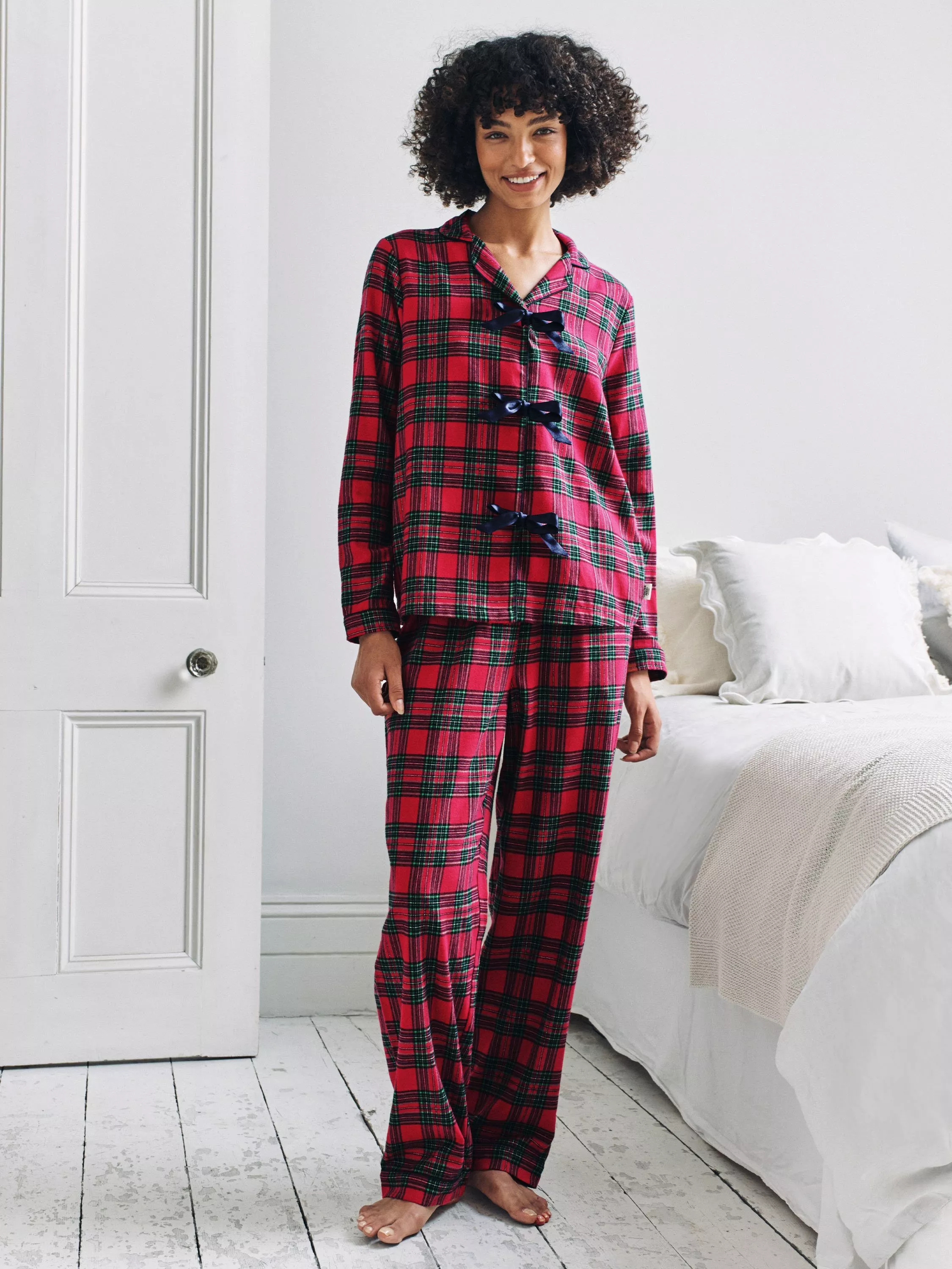 Timeless, festive and a little bit luxe, these brushed cotton flannel pyjamas are woven in classic =tartan with a delicate metallic thread. The revere collar shirt is tied with ribbon bows instead of buttons, adding a special seasonal detail that feels giftable and glamorous. Crafted from 99% cotton with elasticated, pocketed bottoms, they’re designed to be as comfortable as they are charming. A Christmas classic you’ll bring out year after year.