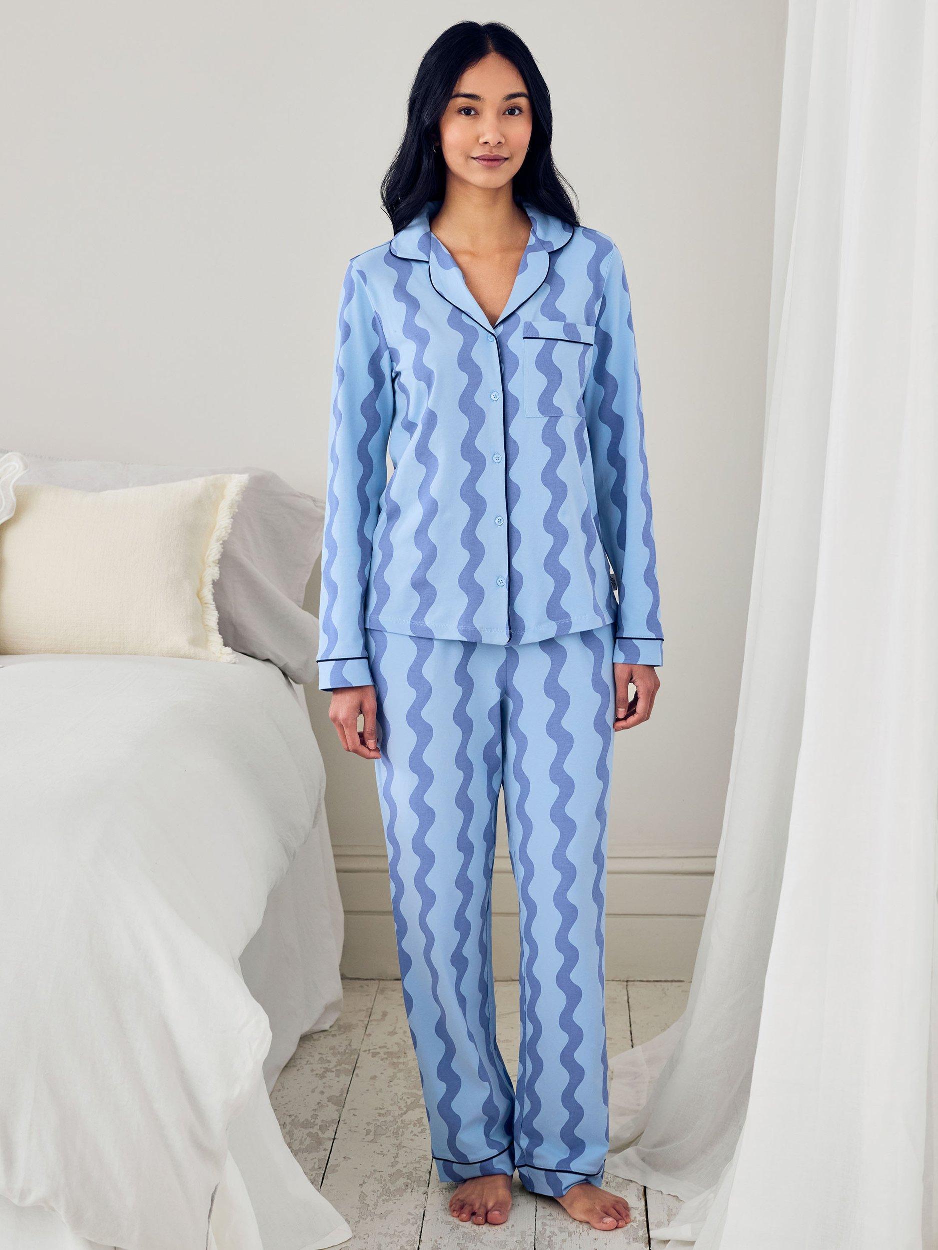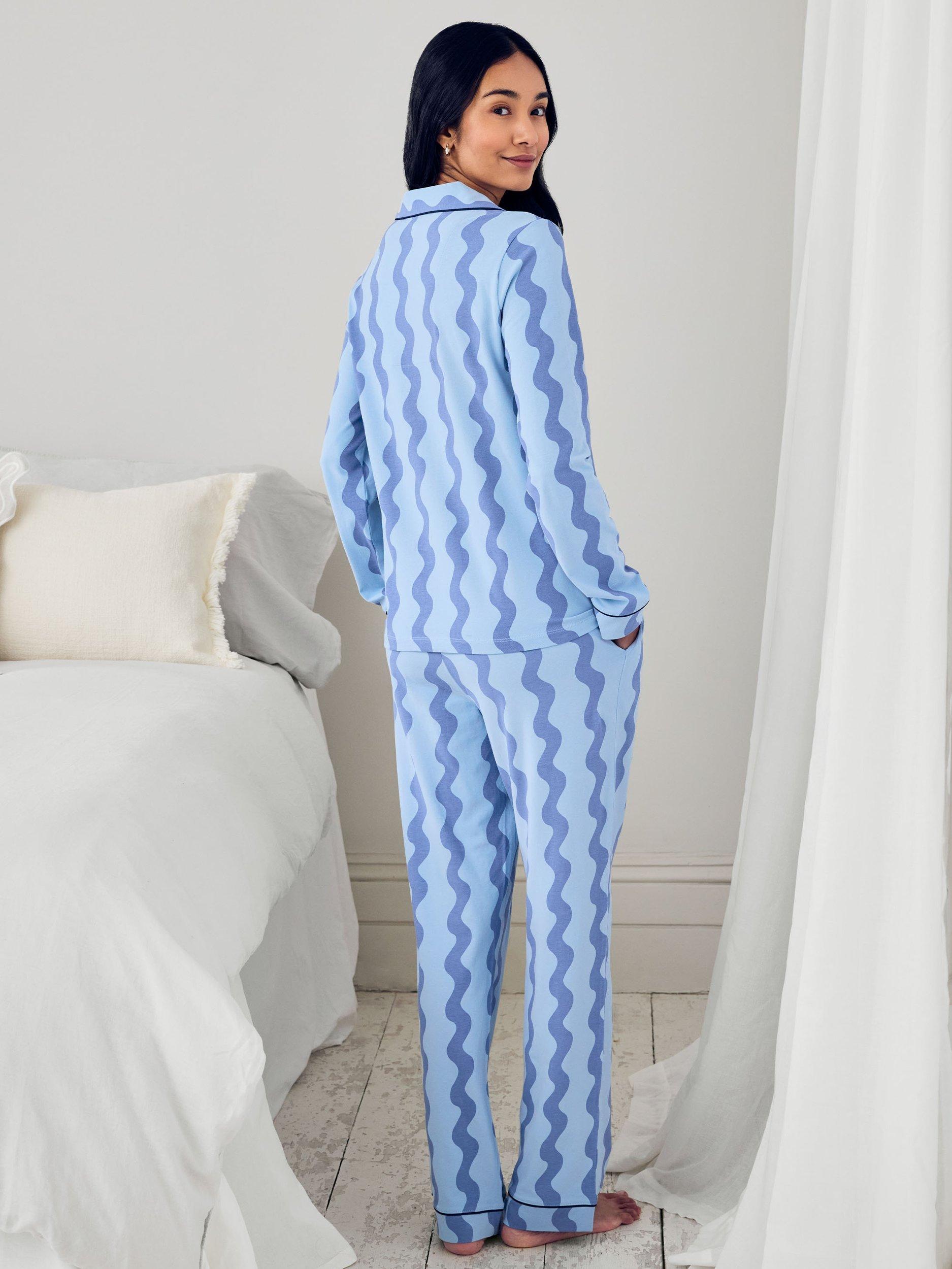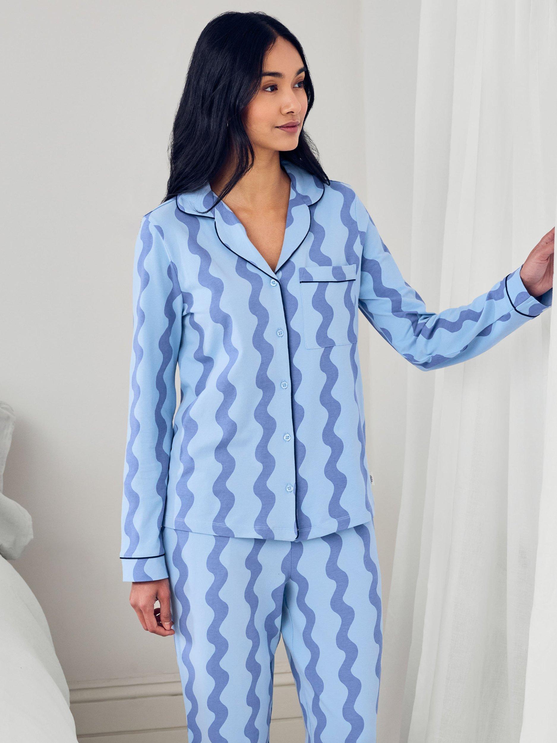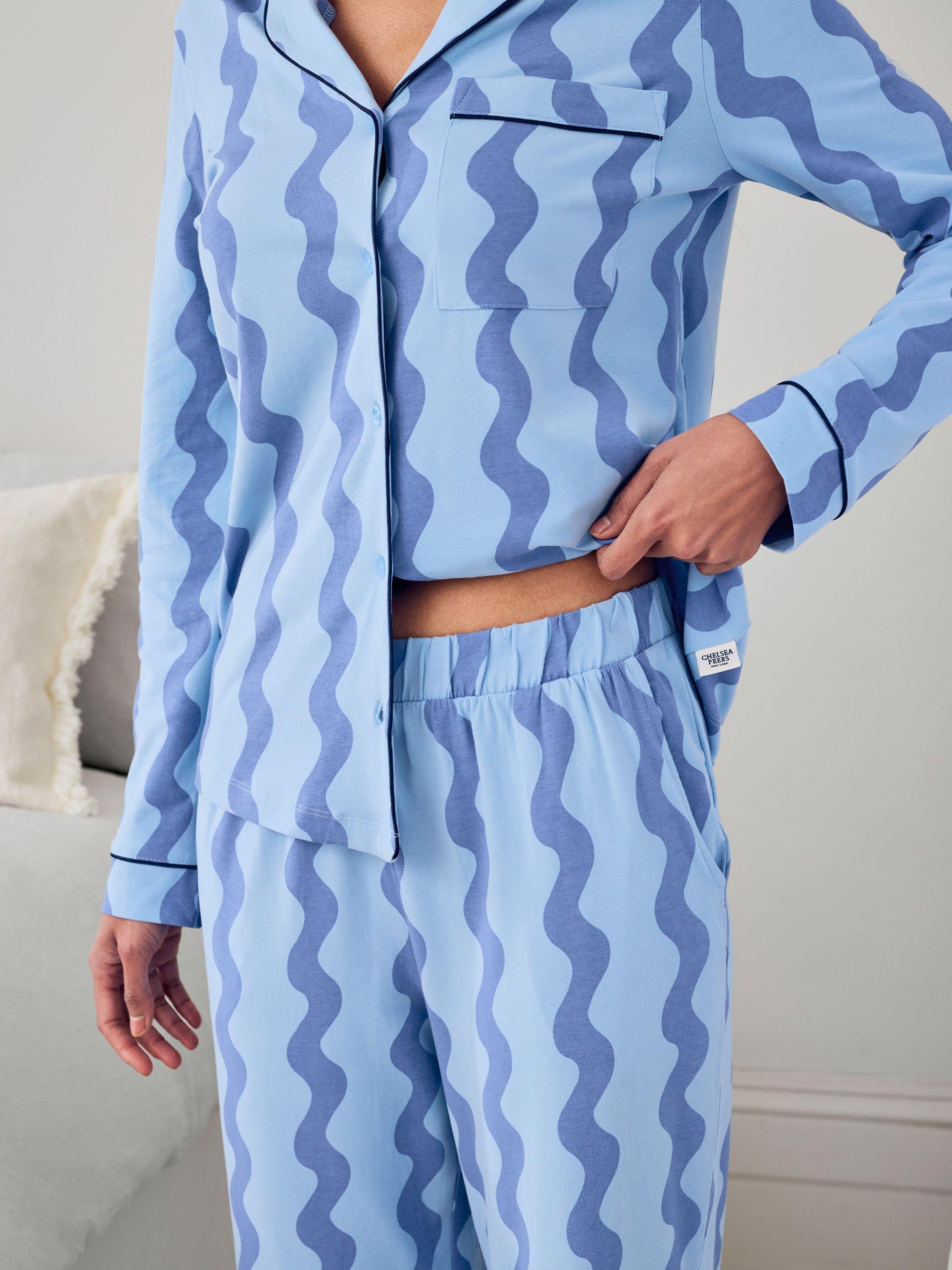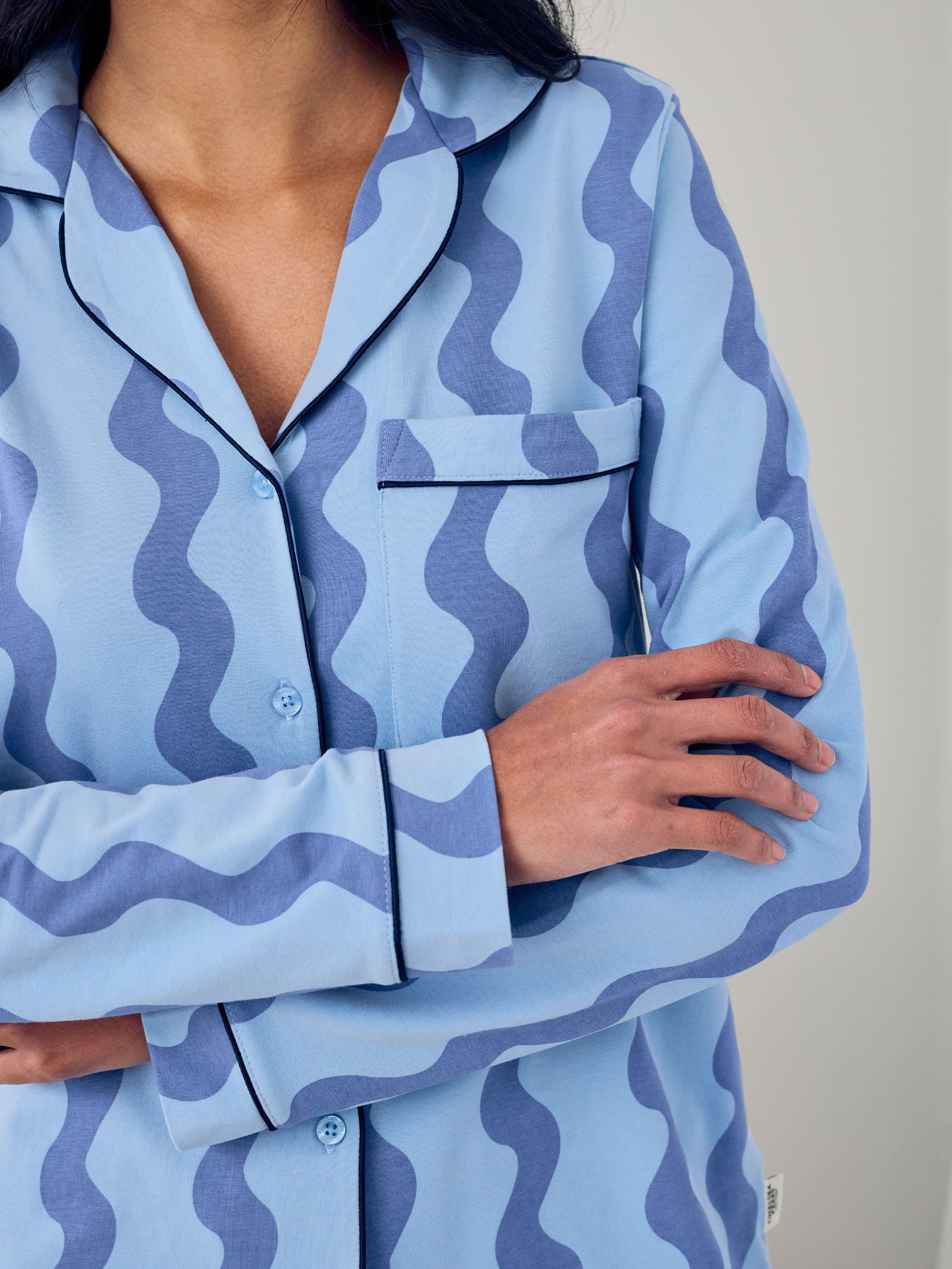 Printed with soft, undulating lines, this classic two-piece is all about feel-good comfort and laid-back charm. Crafted from 95% cotton with a touch of stretch, the fabric feels soft, breathable, and beautifully lightweight-perfect for every season of lounging. Featuring a long-sleeved button-up top with piped trims and a chest pocket, plus matching relaxed-fit trousers with an easy elasticated waist.