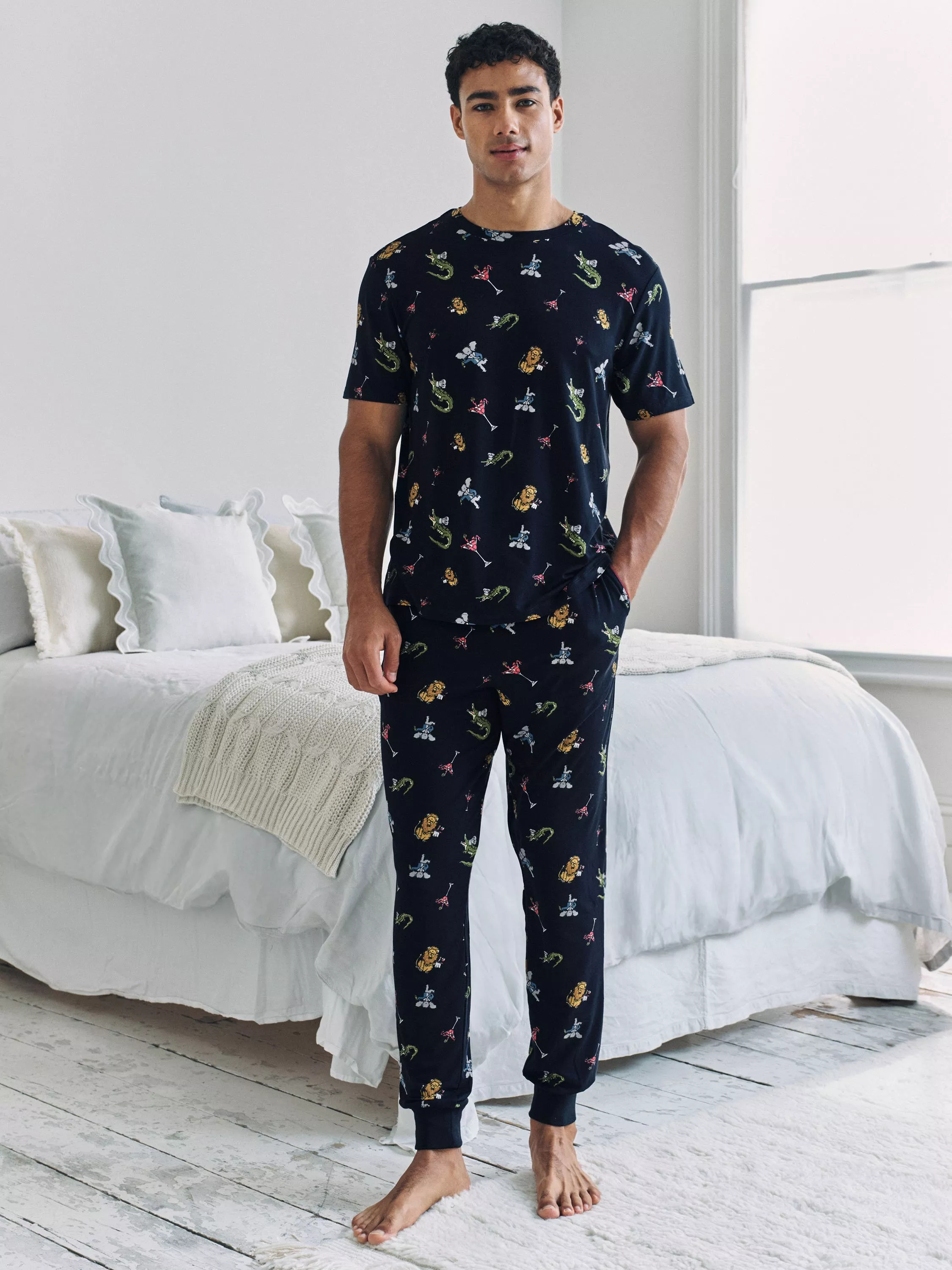 Made from super-soft jersey with 95% recycled fibres, these easy-to-wear pjs feature Chelsea Peers' hand-drawn Wild Dining print, where a crocodile rules the kitchen, an elephant sommelier serves with flair, and a lion waiter brings the charm. Oh, and the lobster? Lounging in a cocktail glass like it owns the place.