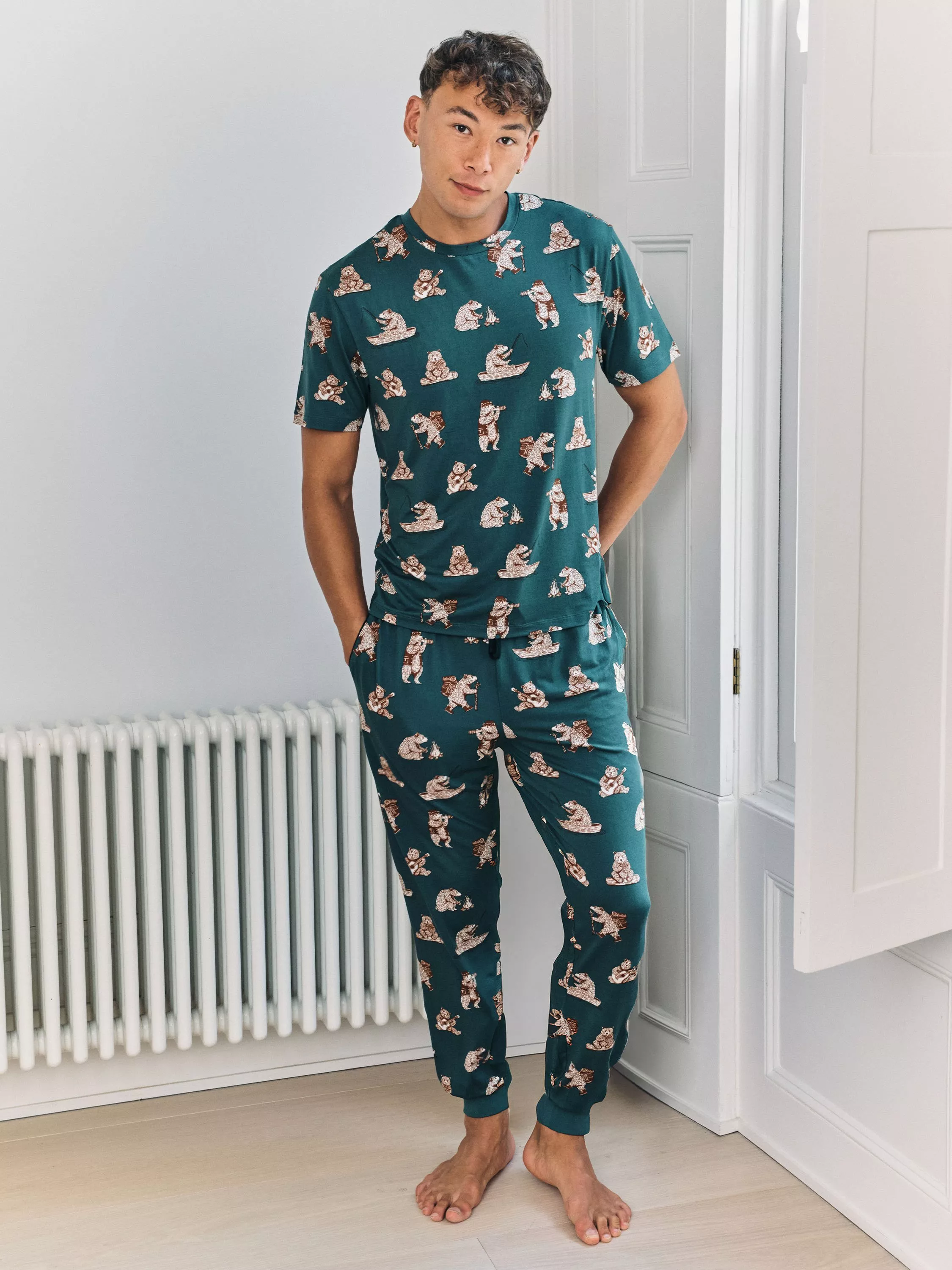 Adventure meets downtime style in this pyjama set. It features hand-drawn bears hiking, fishing and enjoying the great outdoors. The soft jersey fabric, elasticated drawstring waist and cuffed hems also keep things super comfortable.