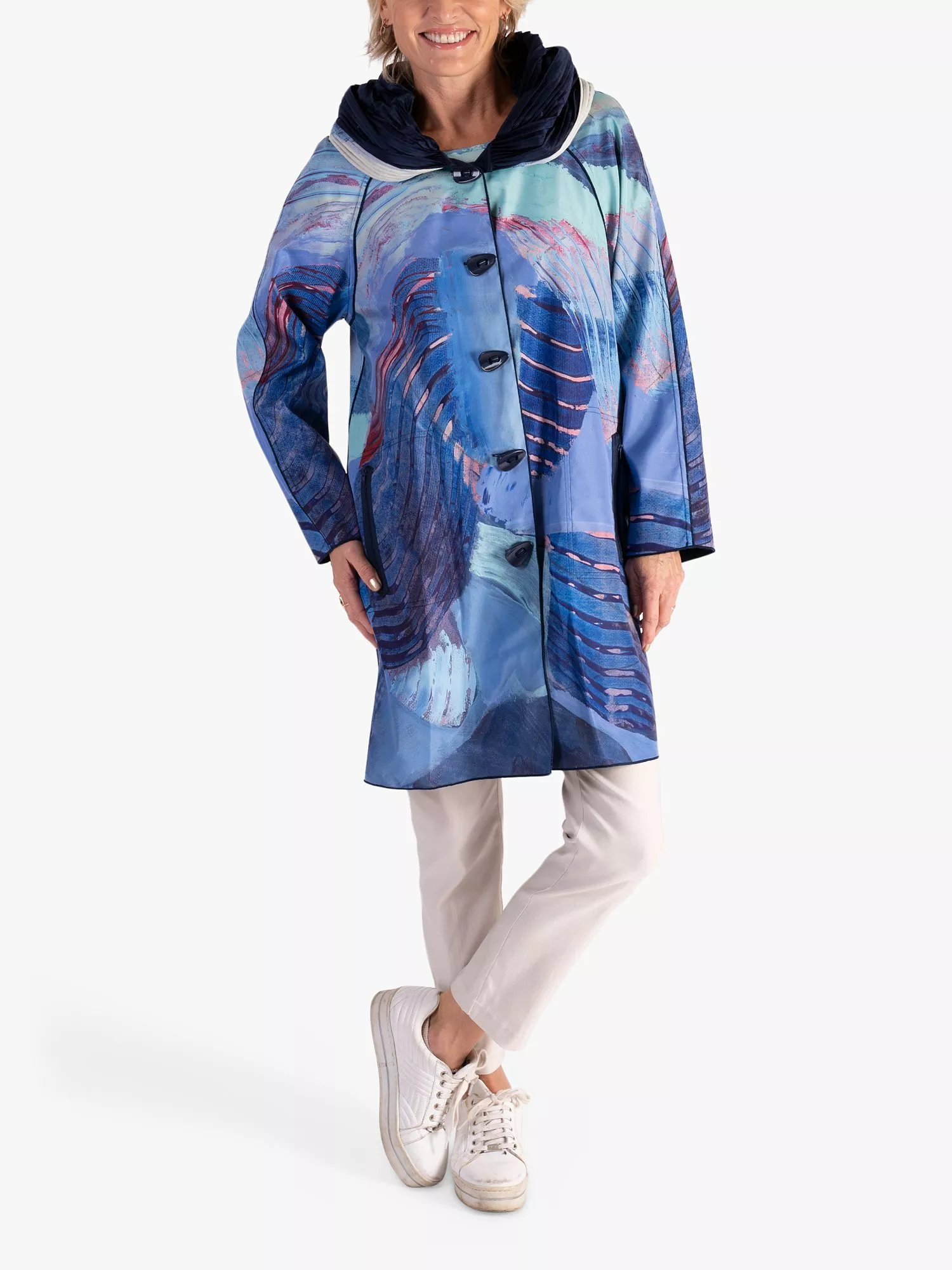 A practical option with its built-in hood and with an intricate abstract print, it is made from durable fabric with frequent use in mindso slip it on and make this season yours.