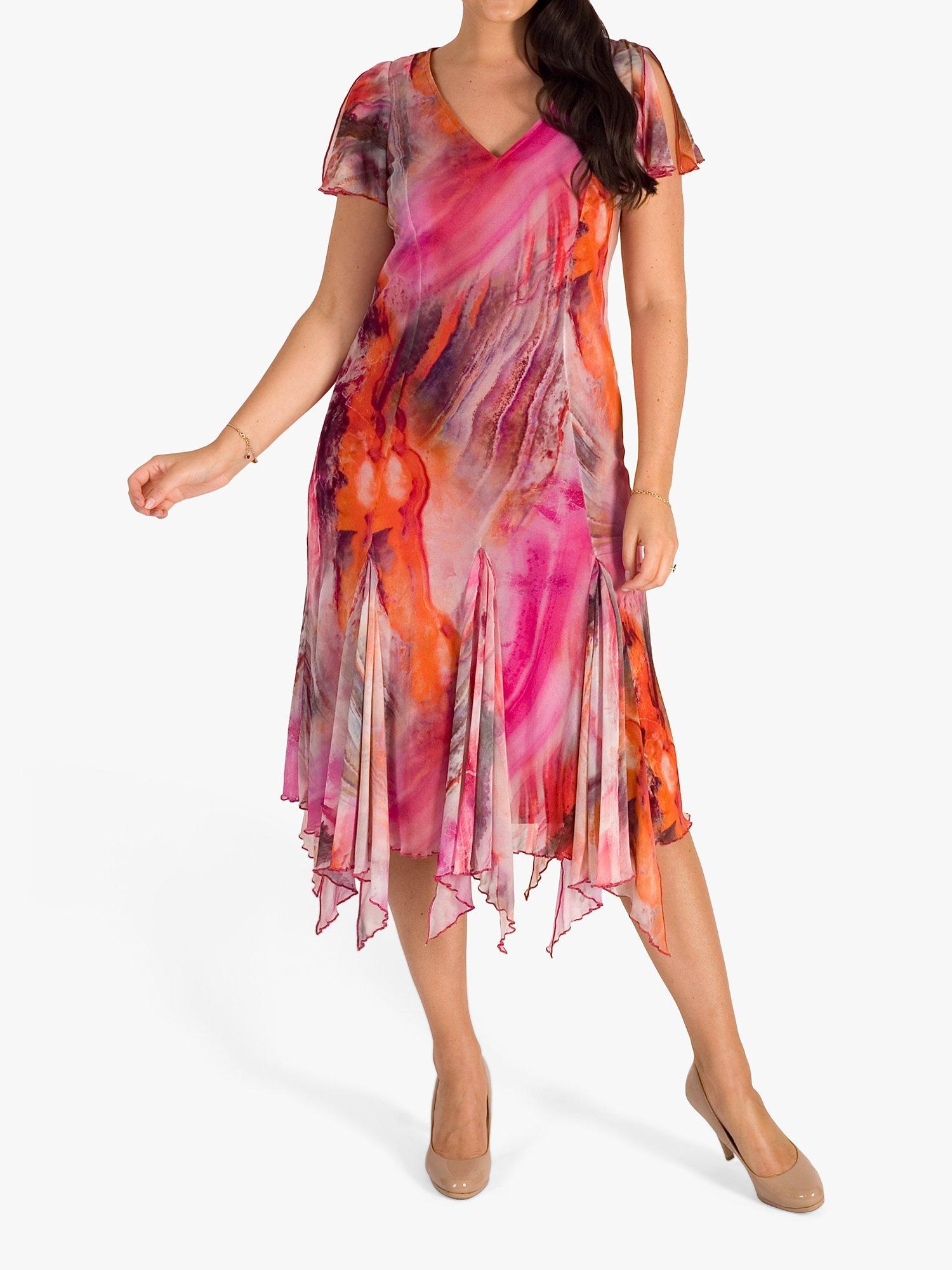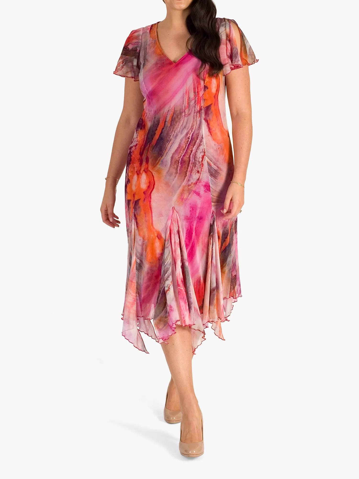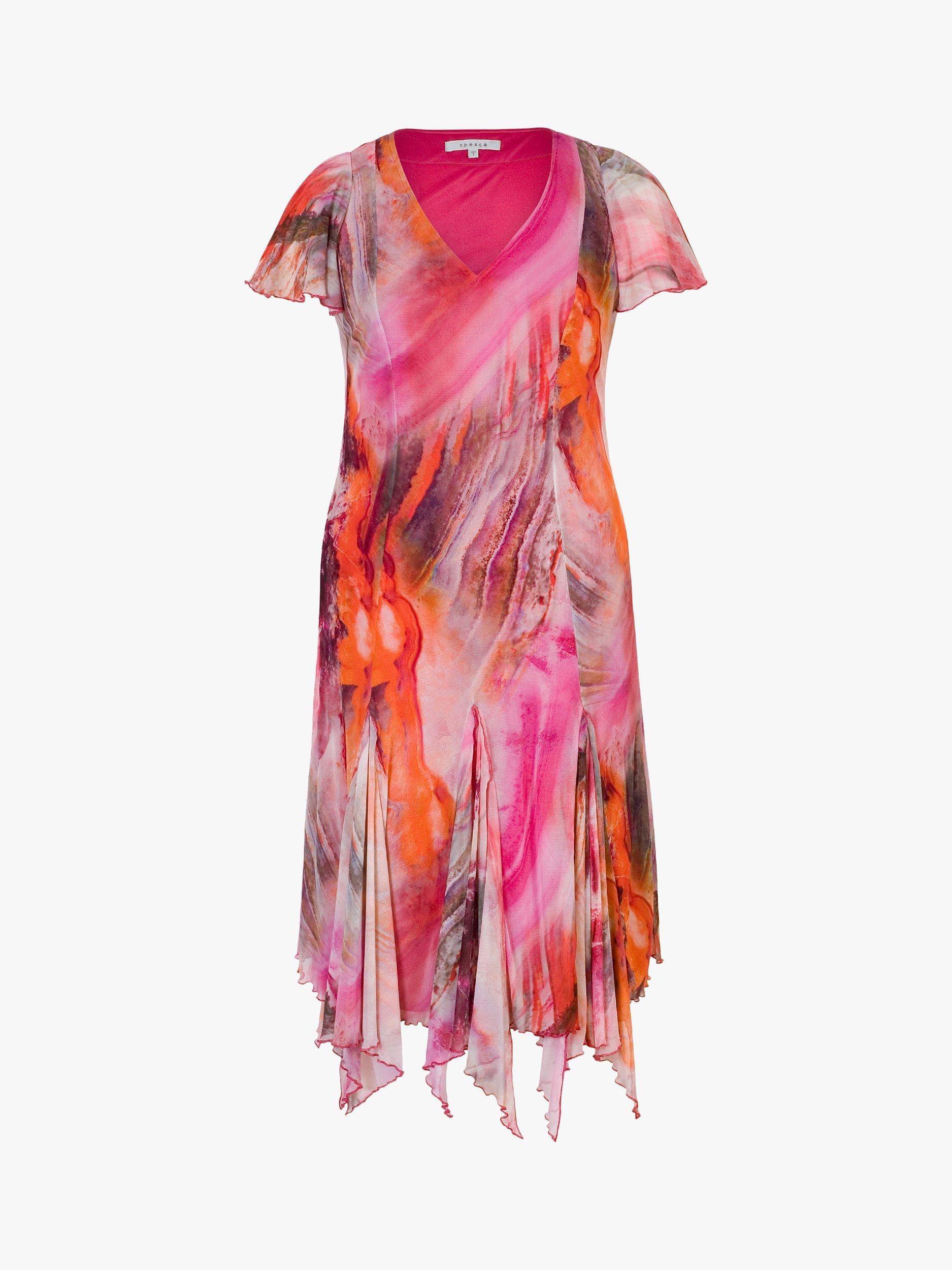 Vibrant tones of pinks, reds, oranges and purples in a marble effect are printed onto this printed mesh dress from chesca. With a v-neck and soft fluted short sleeves, this dress is lined in pink jersey for added comfort. A full godet skirt with added waterfall frills and a figure-skimming body makes this dress perfect for a summer's day or dressed up for special occasions.