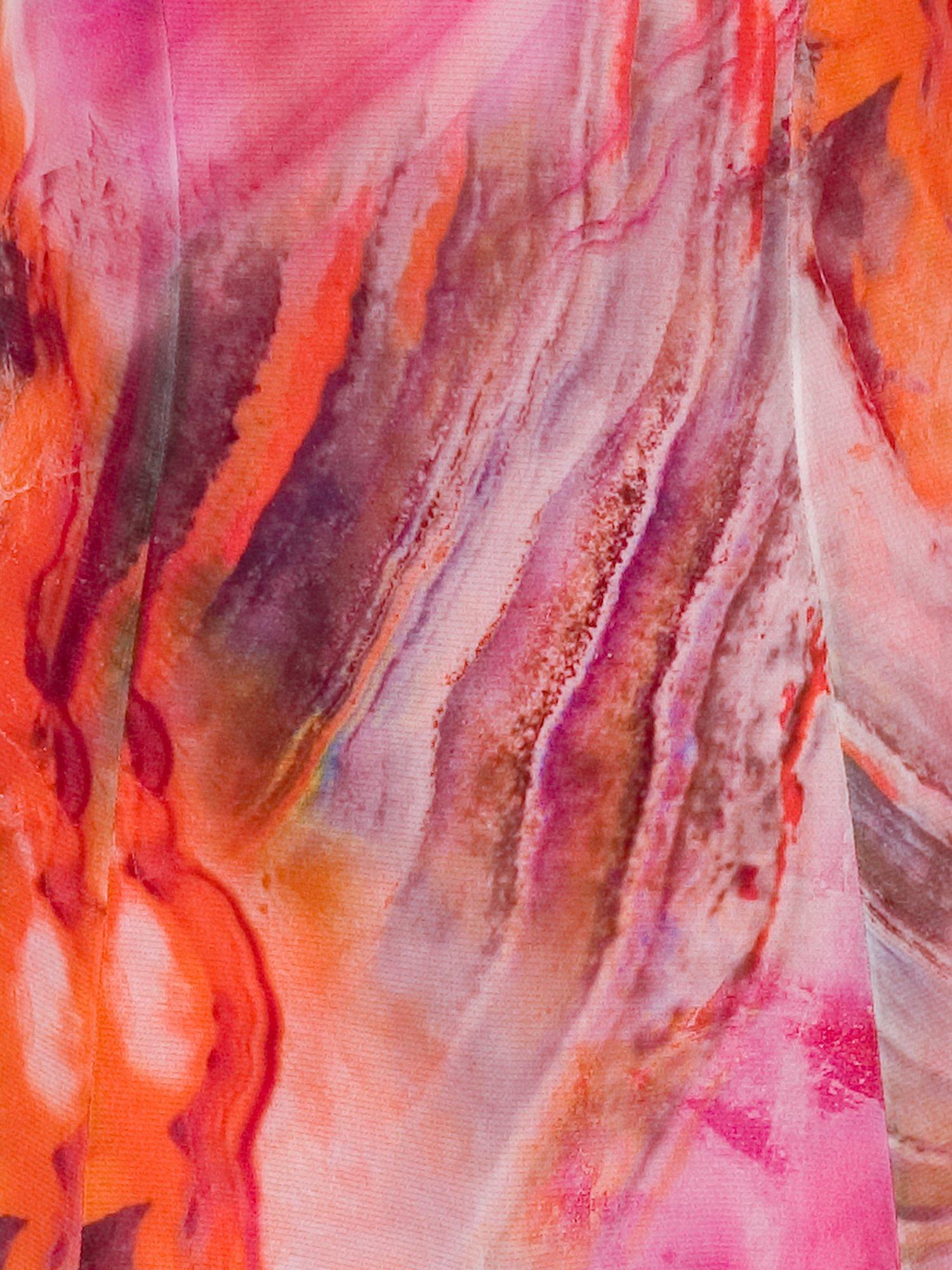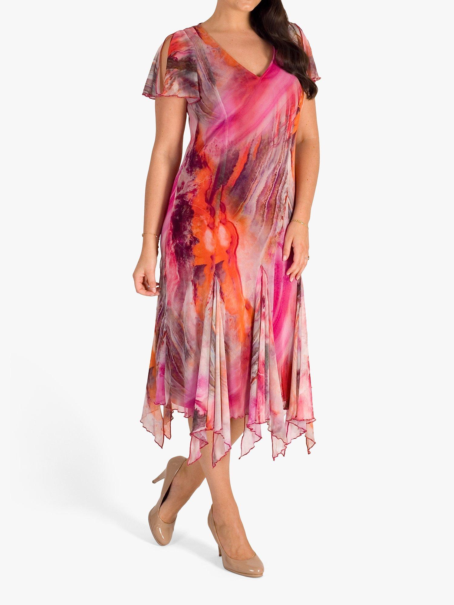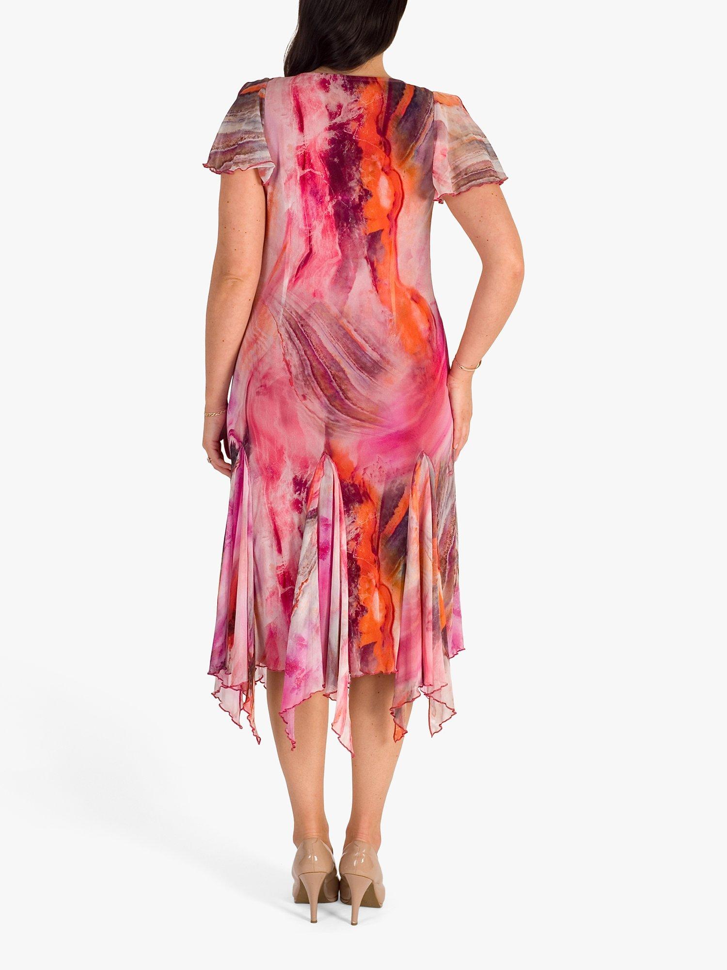 Vibrant tones of pinks, reds, oranges and purples in a marble effect are printed onto this printed mesh dress from chesca. With a v-neck and soft fluted short sleeves, this dress is lined in pink jersey for added comfort. A full godet skirt with added waterfall frills and a figure-skimming body makes this dress perfect for a summer's day or dressed up for special occasions.