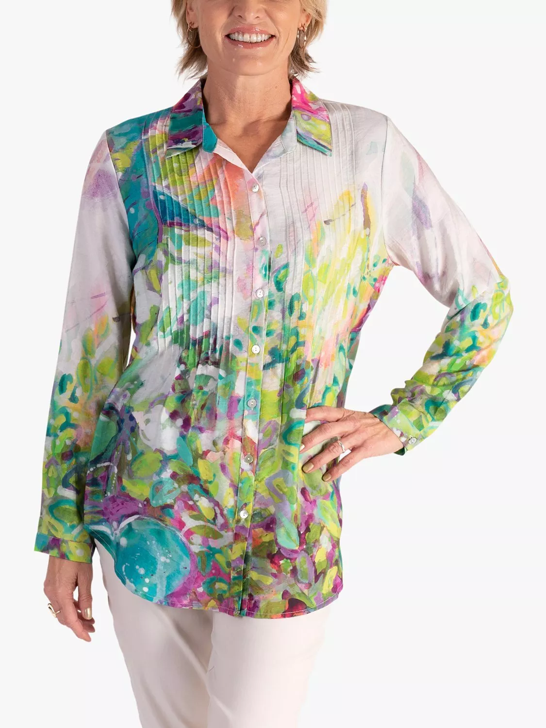 Updating your collection, this shirt by chesca makes an impact with its abstract print.