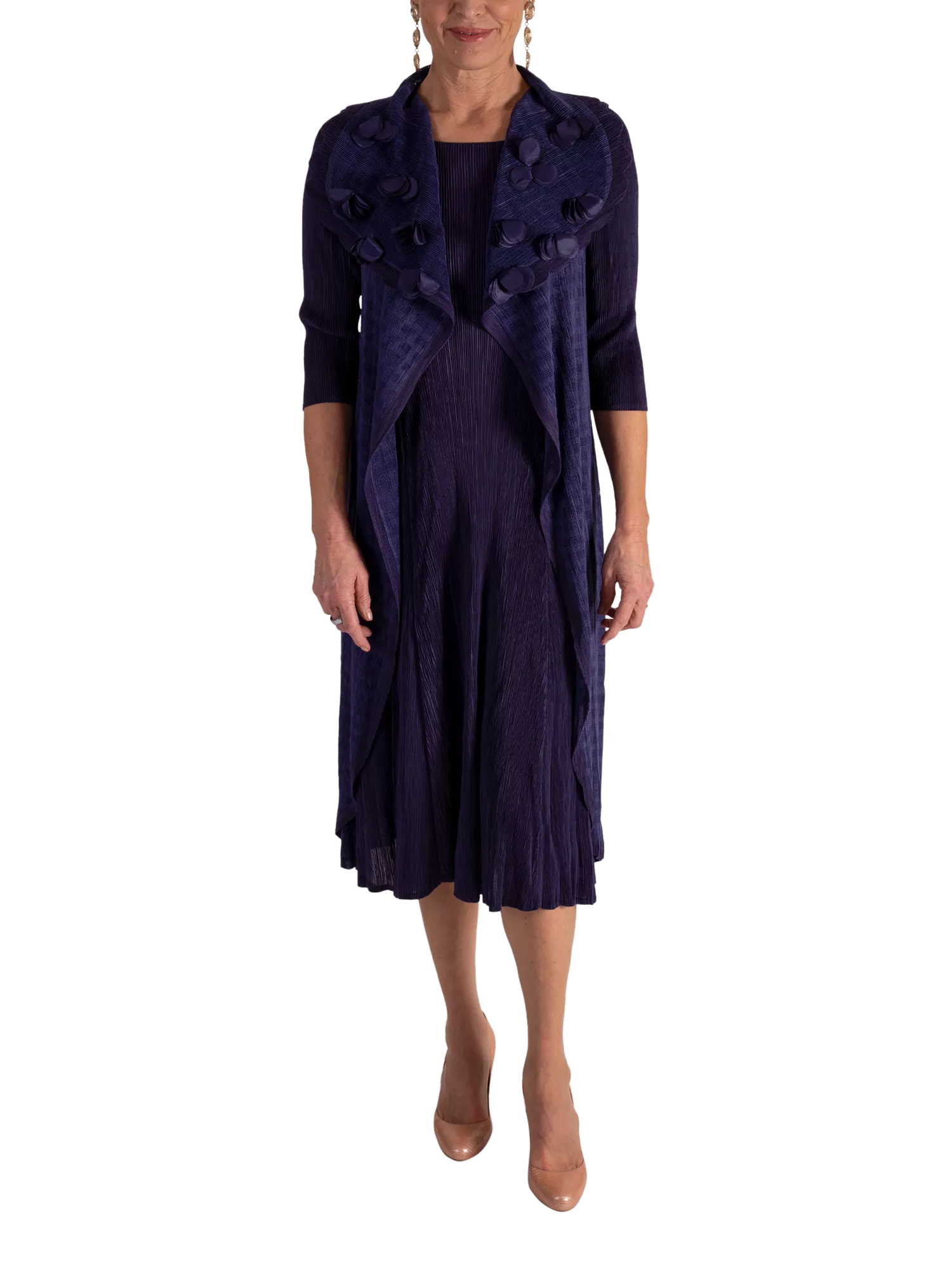 In a simple shift style, with a mock jacket overlay embellished with applique chiffon flowers, this below-the-knee length dress from chesca is easy to wear thanks to its pleated fabrication. Featuring a round neckline and three-quarter length sleeves, this style is a mother of the bride or wedding guest favourite.