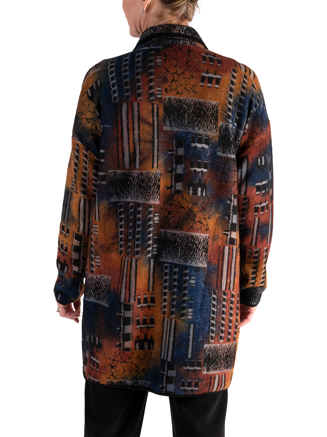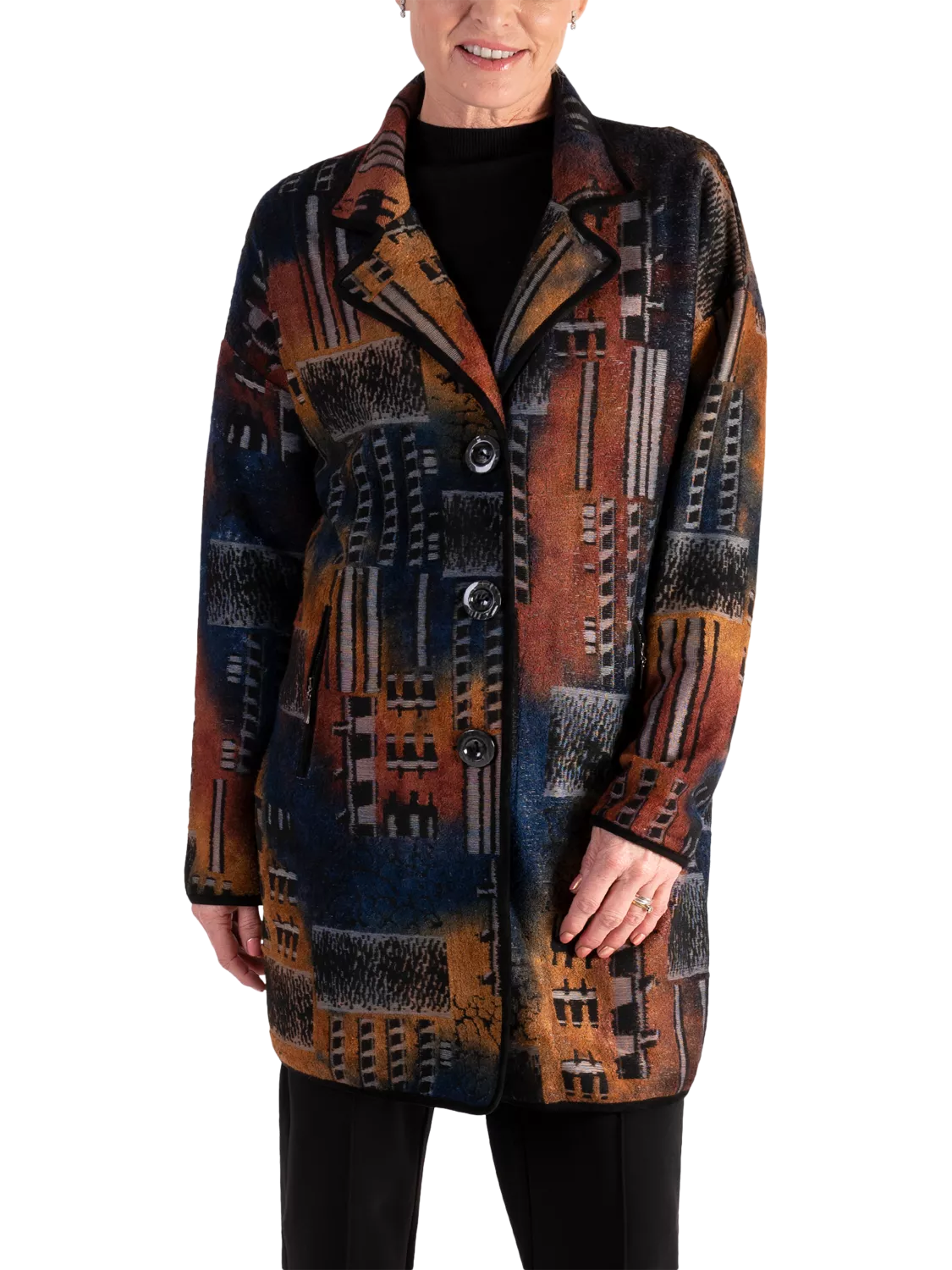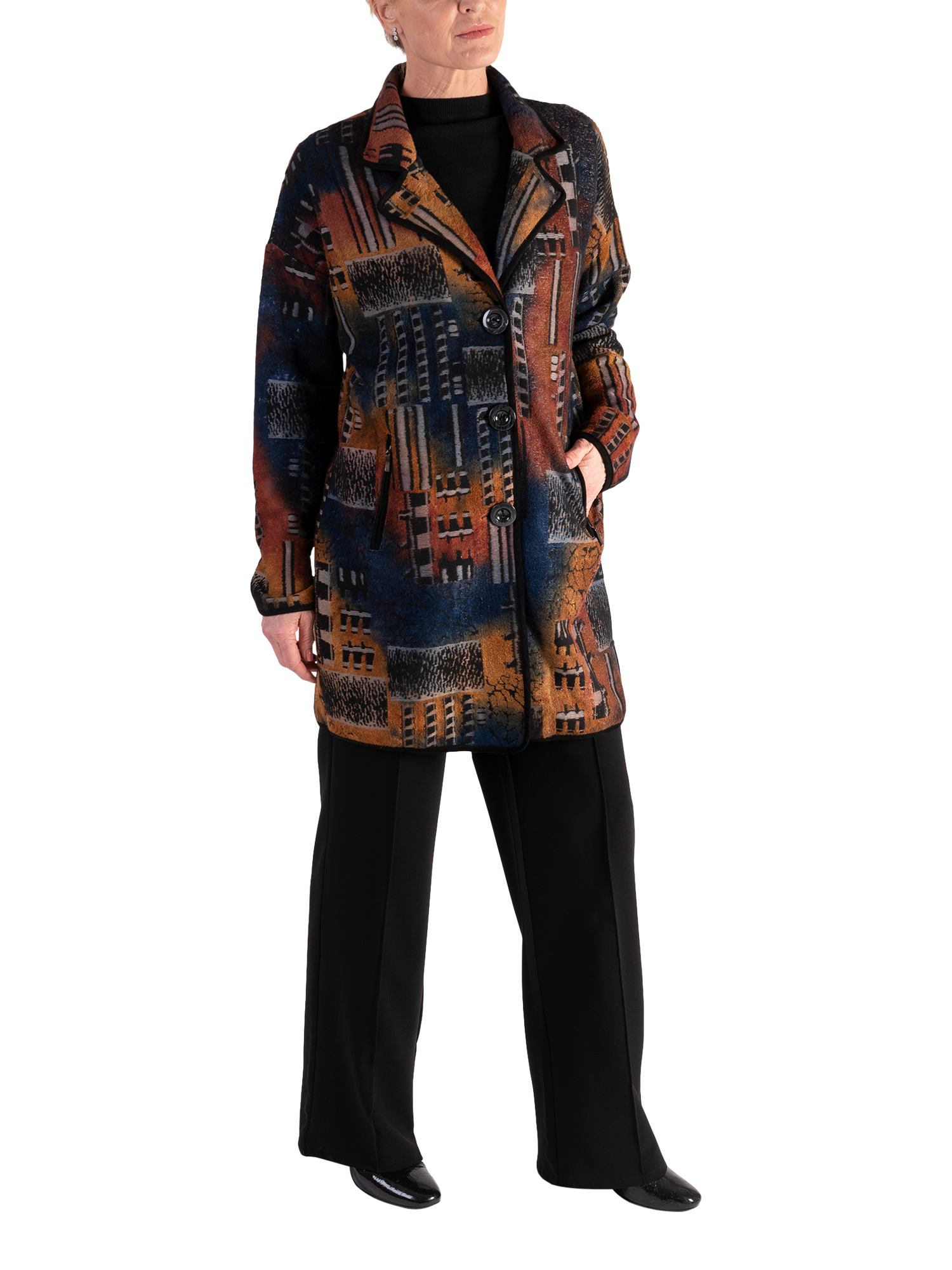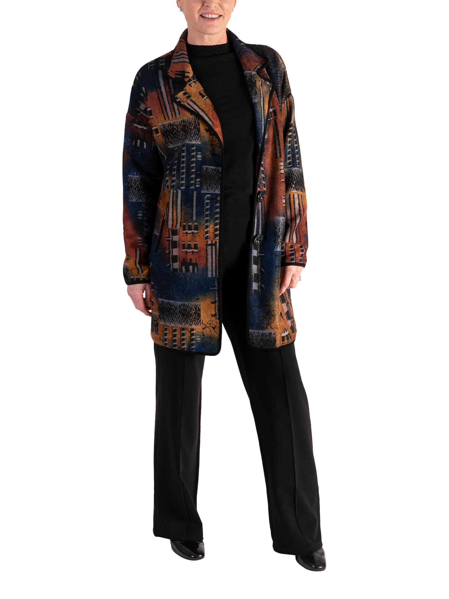 Giving your look the outerwear elevation it craves, this coat by chesca falls to a mid length. Framed with a notched lapel collar neckline and showcasing an abstract art gallery inspired print, it provides you with a functional yet stylish choice that'll protect you from the elements too. Complete with two zipped pockets, black edging detail and dropped shoulder seams, this textured finish coat balances just as well with daytime separates as it does with eveningwear