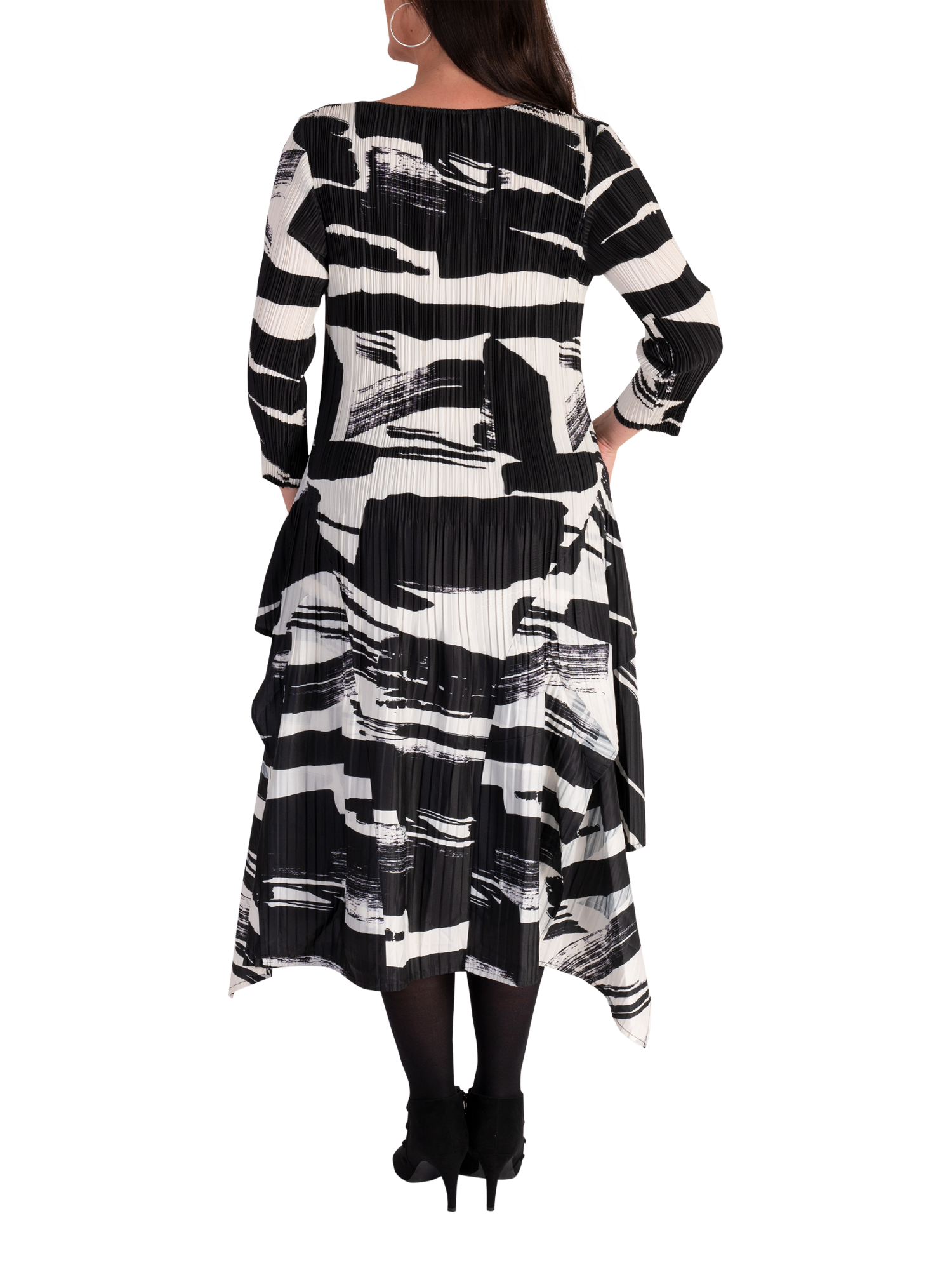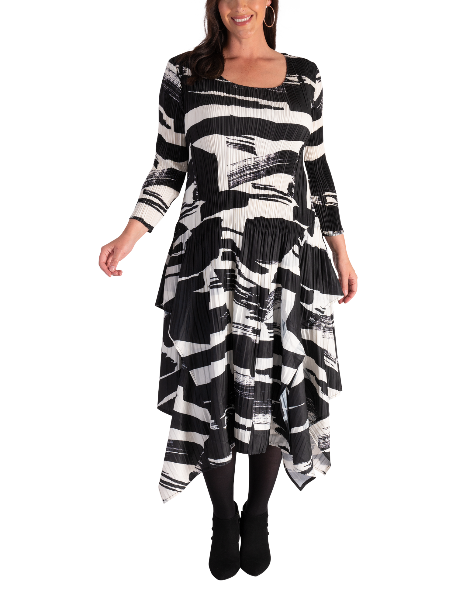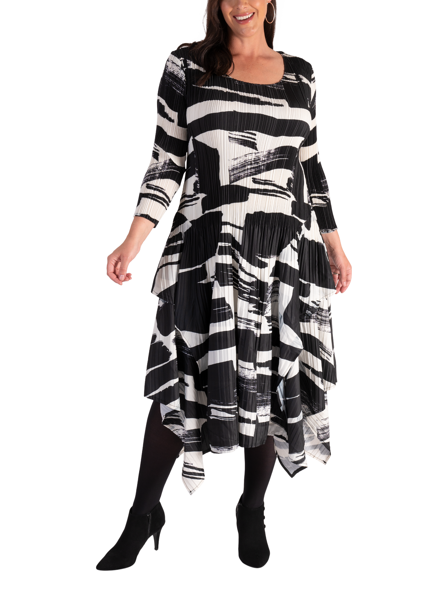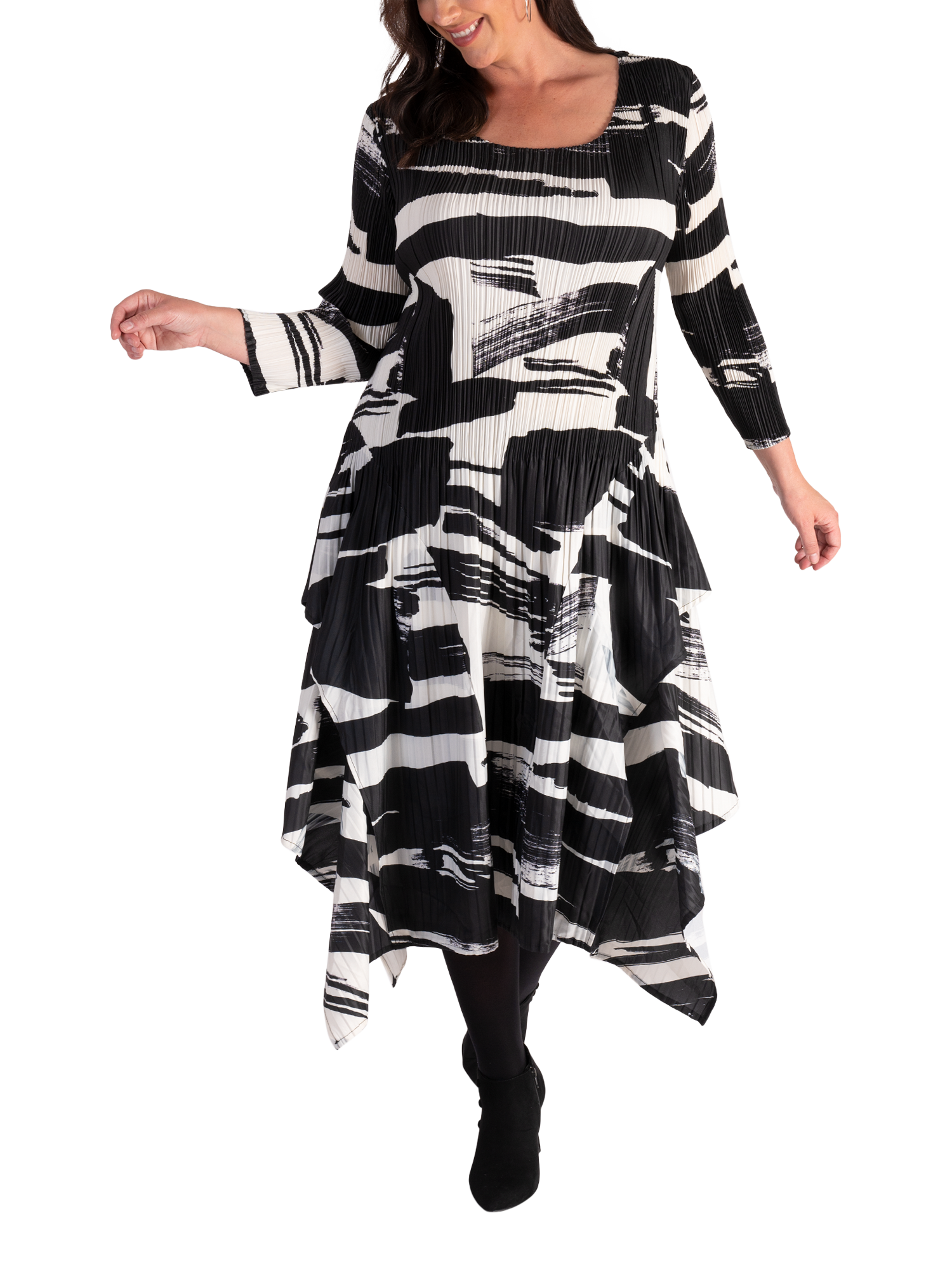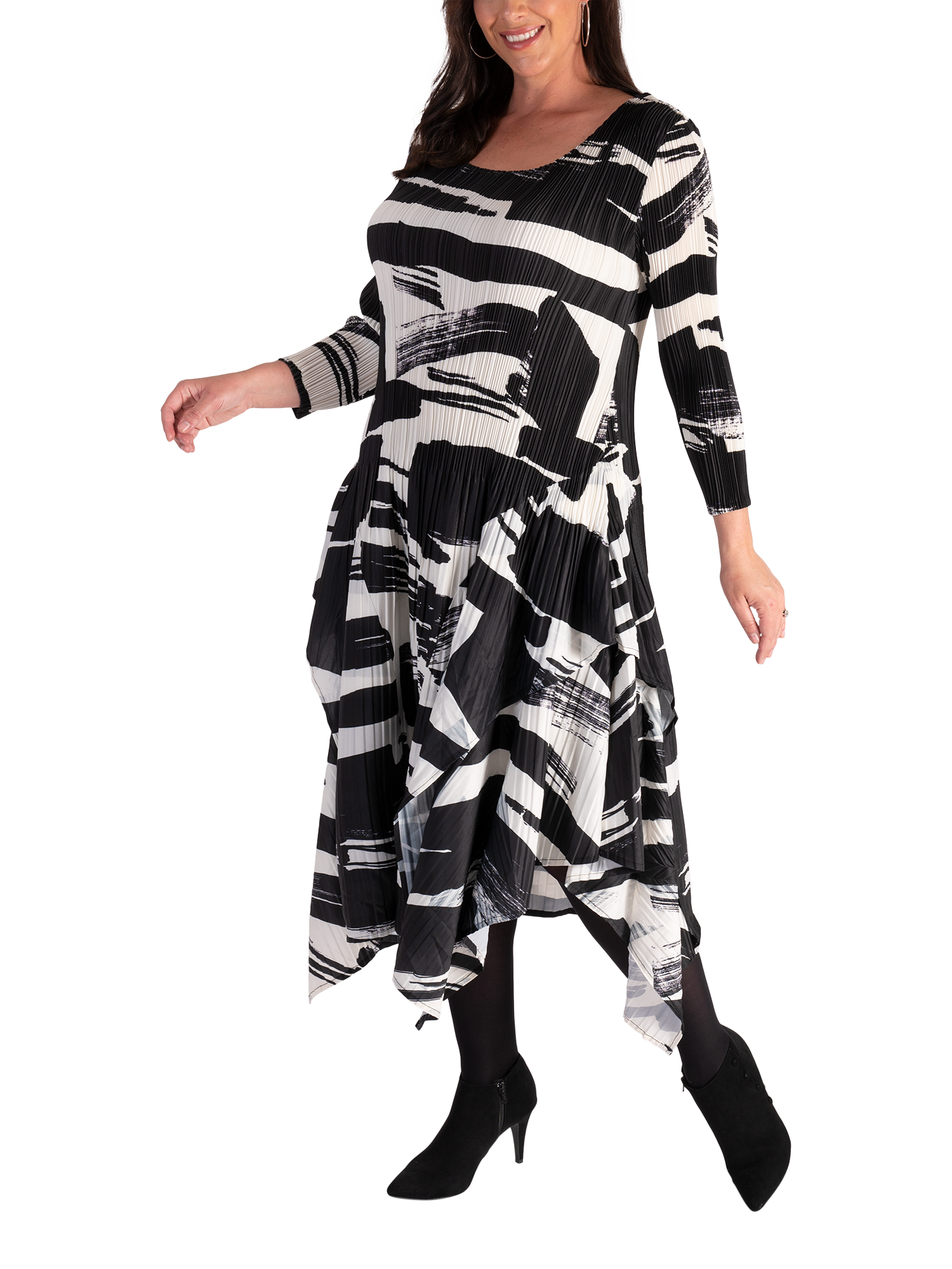 Defining design details lift this chesca dress into a new class - the simple bodice compliments the unique undulating hemline adding femininity and dimension, while the allover bold brush stroke print adds vibrant character. Practical and playful, use it to make a statement at your next special event.