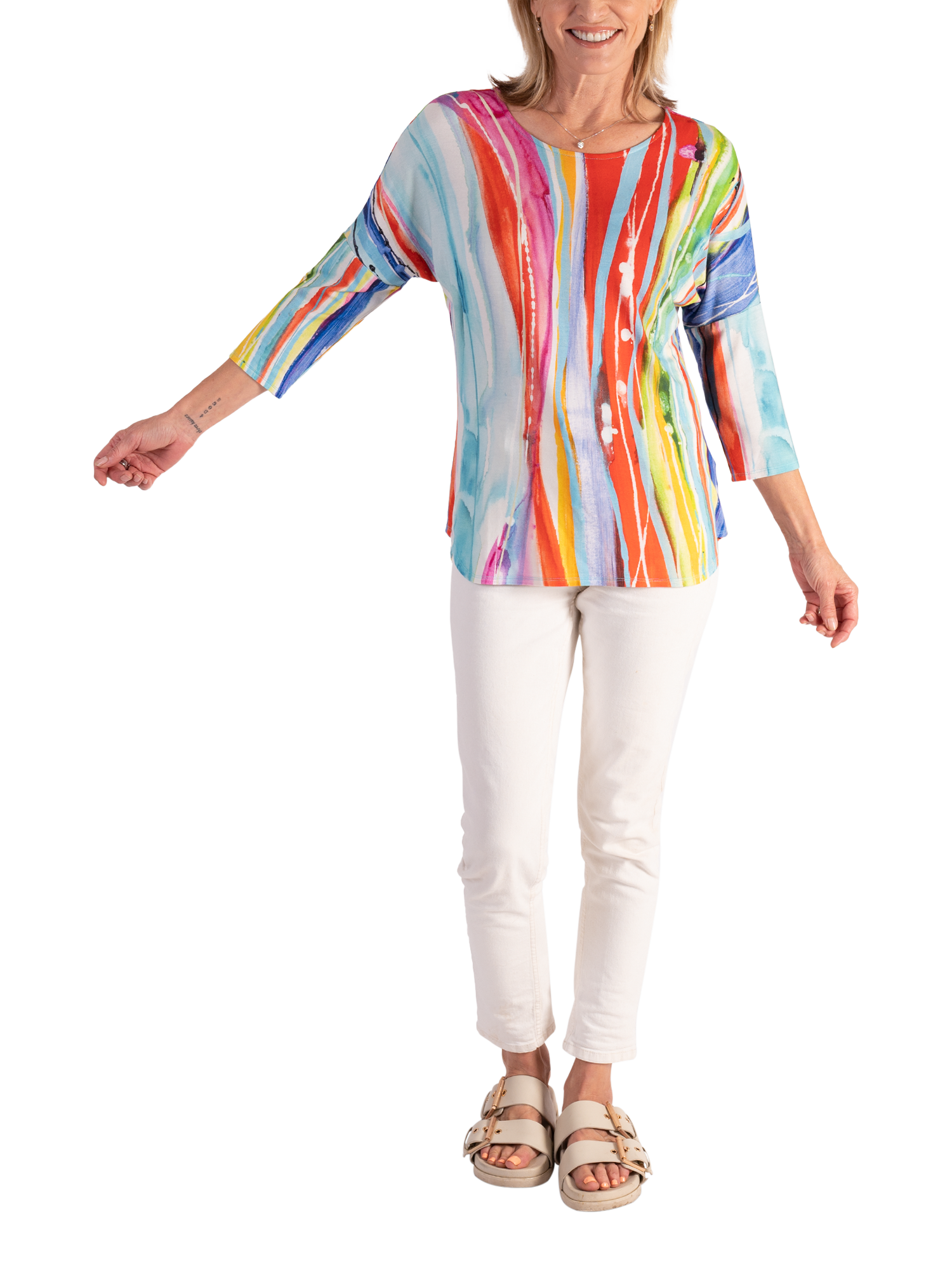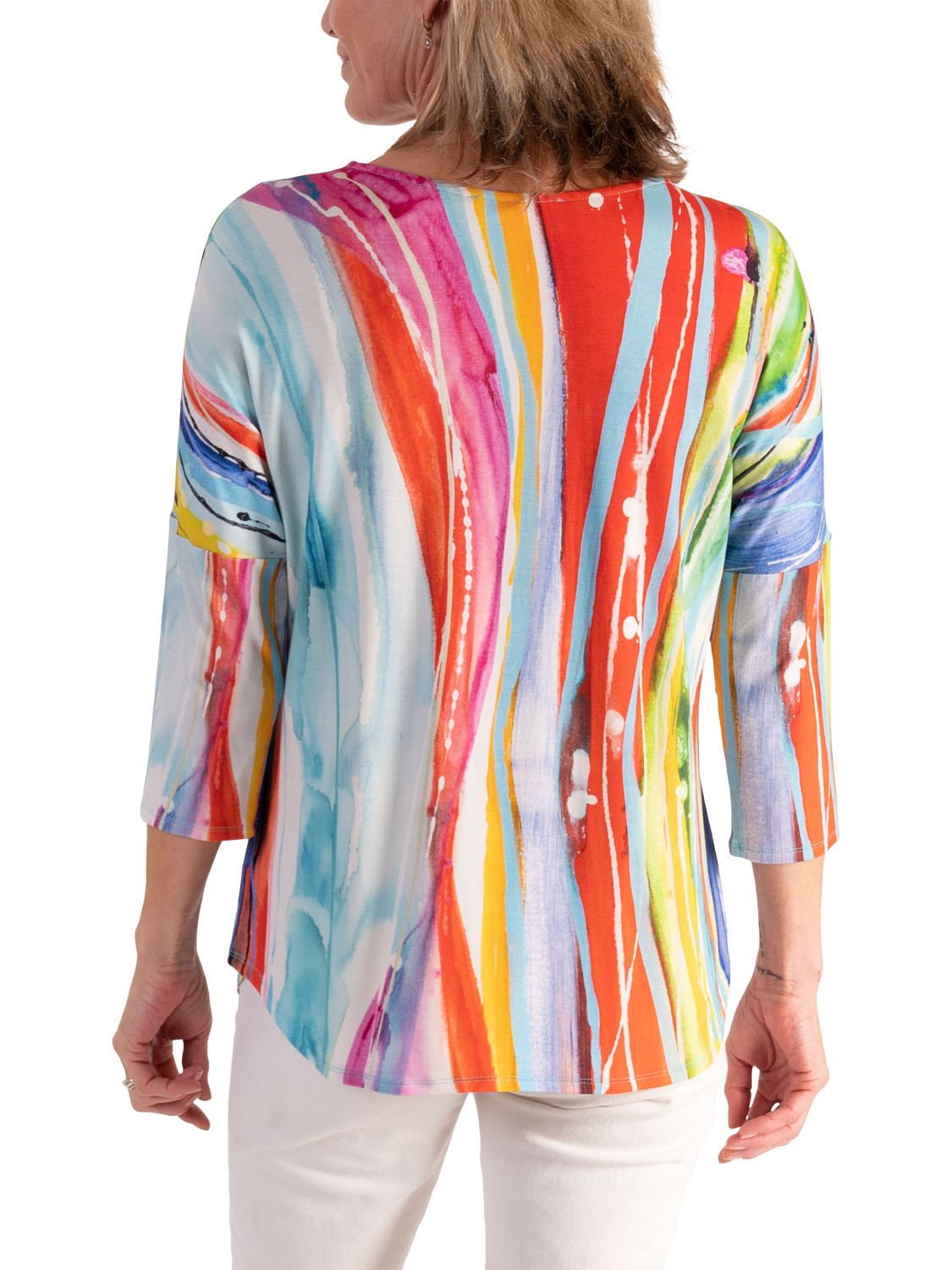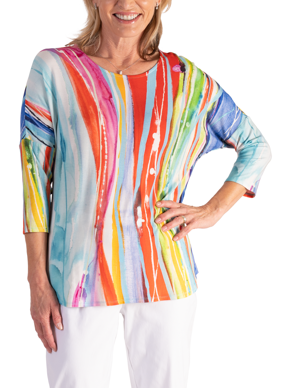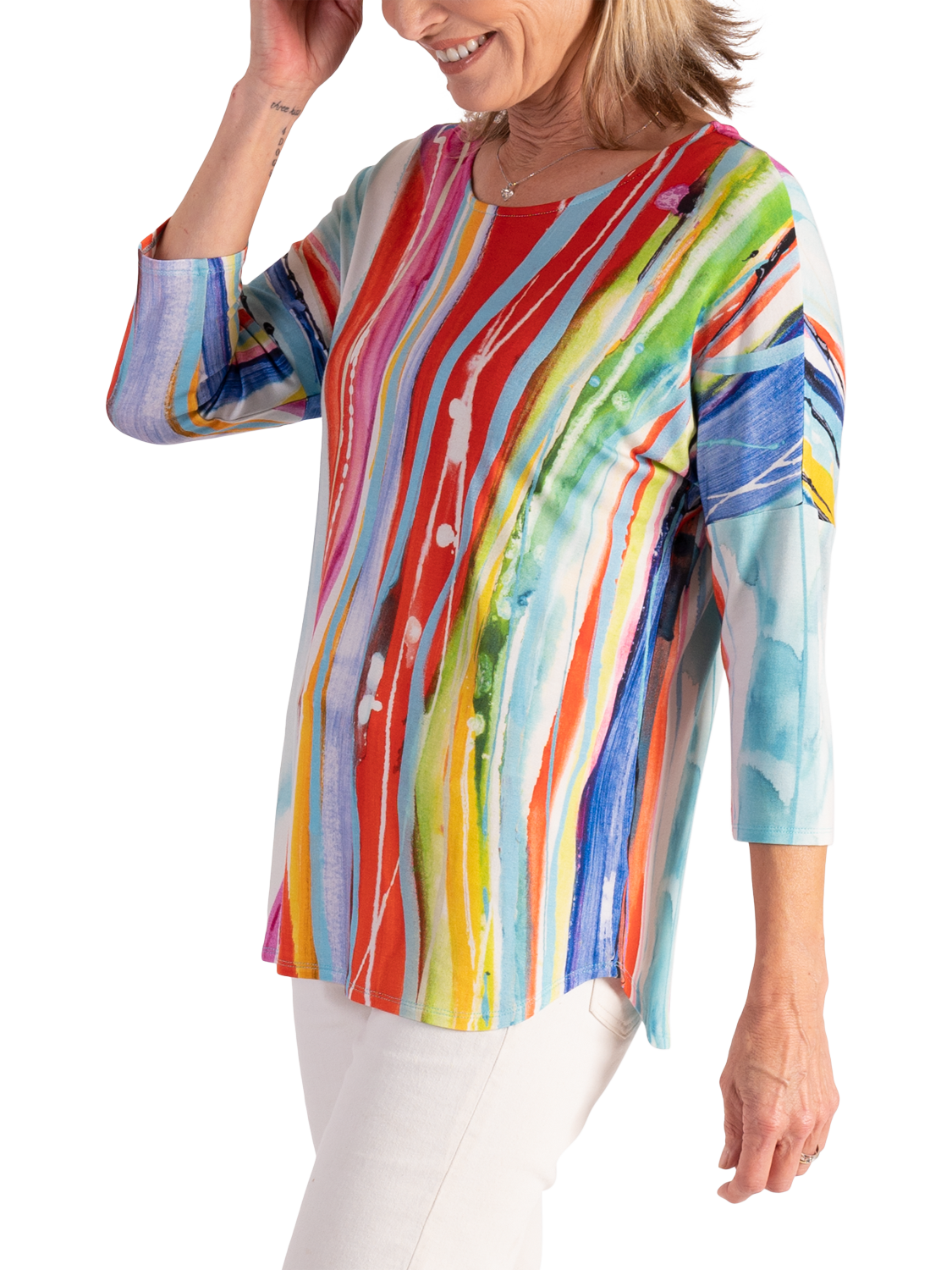 An all-year essential, this jersey top makes an impact with its breezy artistic striped print. Cut with a boat neckline, curved hem and three-quarter length dropped sleeves for a relaxed look, it is made from a light yet durable fabric and will make everyday dressing effortless.