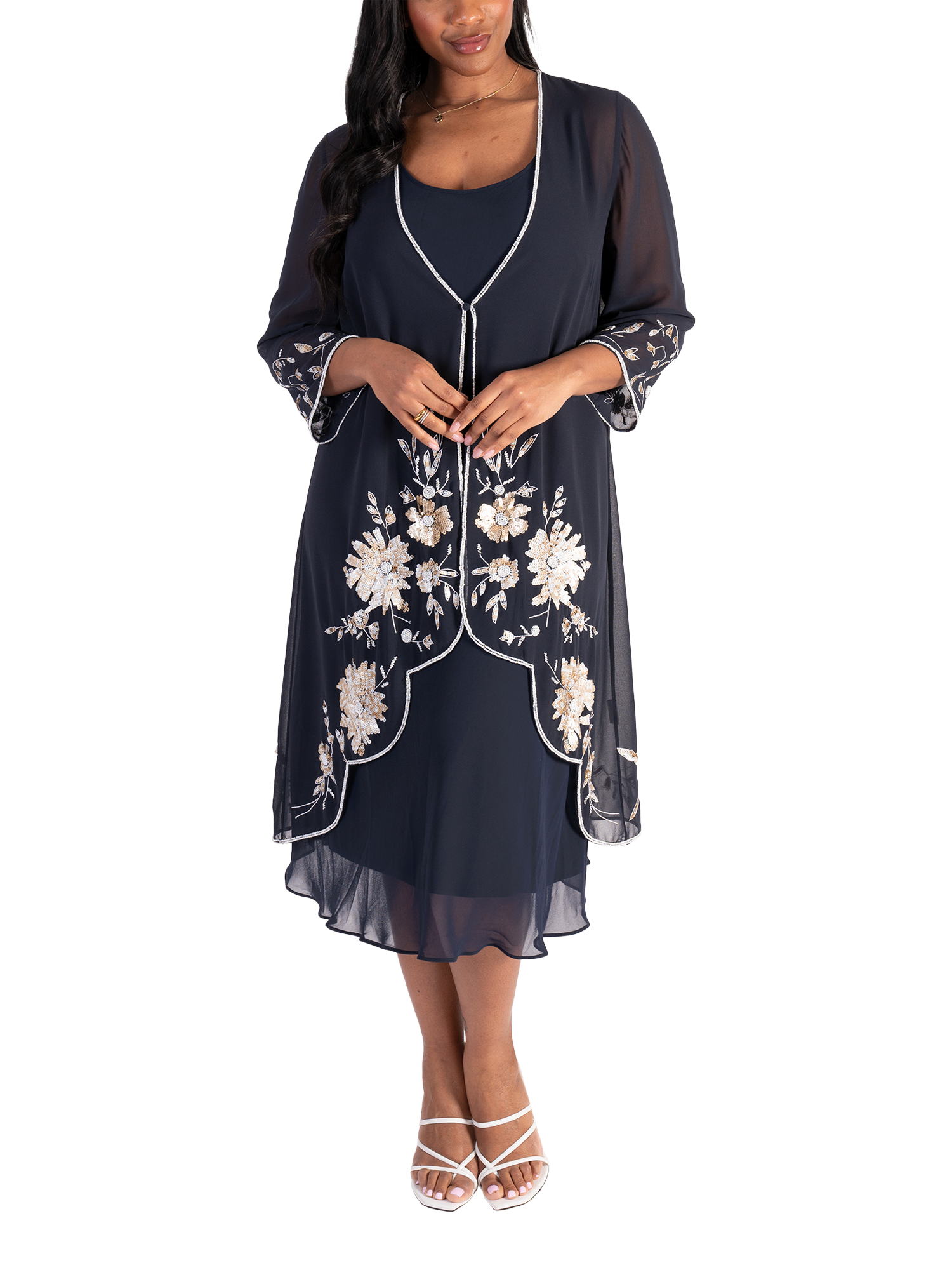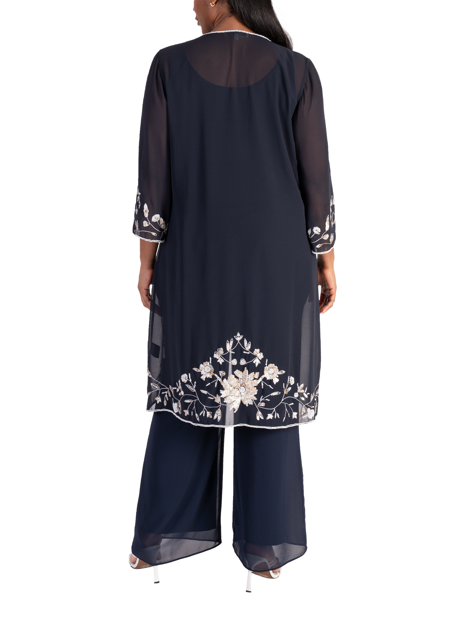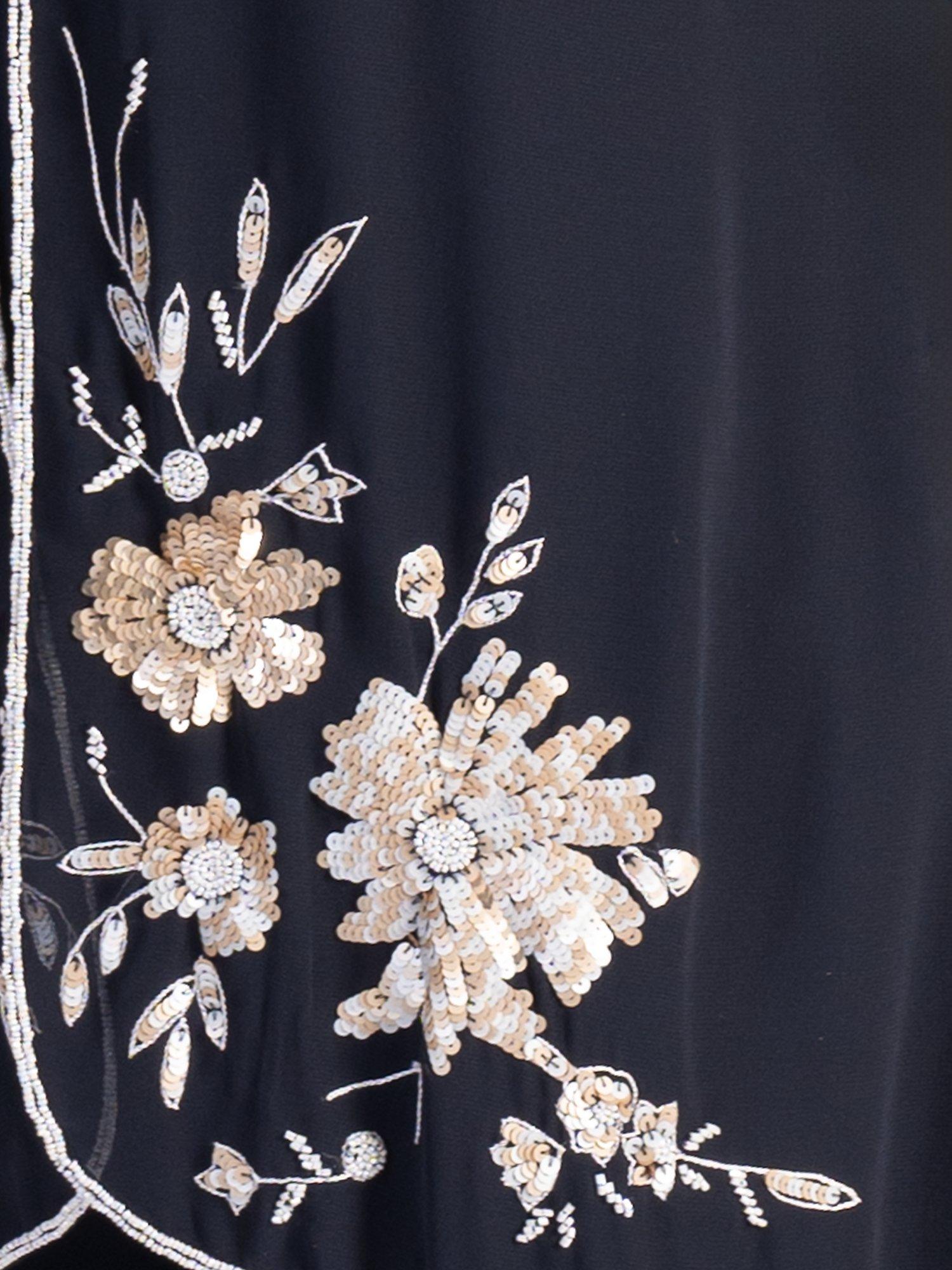 Cut from a lightweight chiffon fabric for gracefully fluid wear, this single buttoned semi-sheer coat from Chesca combines stylish coverage with an eye-catching cascading floral motif in sequins. Neatly framed with a contrast beaded edge trim, long sleeves and stepped hemline, this style instatly flatters with its longline cut. Pair with either chiffon palazzos or a bias cut dress, add a touch of jewellery and you have a stunning outfit for the mother of the bride/groom, guest at wedding or any special event.