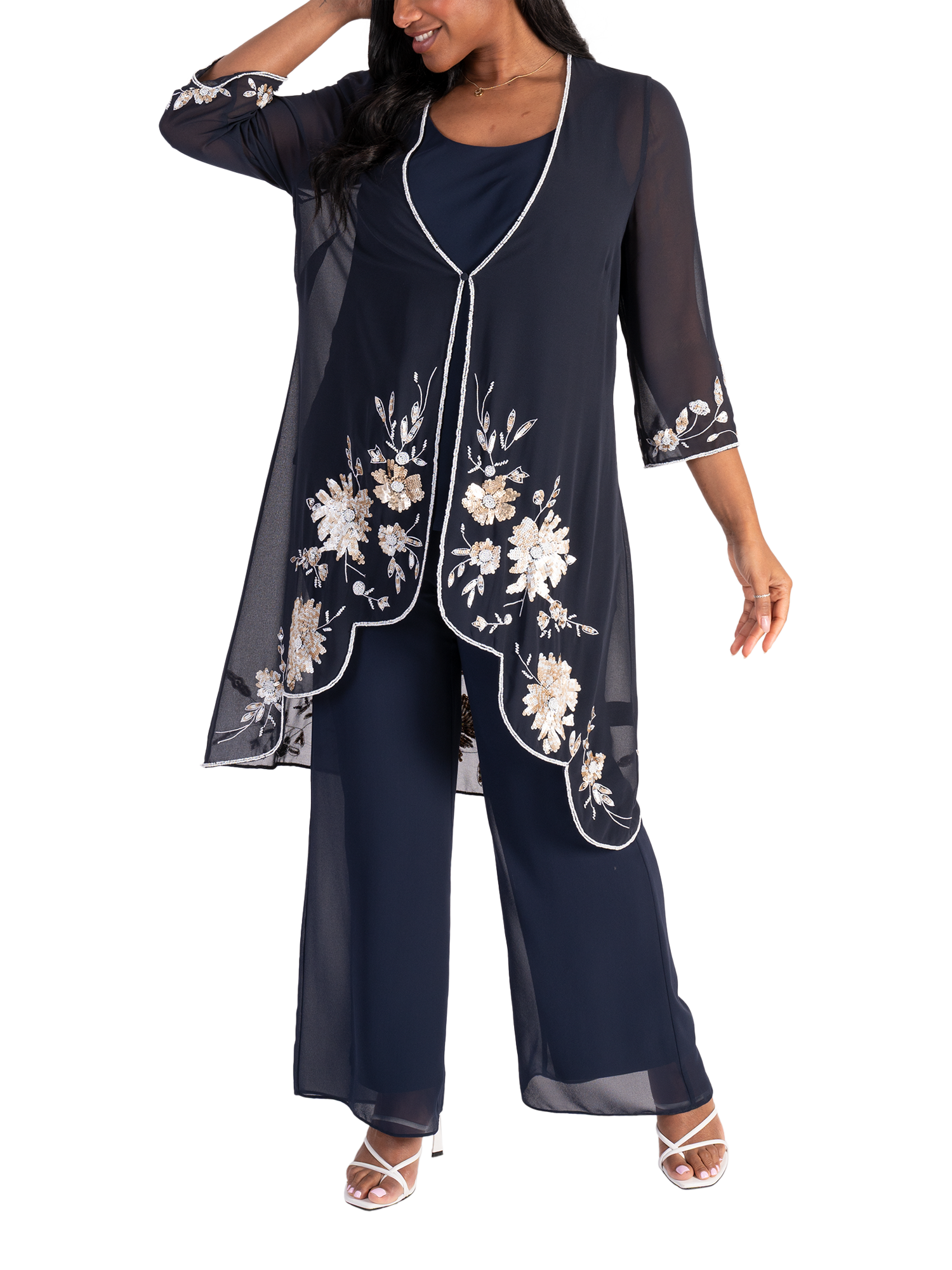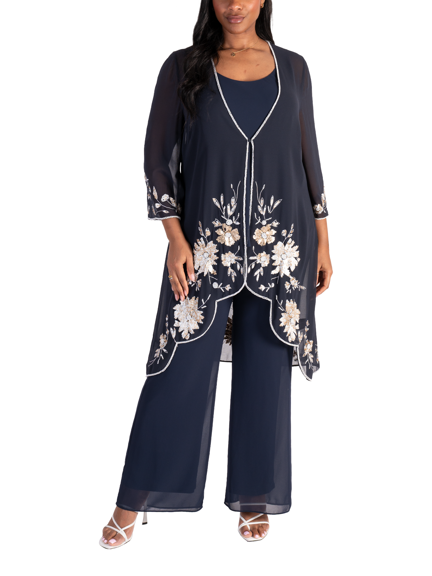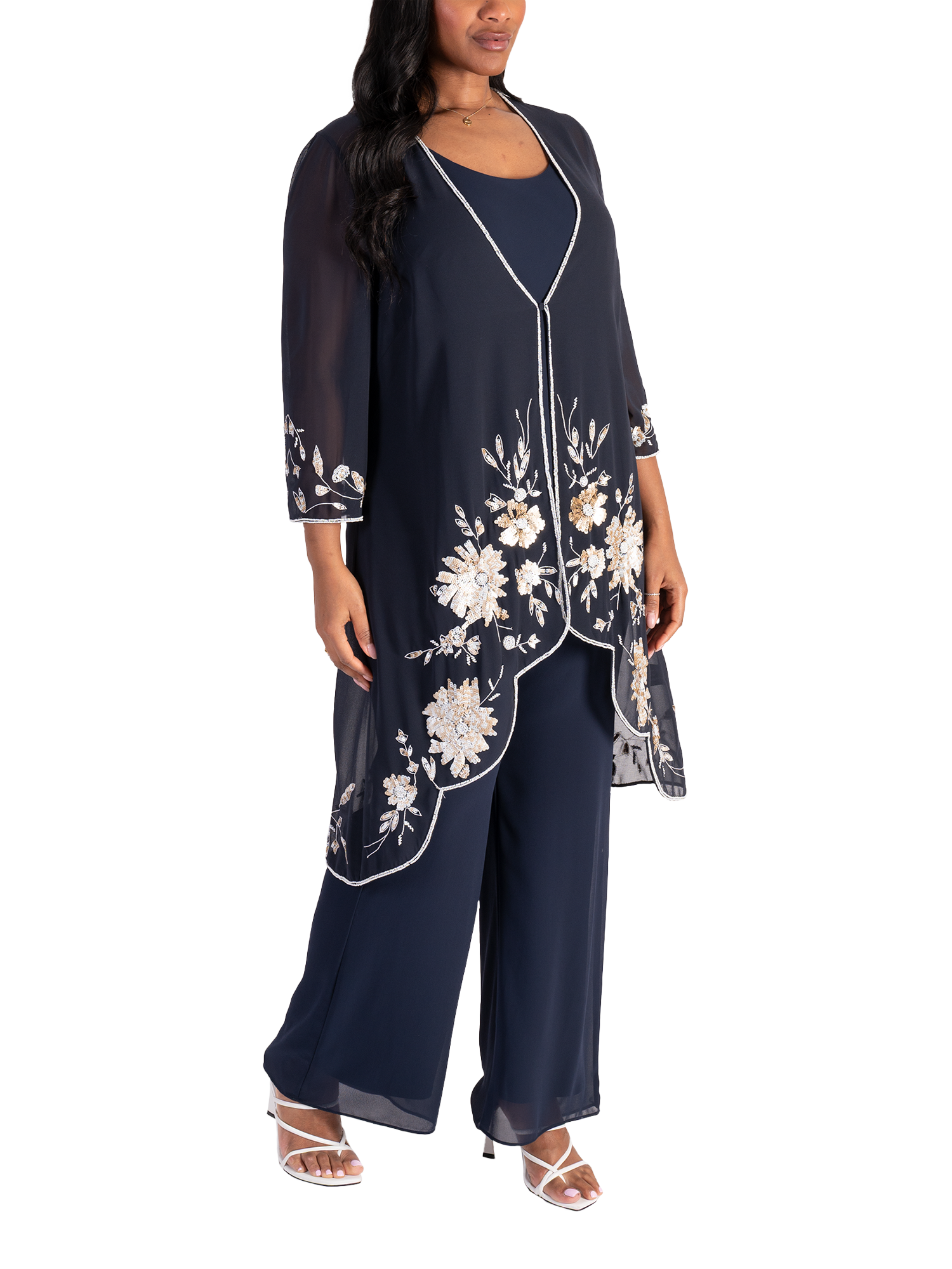 Cut from a lightweight chiffon fabric for gracefully fluid wear, this single buttoned semi-sheer coat from Chesca combines stylish coverage with an eye-catching cascading floral motif in sequins. Neatly framed with a contrast beaded edge trim, long sleeves and stepped hemline, this style instatly flatters with its longline cut. Pair with either chiffon palazzos or a bias cut dress, add a touch of jewellery and you have a stunning outfit for the mother of the bride/groom, guest at wedding or any special event.