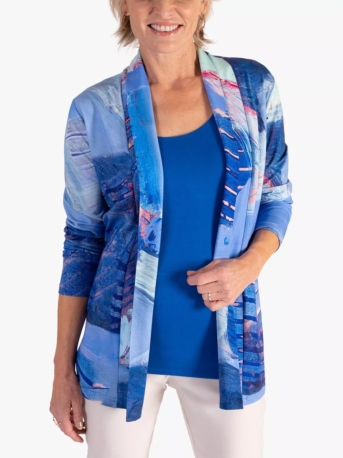 Layering neatly over dresses and tops alike, this cardigan by chesca is adorned in an abstract pattern for a modern look and is cut from a cotton blend for breathable wear.
