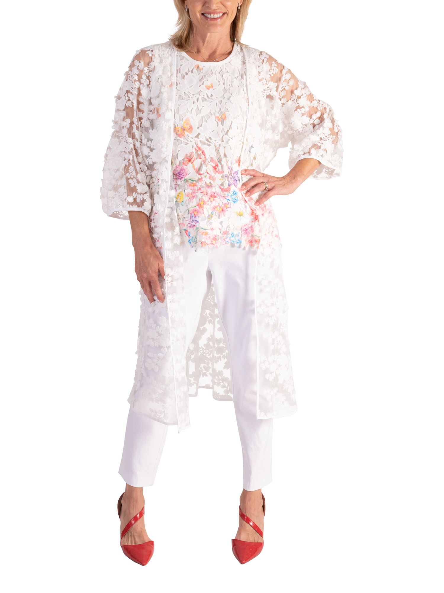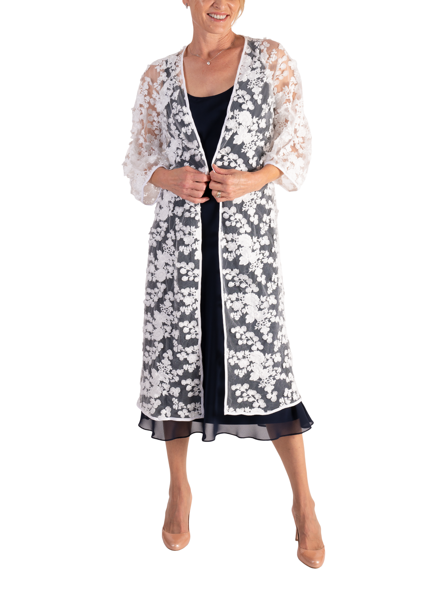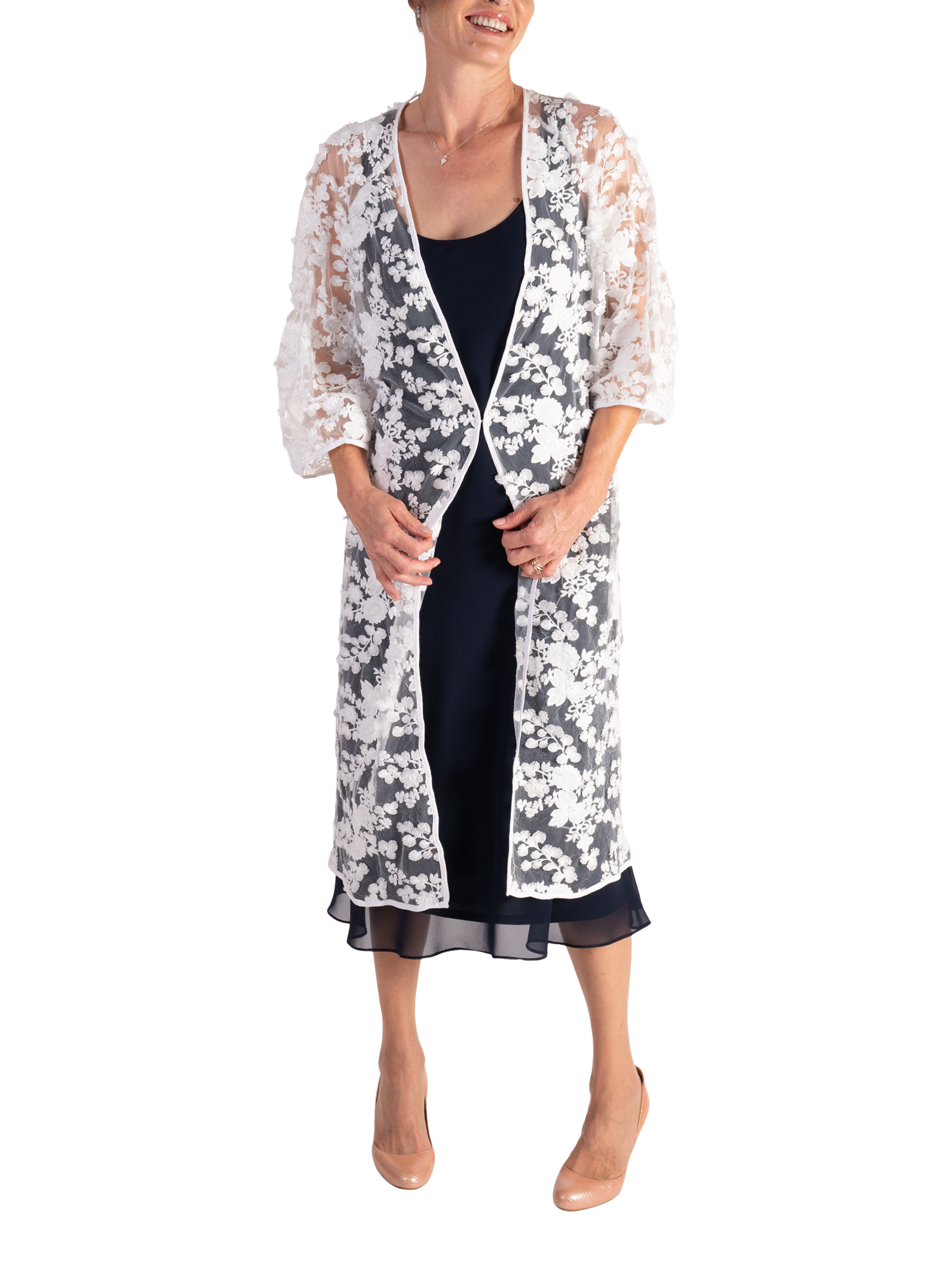 A great layering piece offering fluidity and movement, this longline cover up is crafted from a feminine floral embroidered mesh fabric. Complete with flattering three-quarter length gathered sleeves and a single hook and eye fastening, slip over a dress or smart separates to create a stunning outfit for a special event, or pair with summer casuals for a chic holiday look.