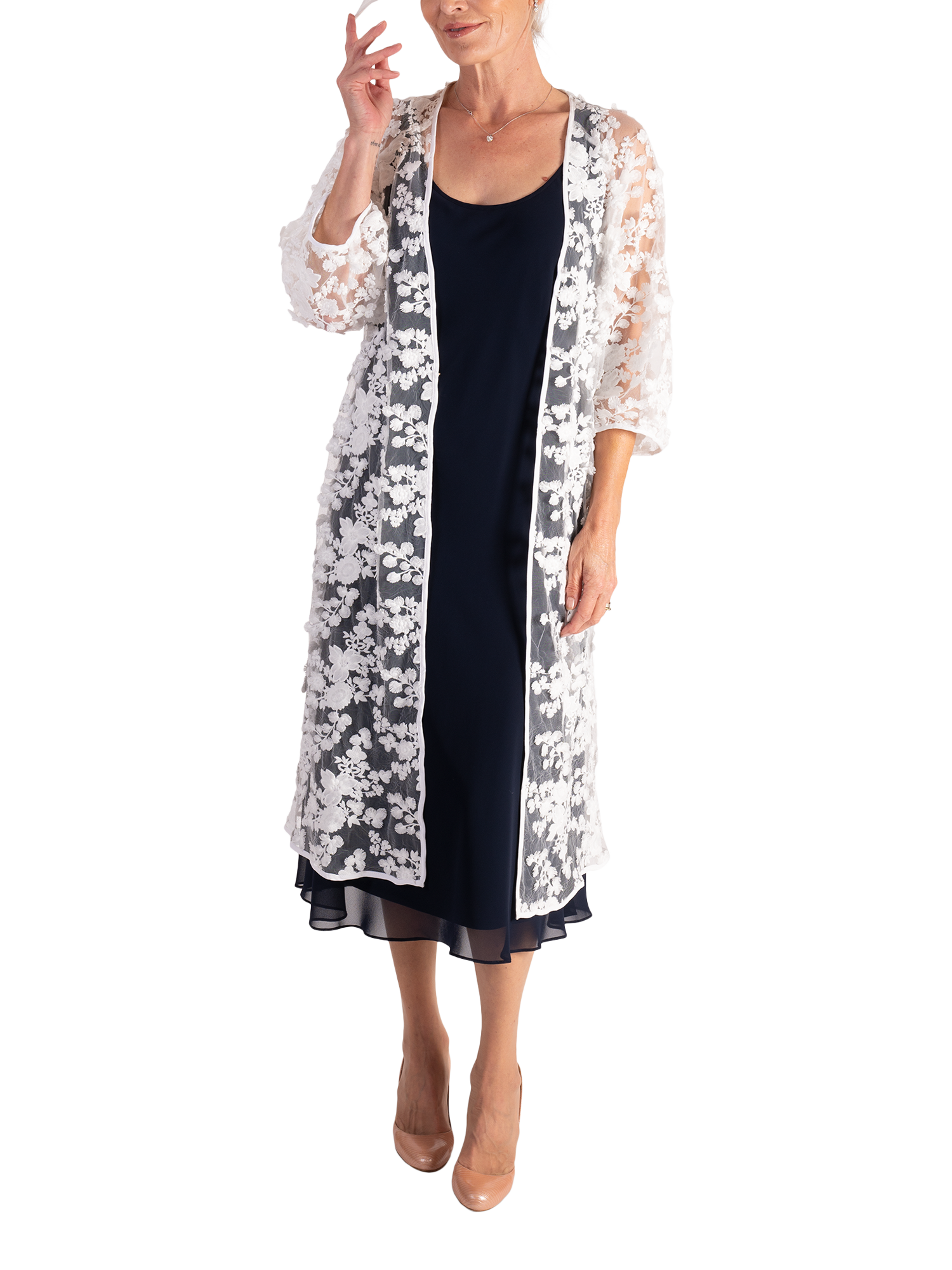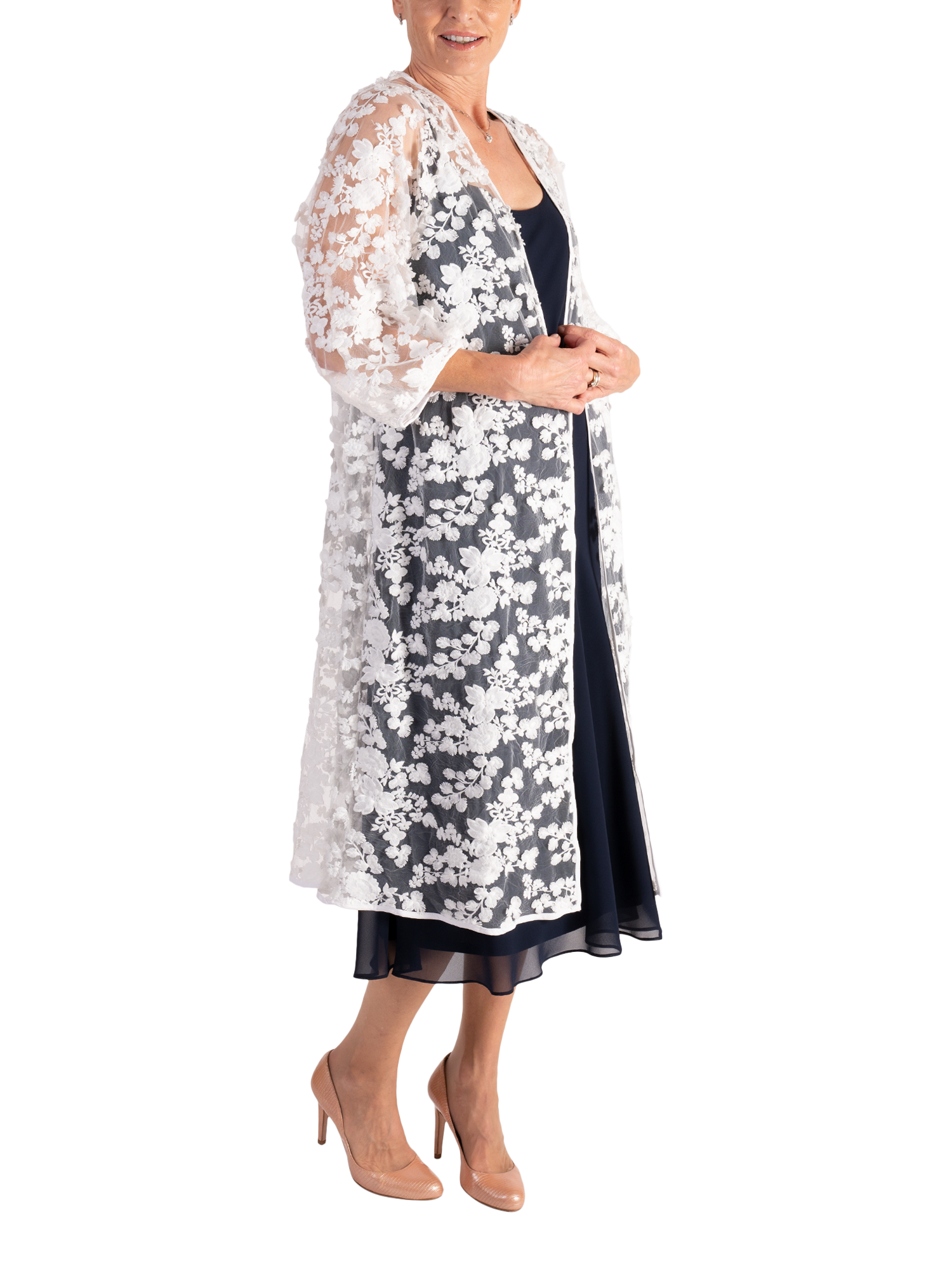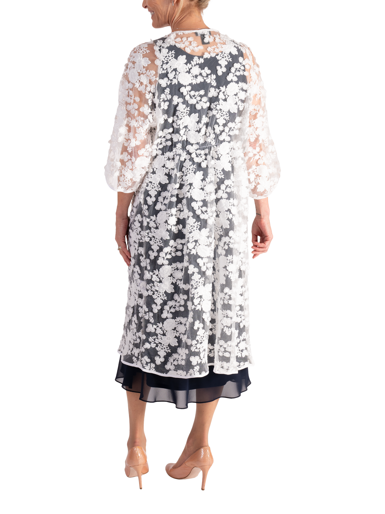 A great layering piece offering fluidity and movement, this longline cover up is crafted from a feminine floral embroidered mesh fabric. Complete with flattering three-quarter length gathered sleeves and a single hook and eye fastening, slip over a dress or smart separates to create a stunning outfit for a special event, or pair with summer casuals for a chic holiday look.