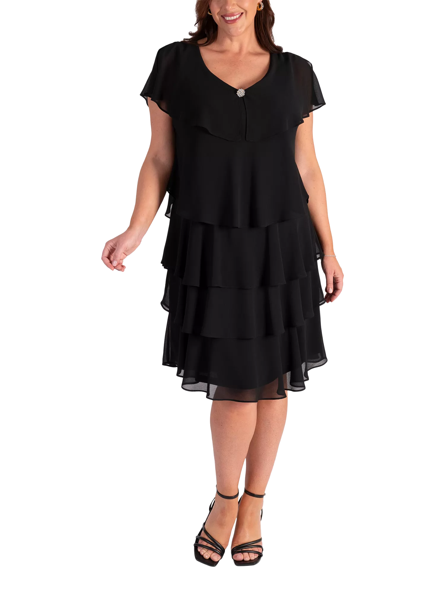Cut to an iconic shift silhouette, this tiered below-the-knee length sleeveless dress is crafted from a feminine chiffon fabric. Framed with a classic V neckline embellished with a detachable diamanté detail, this figure-flattering dress makes an ideal outfit choice for a guest at wedding or party and is perfect to accessorise.