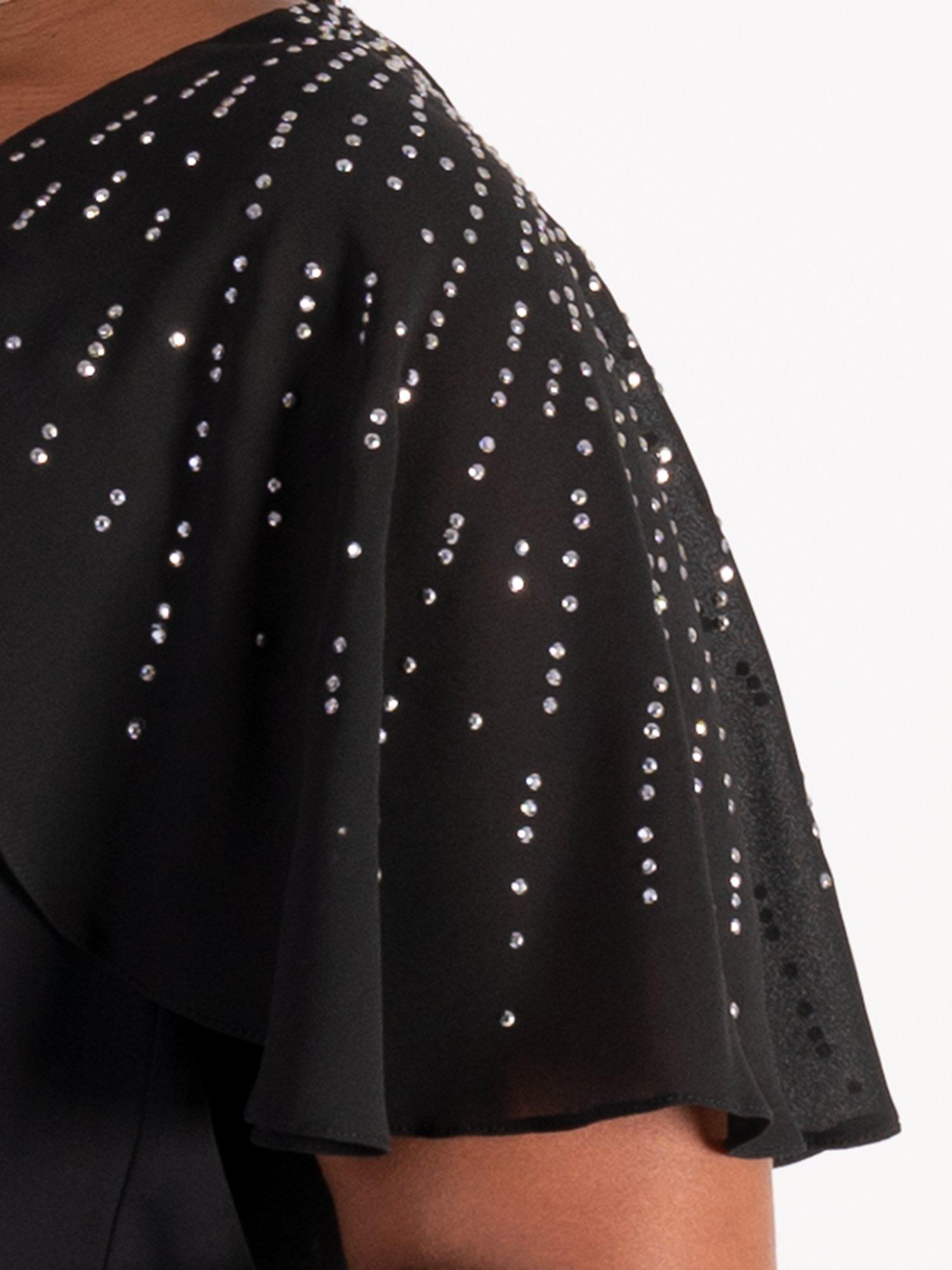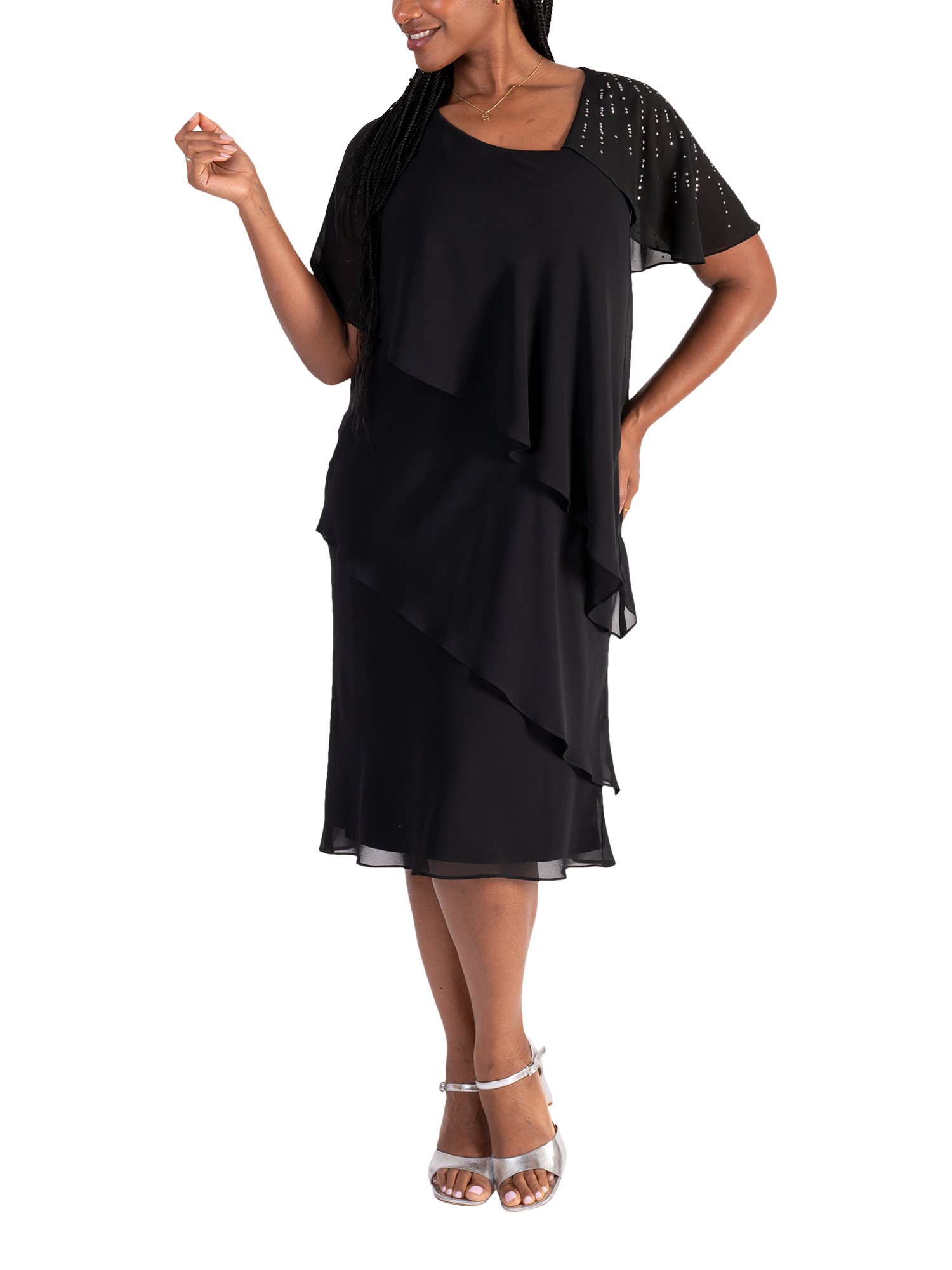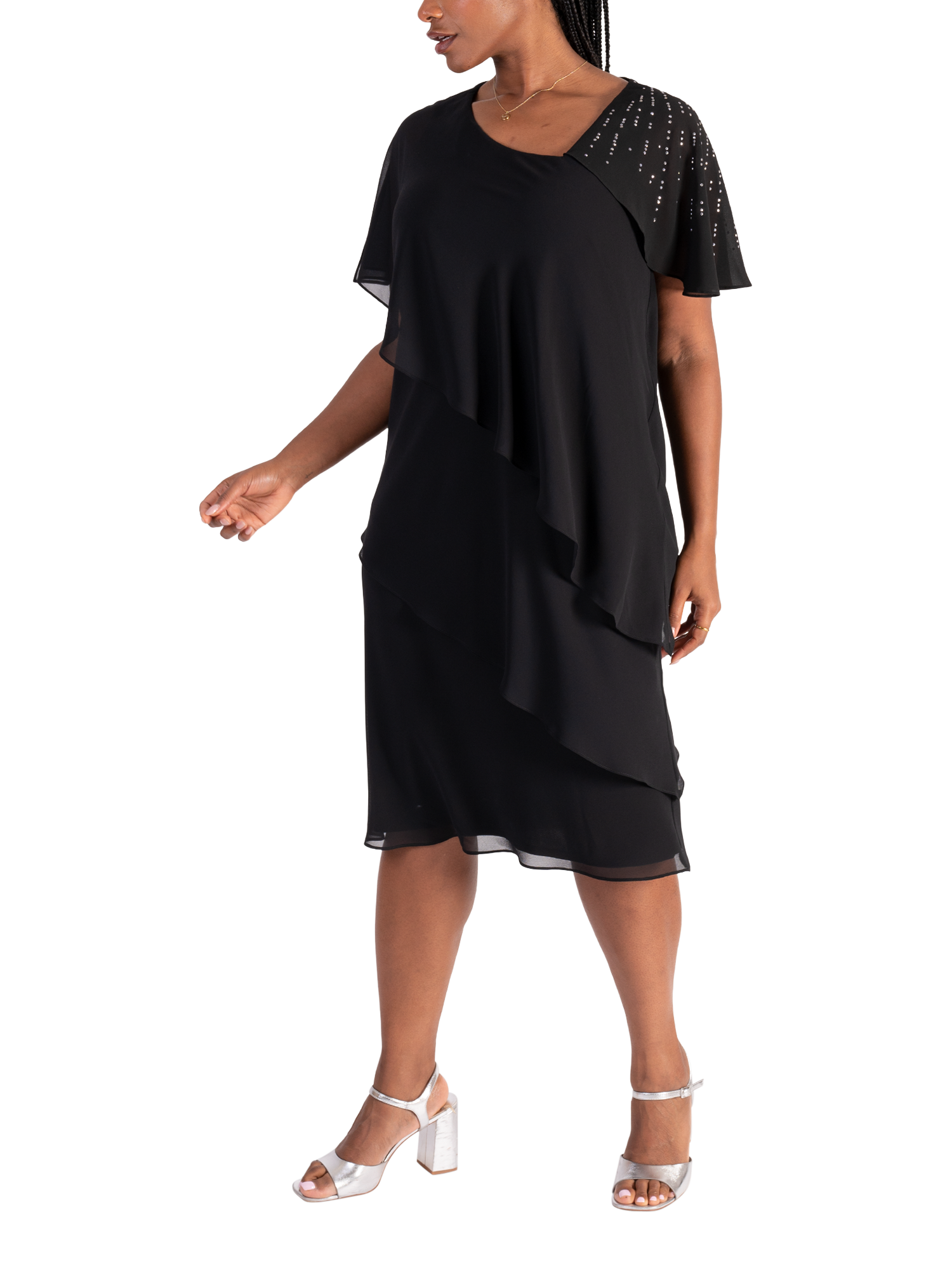 Creating a fluid feel in an iconic tiered silhouette, this midi dress by chesca exudes class with cascading diamanté details on one shoulder. Framed with an asymmetric neckline and feminine floaty sleeves, it is cut from a lightweight chiffon fabric and is a go-to for sophisticated occasions.