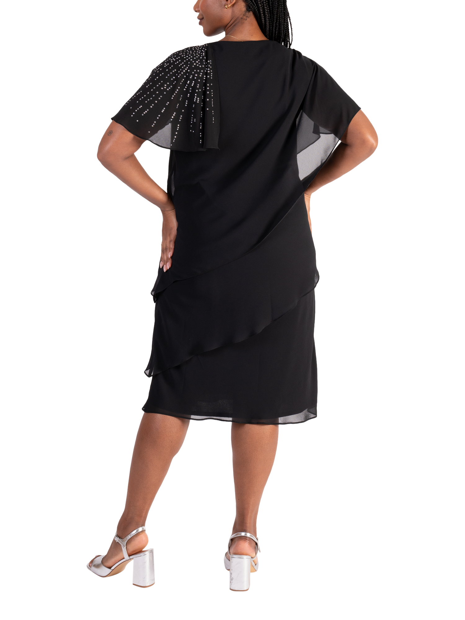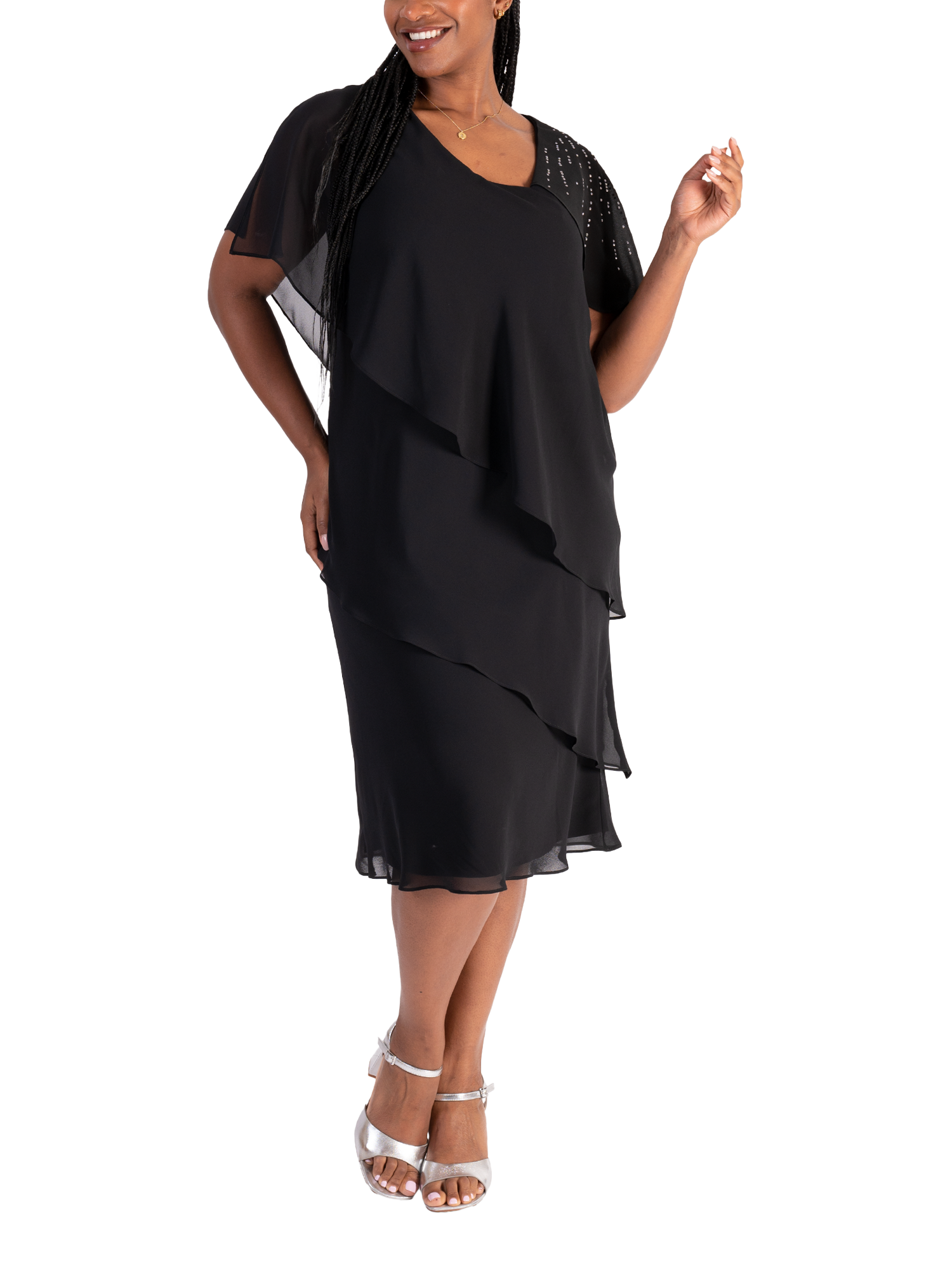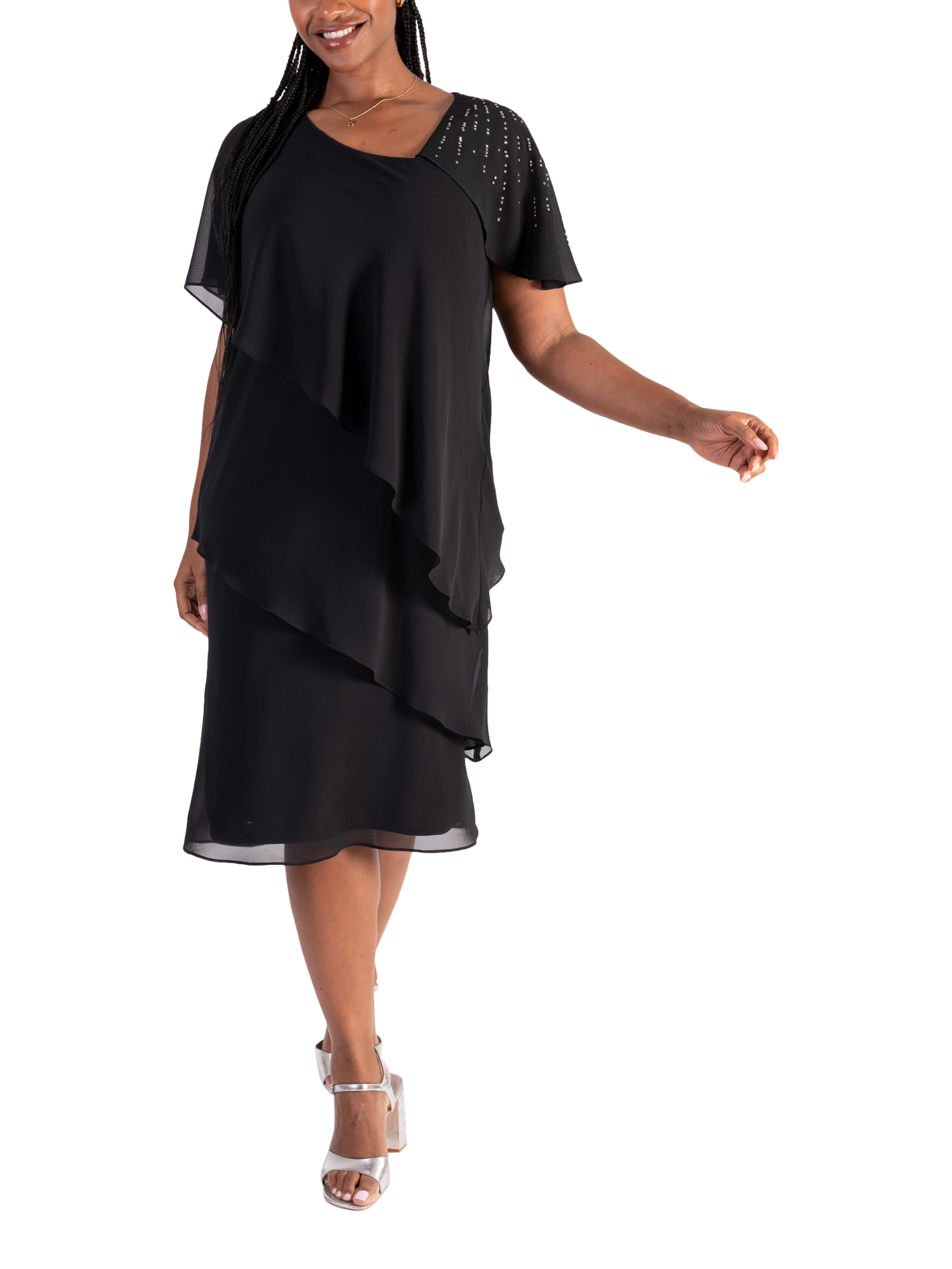 Creating a fluid feel in an iconic tiered silhouette, this midi dress by chesca exudes class with cascading diamanté details on one shoulder. Framed with an asymmetric neckline and feminine floaty sleeves, it is cut from a lightweight chiffon fabric and is a go-to for sophisticated occasions.
