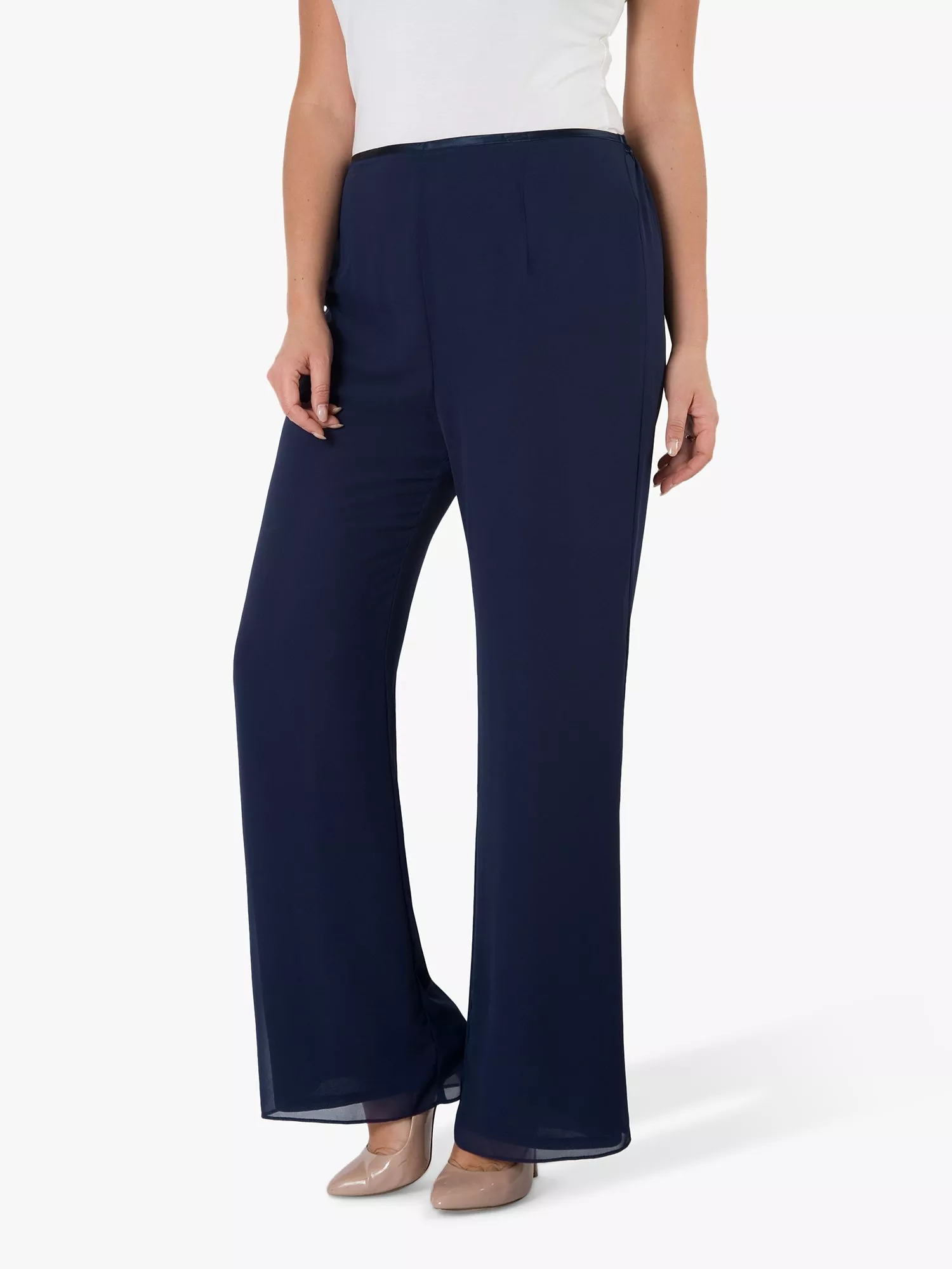 These chesca Chiffon Trousers are crafted from a luxe blend for optimal comfort and elegance. Featuring a satin band at the waist, these smart trousers lend a formal accent and versatility to your collection.