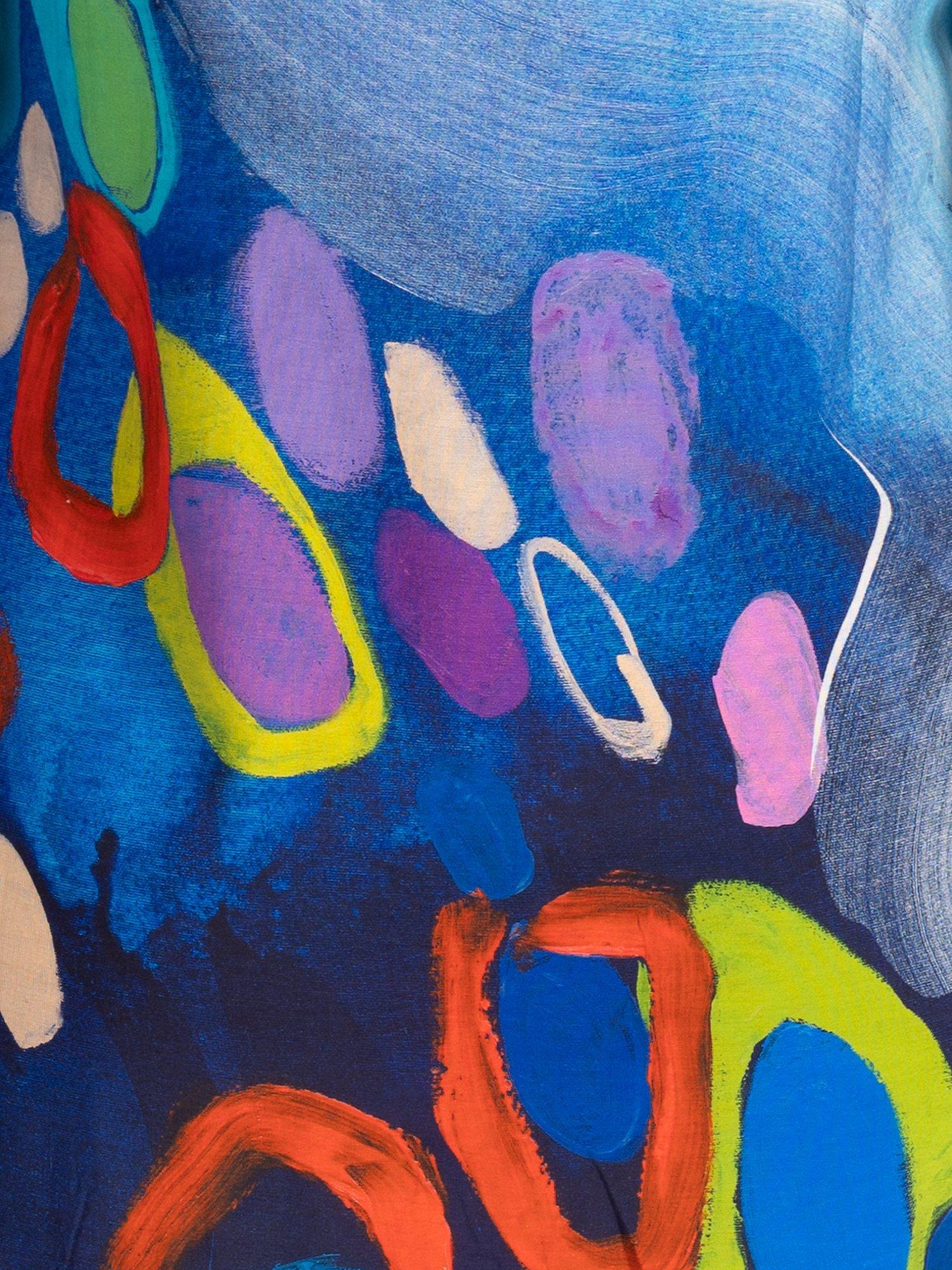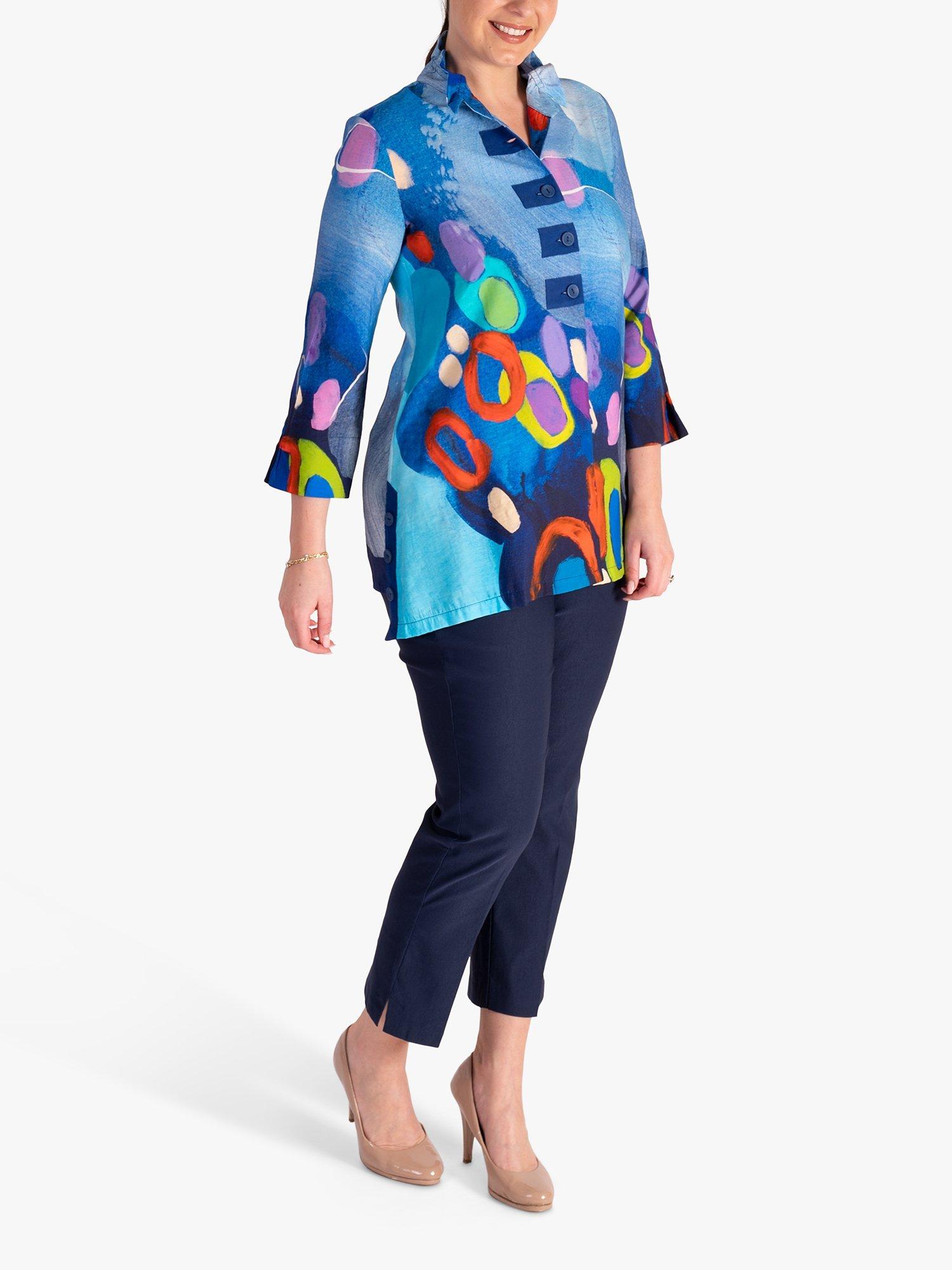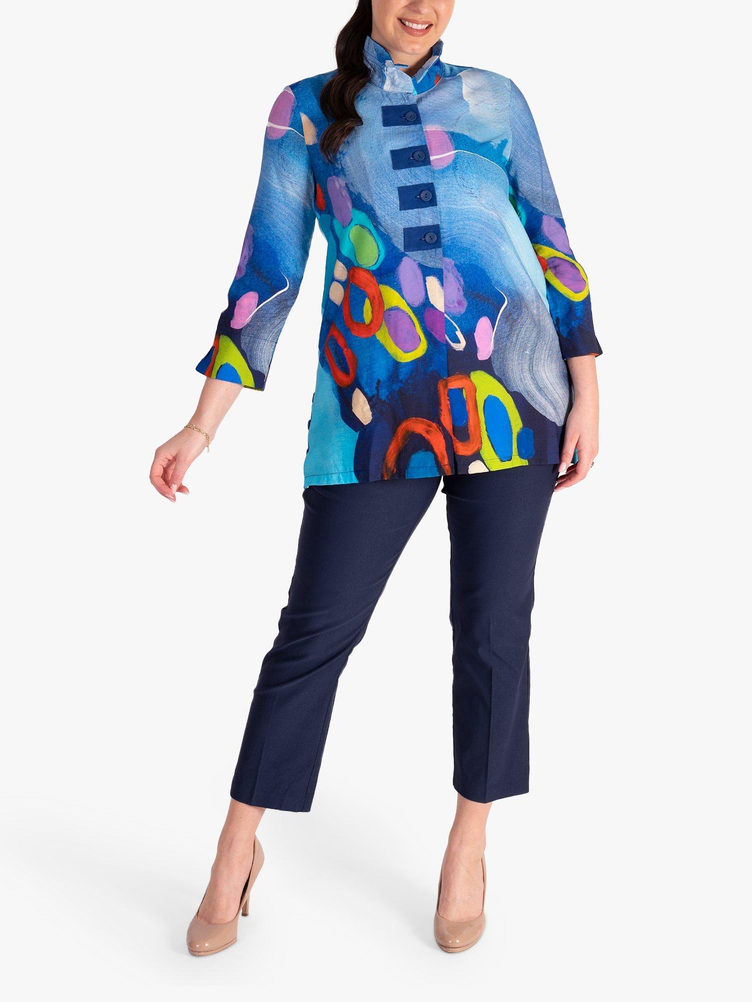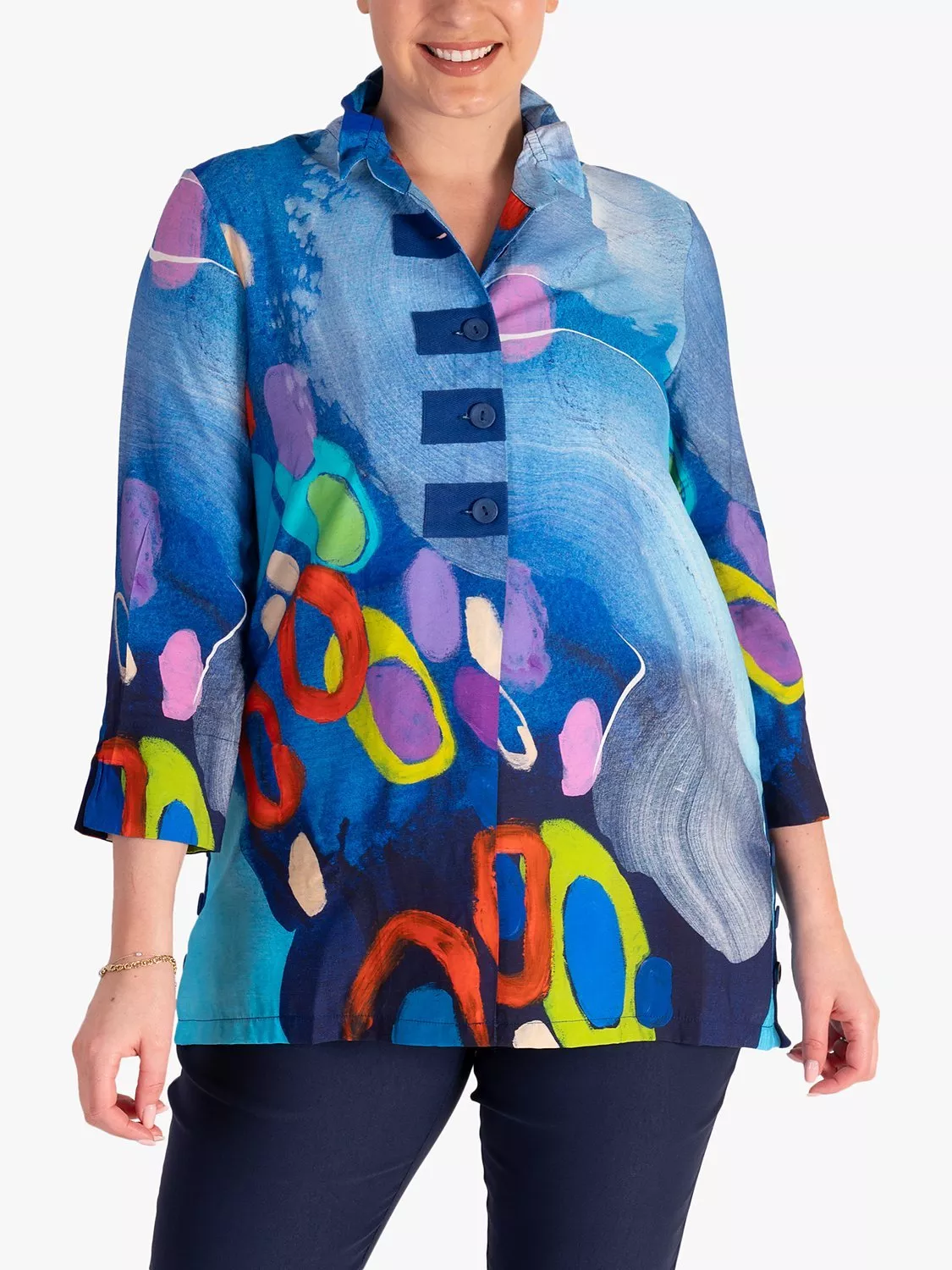 Make a statement with wearable art. This blouse features a bold artistic abstract design in many eye-catching colours. Finished with blue buttons and a wire frill collar, it's a striking everyday style. Pair with jeans and you have outfit to take you from desk to dinner.