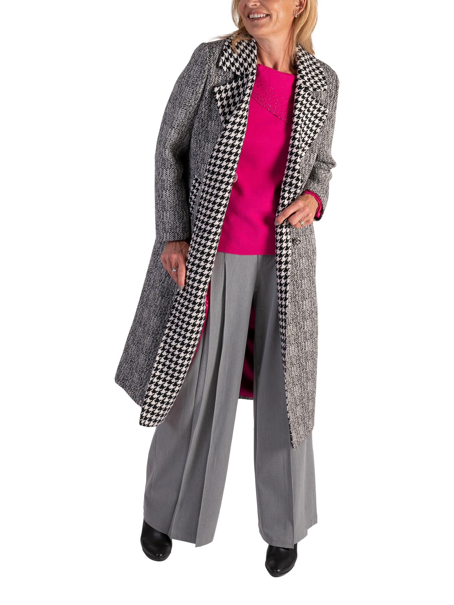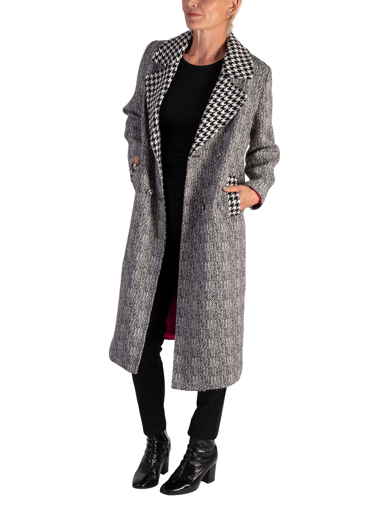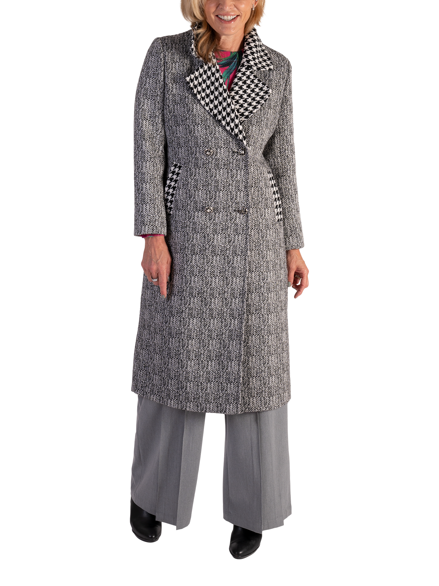 The epitome of winter styling, this timeless double-breasted coat keeps out the chill with its knee-length hem. Fully lined and framed with a classic notch lapel collar neckline in a bold houndstooth pattern, it is crafted from a durable blend fabric that'll keep you warm, comfortable and looking smart during chillier days. Finished with two functional pockets outlined in houndstooth to match the collar, split back vent hem and button fastenings, this classic outerwear piece will ensure you're looking elegant and stylish for years to come.