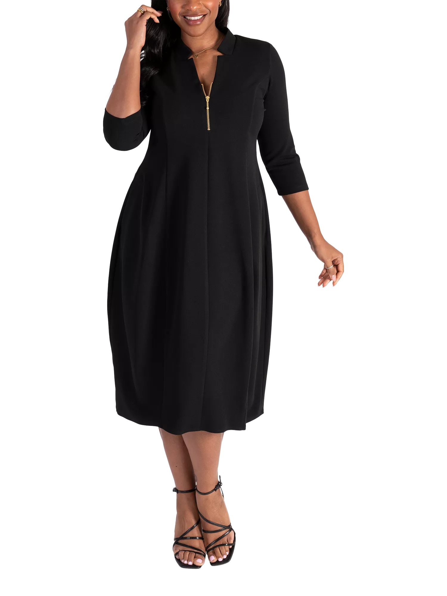 Create a flattering silhouette in this Chesca panelled crepe jersey boulle dress. Designed with a notched V neckline adorned with a statement gold zip, three-quarter length sleeves and finished with two side seam pockets, it is a care-free option for desk to dinner dressing. Add a pair of boots or heels and you're good to go. With no need for a print, this style is a celebration of minimalism.