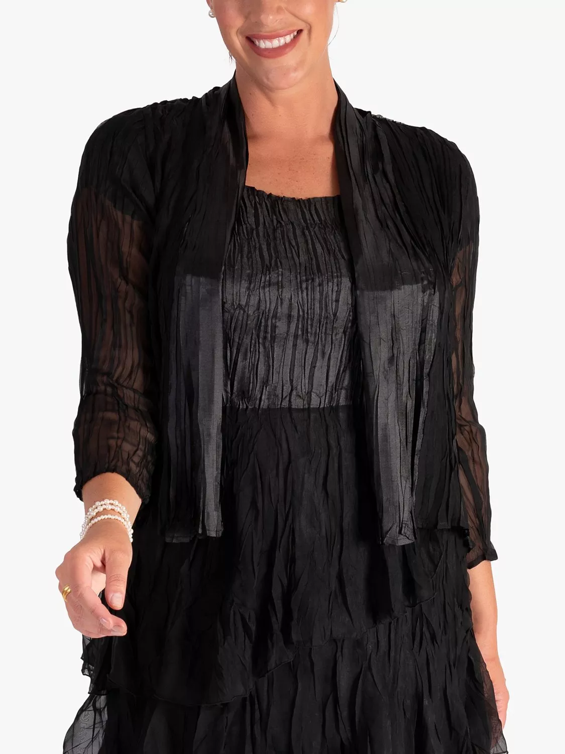 Elevate many an occasion ensemble with this gorgeous crush pleated chiffon bolero from chesca. Shimmering satin panels at the front lift this bolero into a class of its own, with its lightweight composition providing an easy wear. Wear over a matching satin and chiffon tiered dress to create a stunning look for your next special day.