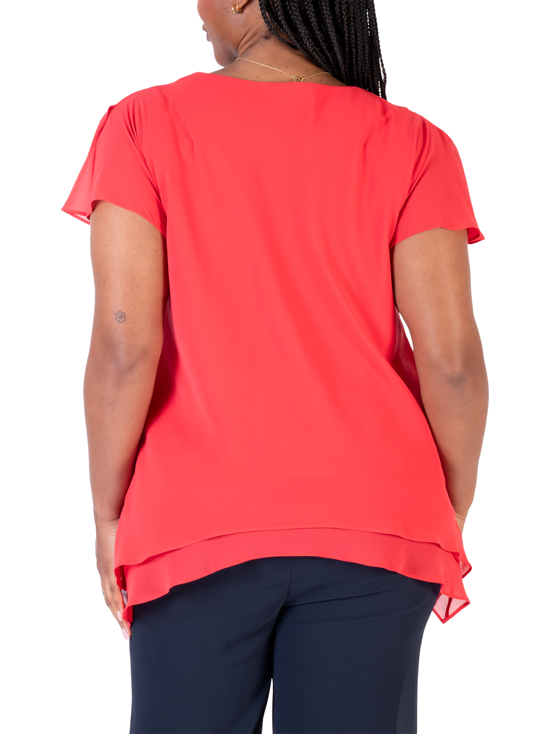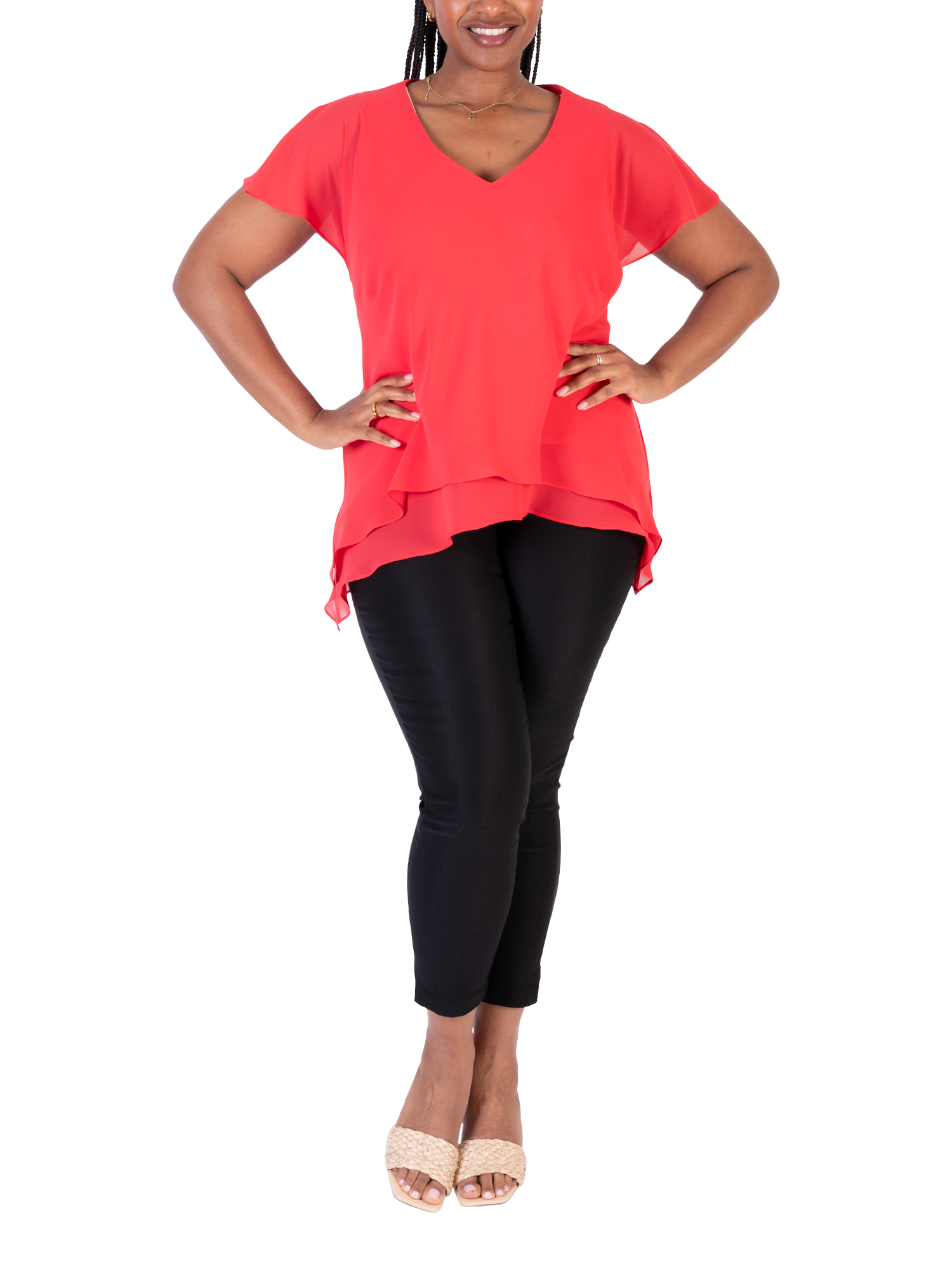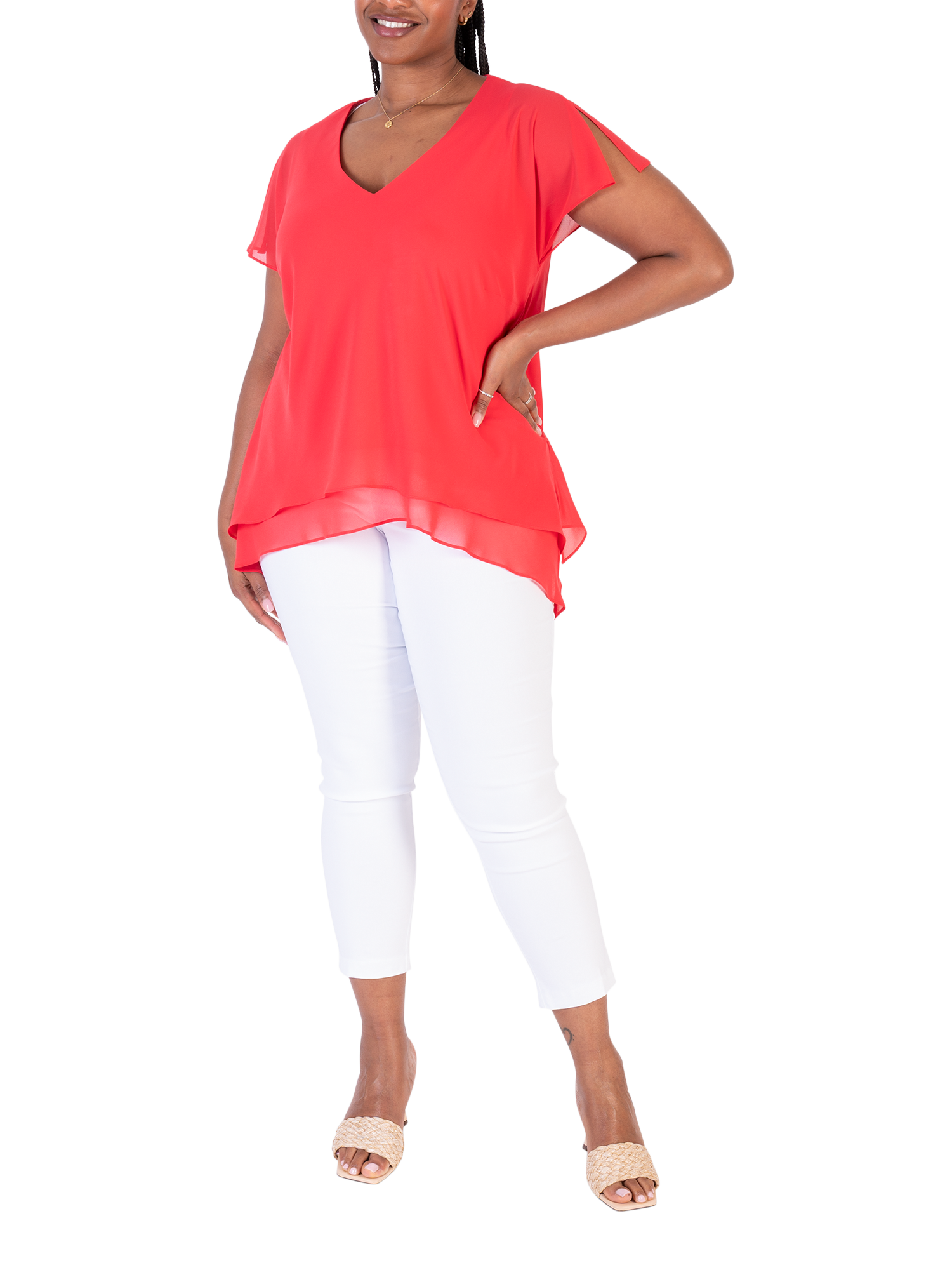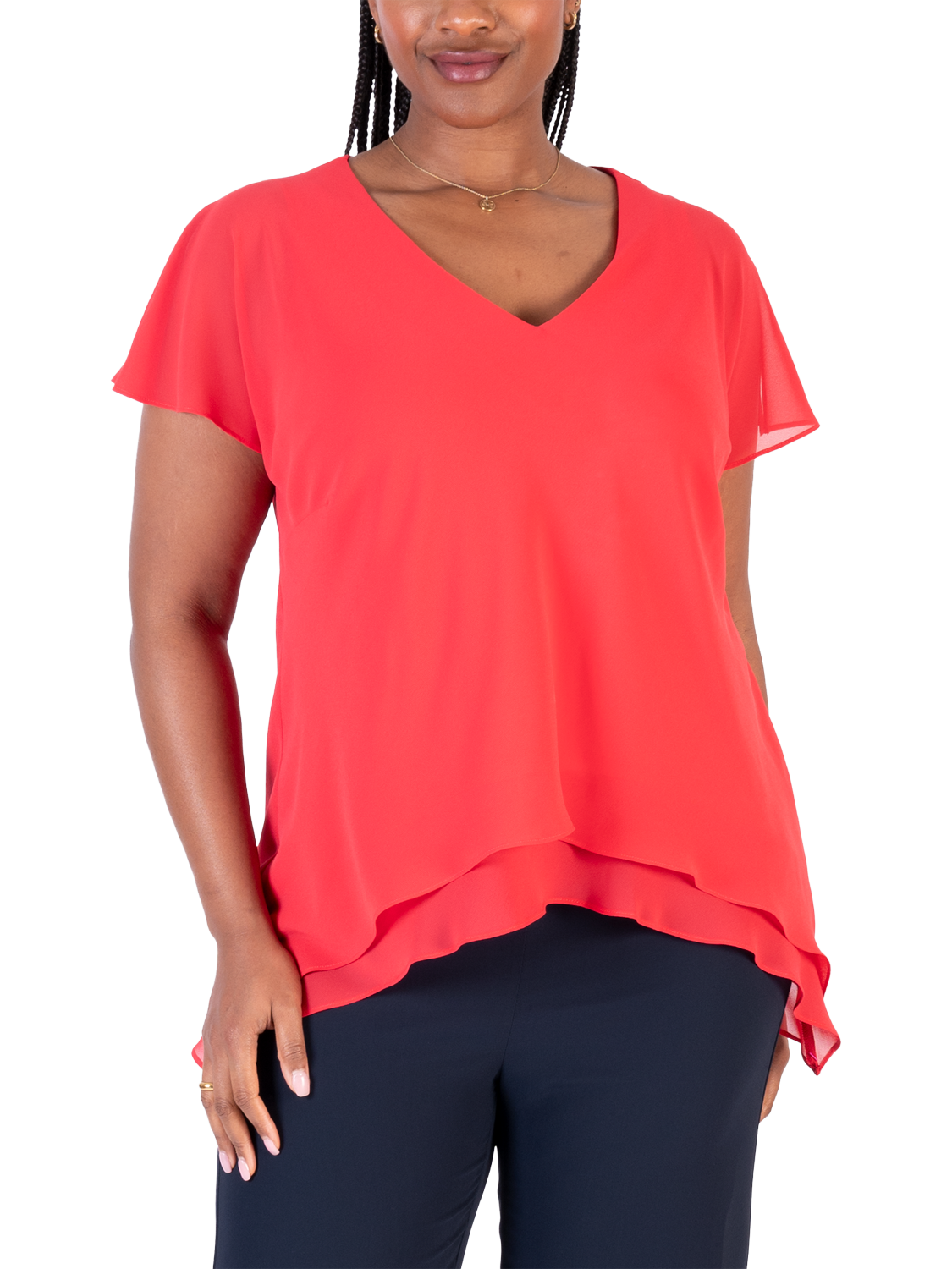With this double-layered V-neck top, chesca offers up an ideal companion for wide-leg trousers and bold accessories.