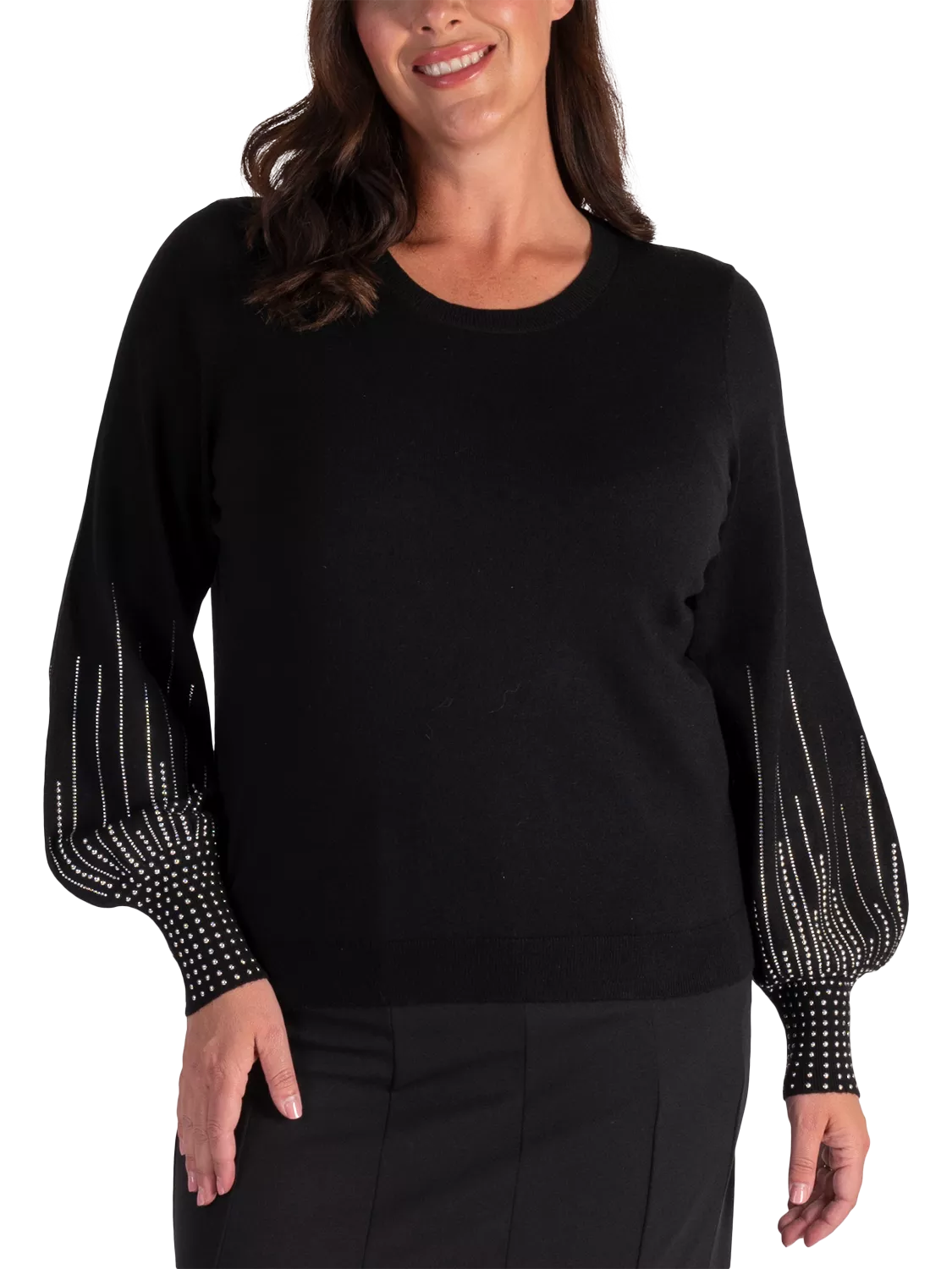 Give your look the wow factor thanks to this elegant jumper. This fine knit jumper glistens with embellishment on its statement puffed sleeves and has cosy appeal with its soft viscose blend, making this a versatile choice for both casual and more formal occasions alike.