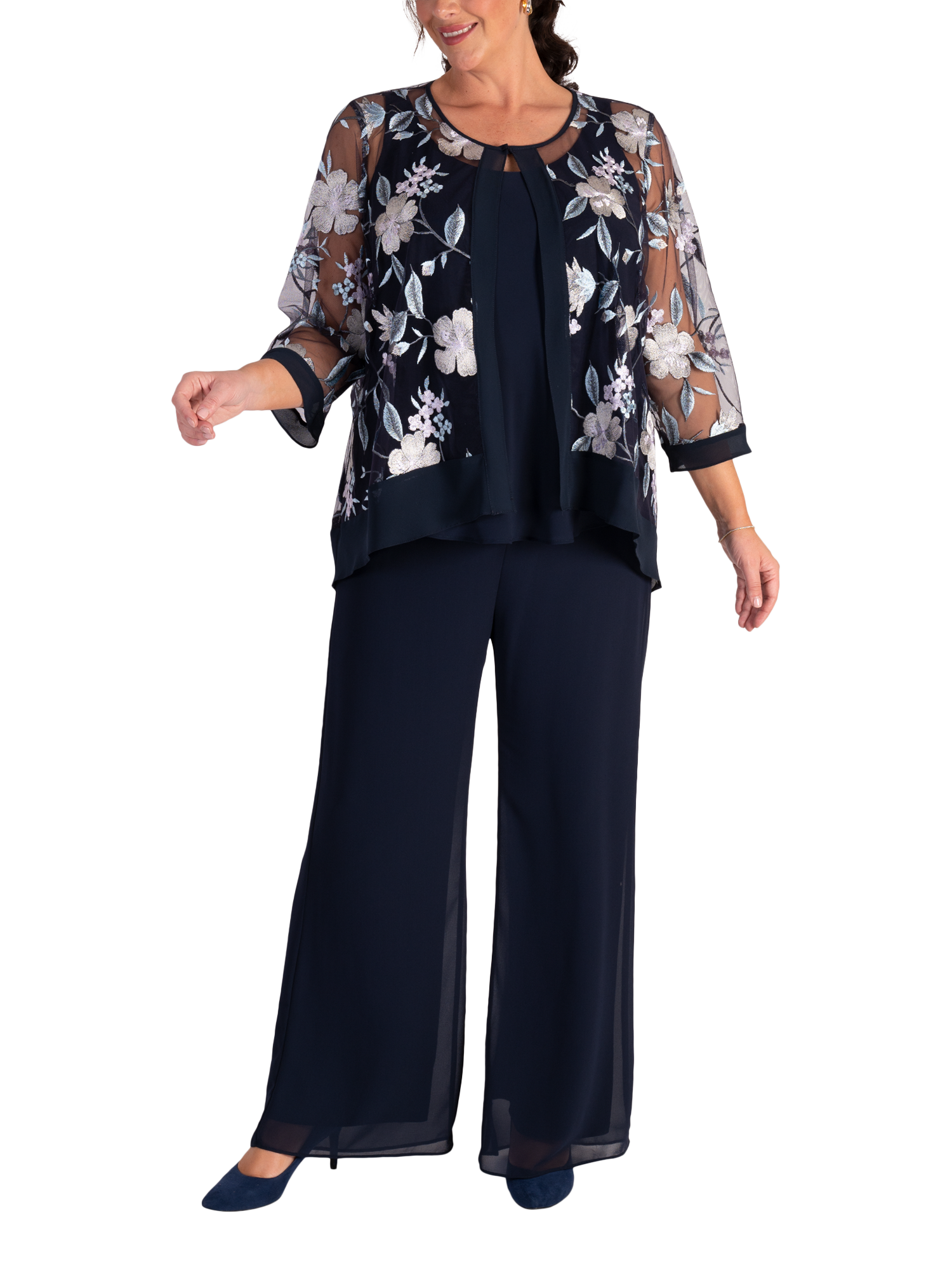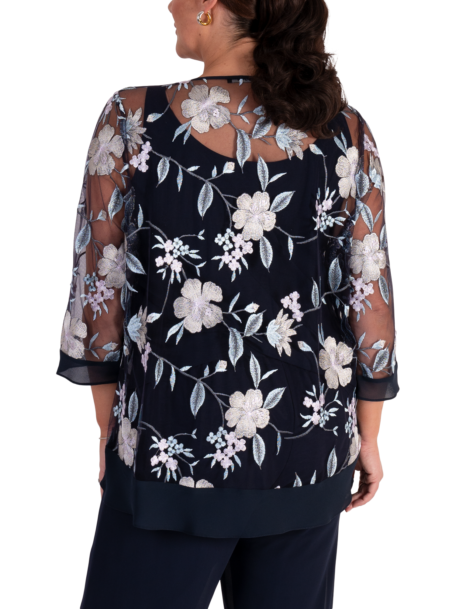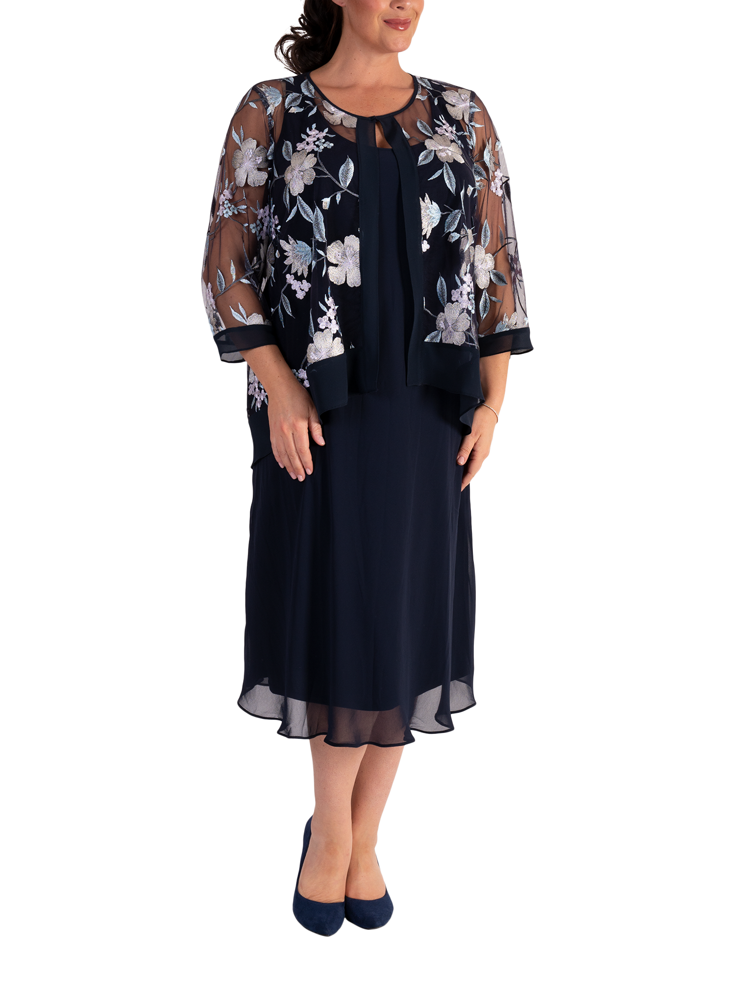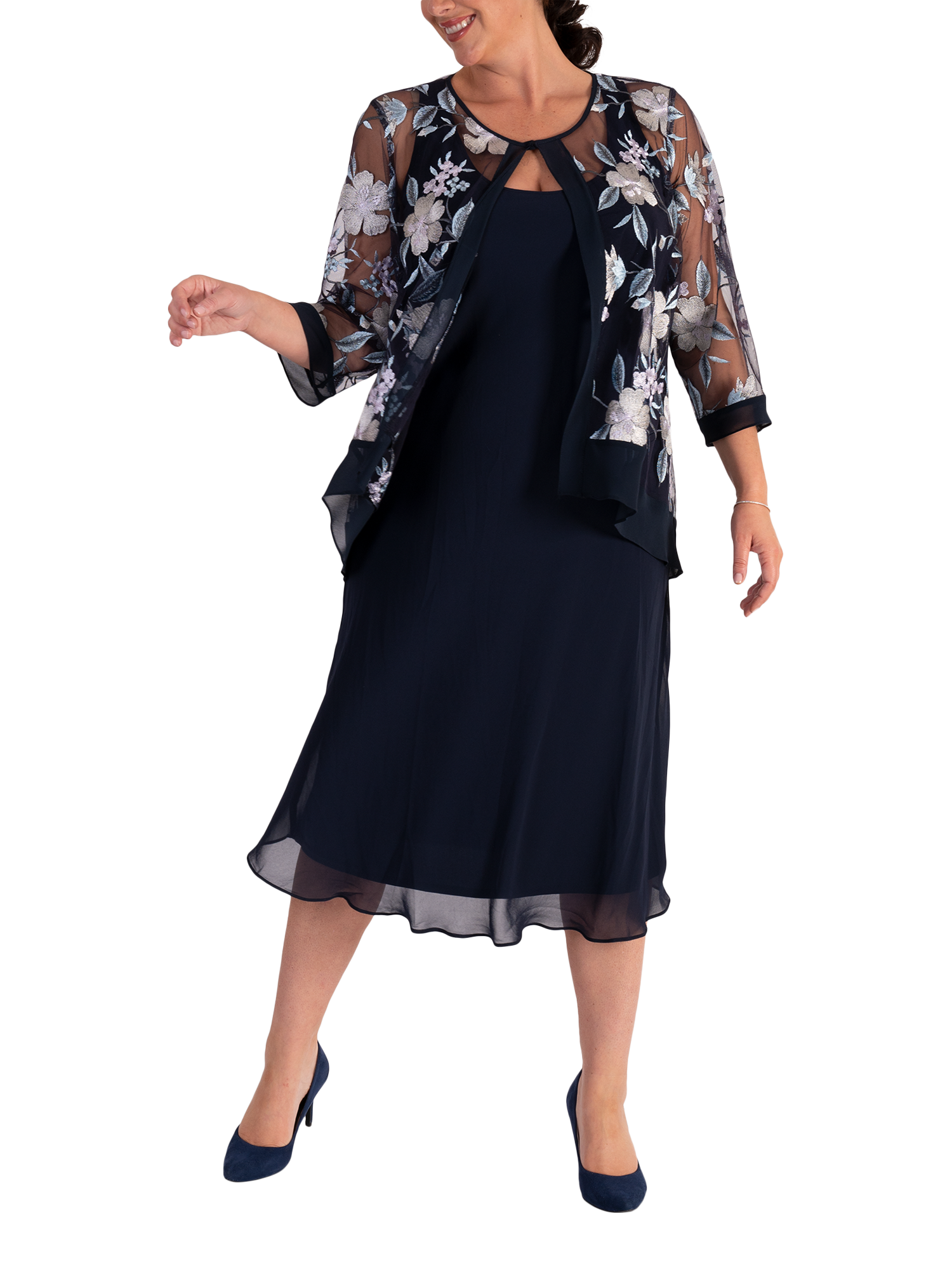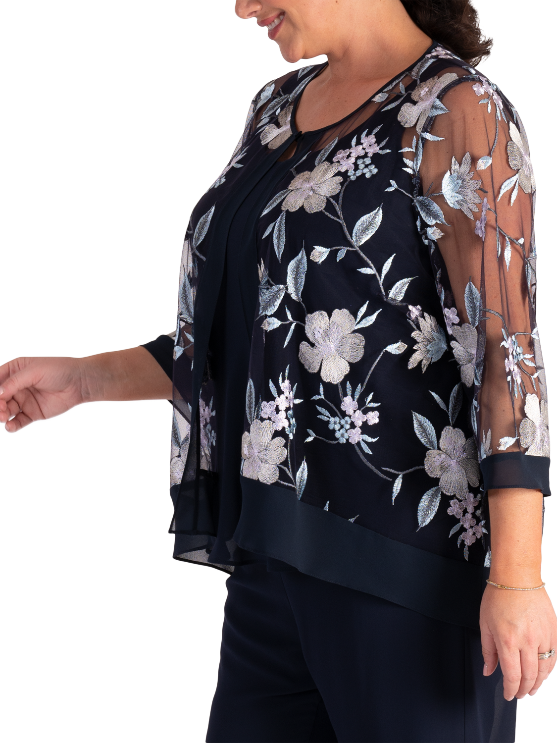A stylish layering option, this stunning mesh jacket by chesca sits at the hips for practical coverage. Featuring a fuss-free round neckline, intricately embroidered floral motifs and finished with a chiffon trim for a standout look, this 3/4 sleeve jacket is ideal to wear over chiffon separates to make a perfect outfit for a wedding, special occasion or social event. Working well with many colours, this versatile jacket will take you from season to season. Add a fascinator to complete the look.