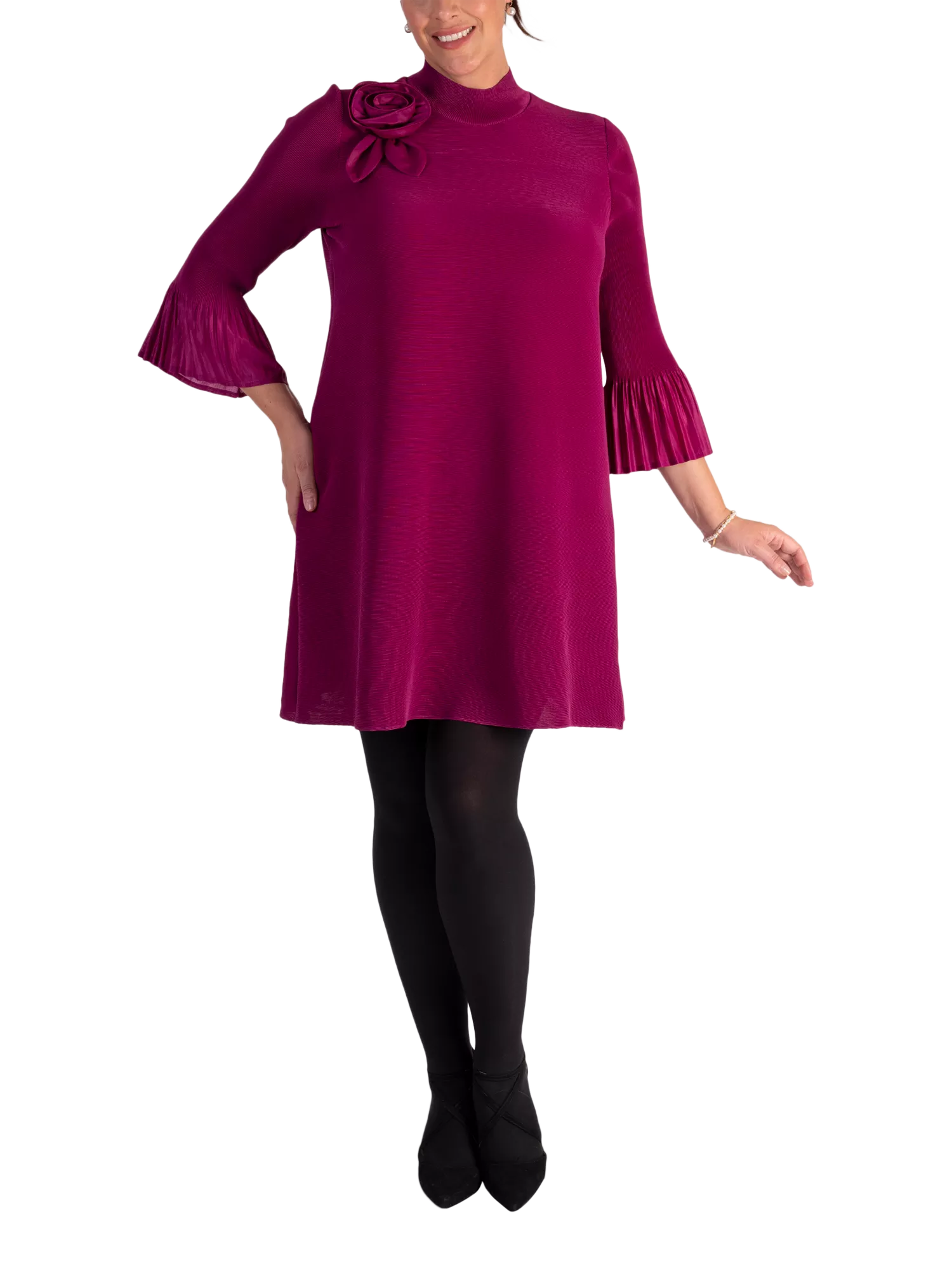 With a nod to the days of Carnaby Street, this playful A-line plissé midi dress from Chesca is perfect for any occasion or event where you want to turn heads. Statement fluted sleeves and an applique on-the-shoulder flower bring this dress to life, making it ideal for both special occasions and stylish everyday wear. With its flattering fit and timeless design, it s the perfect addition to any wardrobe for a fresh, feminine look.