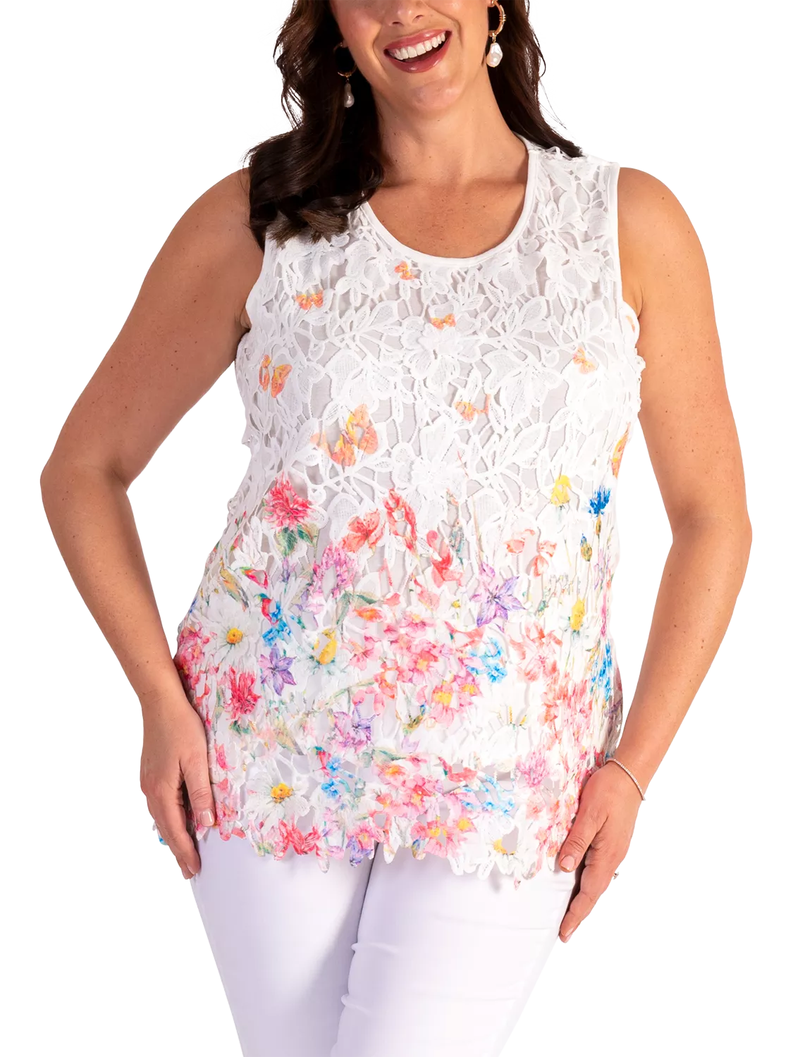 A faithful staple, this sleeveless lace top is an elegant choice for the season ahead. Cut with a round neckline, it is crafted from a durable fabric for longevity of wear and is an ideal piece to elevate any outfit. The feminine floral lace is accented with a multitude of subtle colours and easily pairs with both tailored trousers for a sophisticated look and capris/espadrilles for a more casual approach.