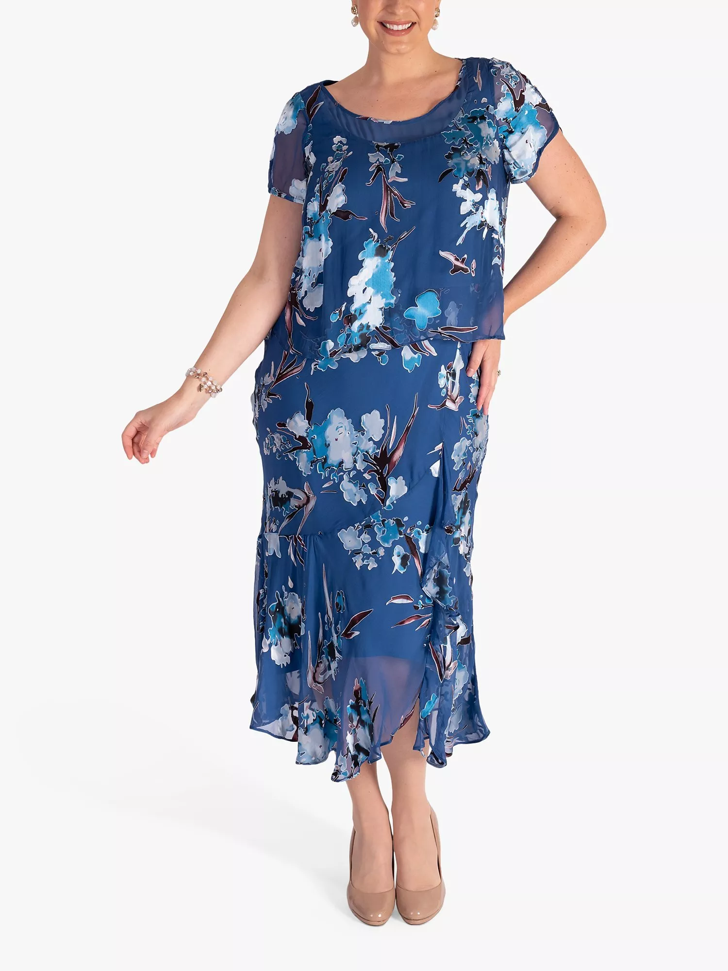 With an on-trend tiered shape, this mid-length dress from chesca is blended with liquid-like silk. Framed with a chiffon inlay at the neckline and short sleeves, this style boasts a floaty asymmetric skirt and is adorned with a frill trim.