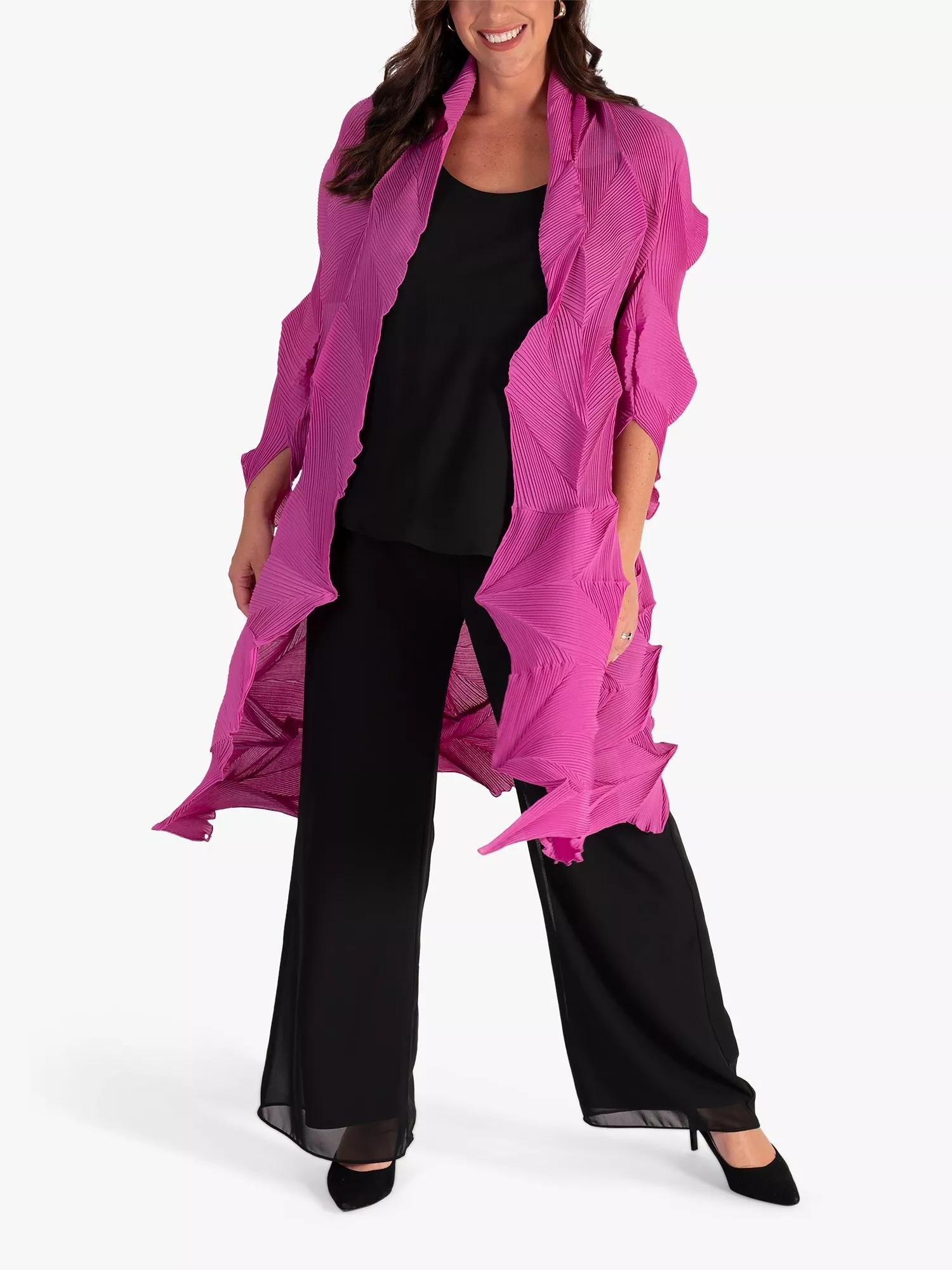 An unique layering piece, this lightweight shrug from chesca is crafted from 3D pleated chiffon producing a stunning sculpural effect. Designed with a relaxed, open neckline and three quarter length sleeves, this style elongates your profile with its longline cut and is ideal to throw over a smart-casual outfit to create a modern, edgy look.
