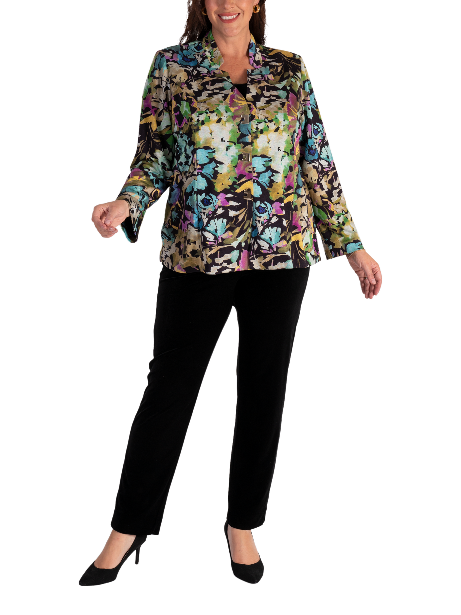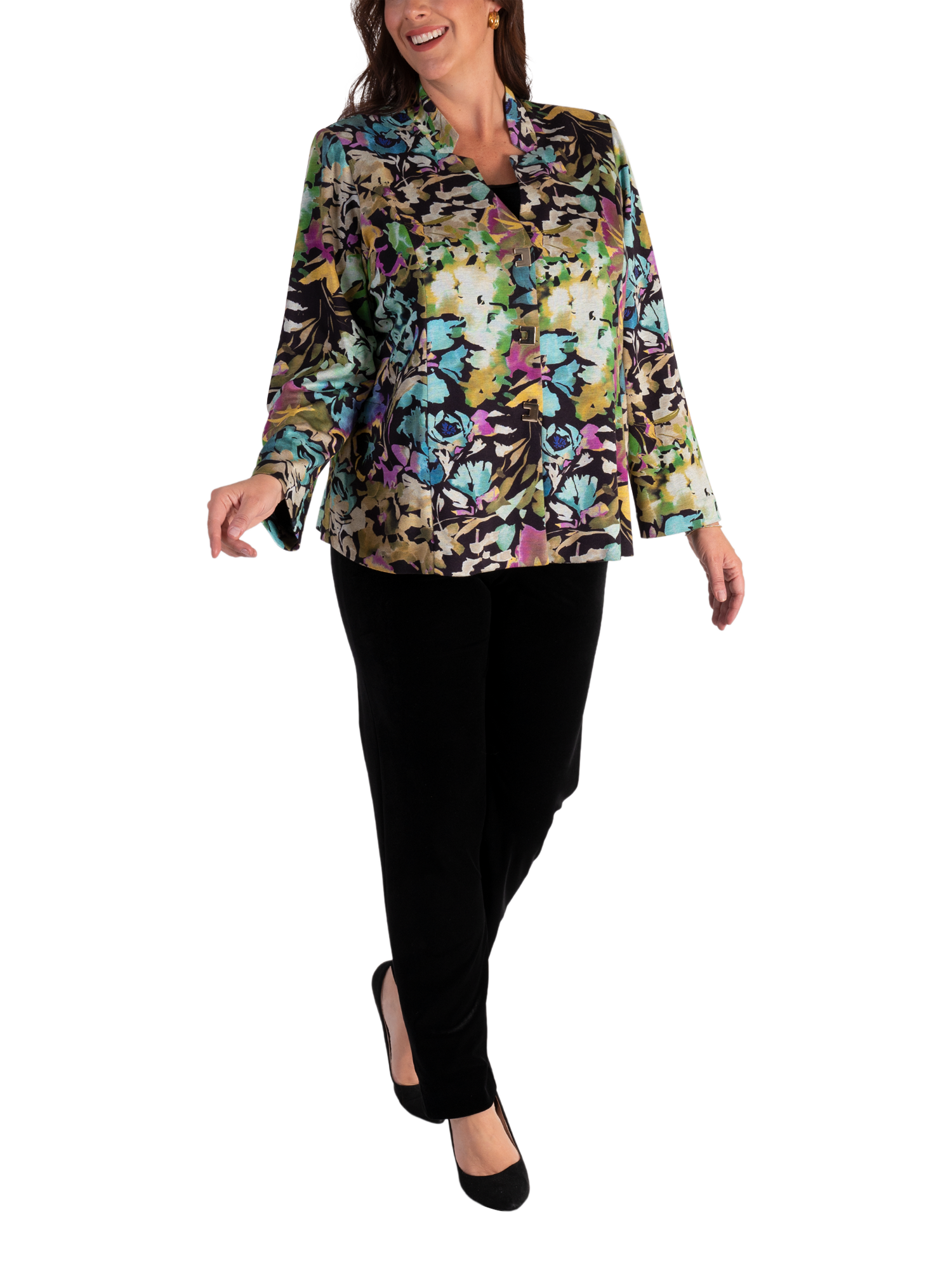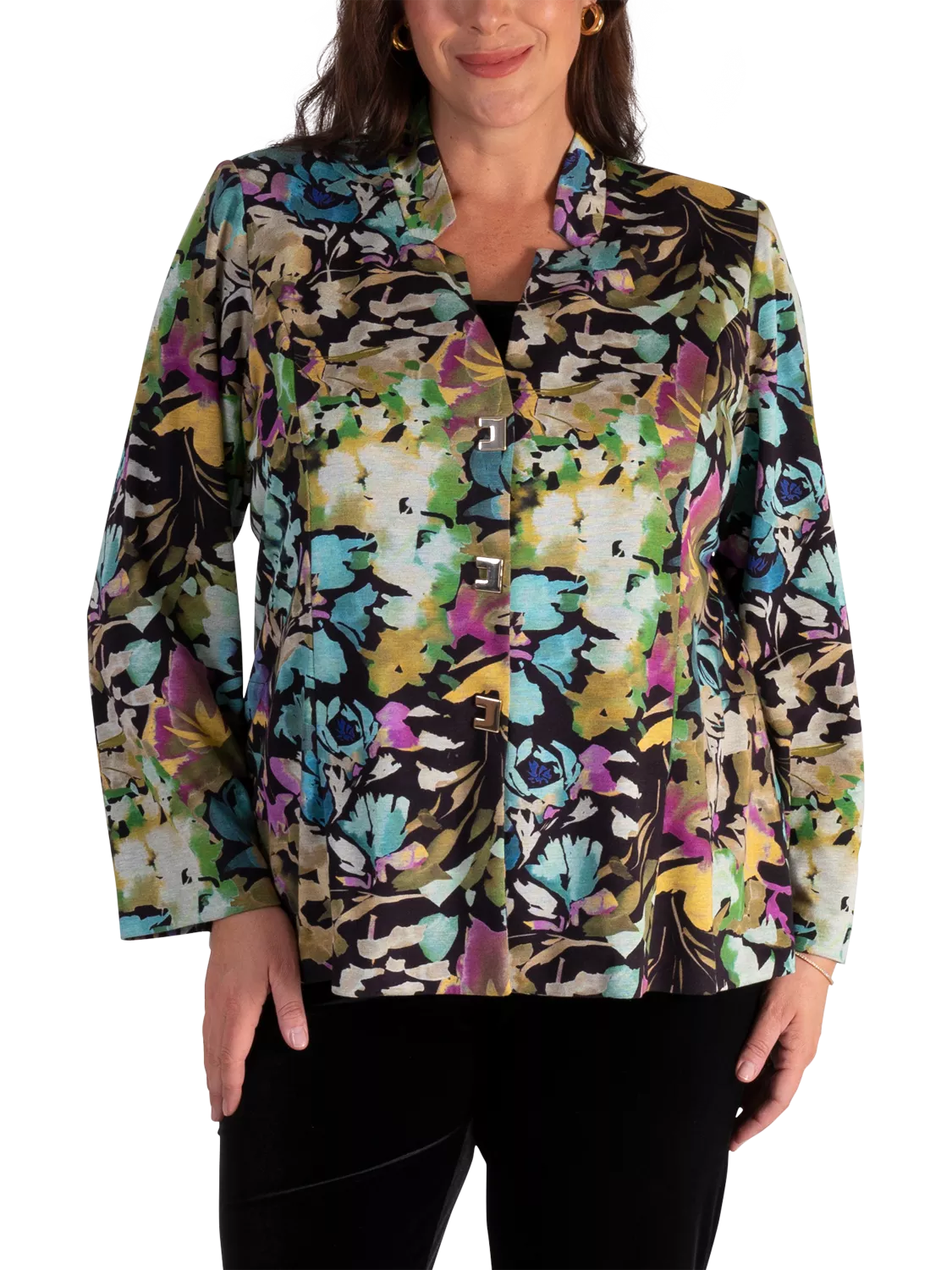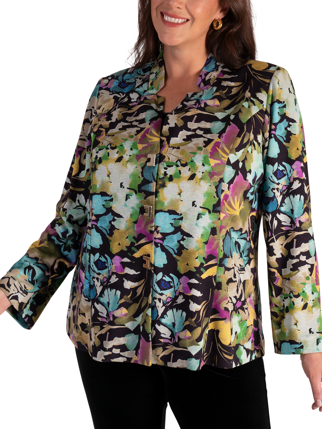Day or night, this little floral print jacket will complete any outfit. Cut in a flattering cropped style, it sits perfectly over dresses or trousers alike for a contemporary profile. Featuring a notched V neckline, long sleeves sleeves and side seam pockets, it is finished with stylish statement gold fastenings, and is made from a smooth jersey fabric for light and comfortable wear.