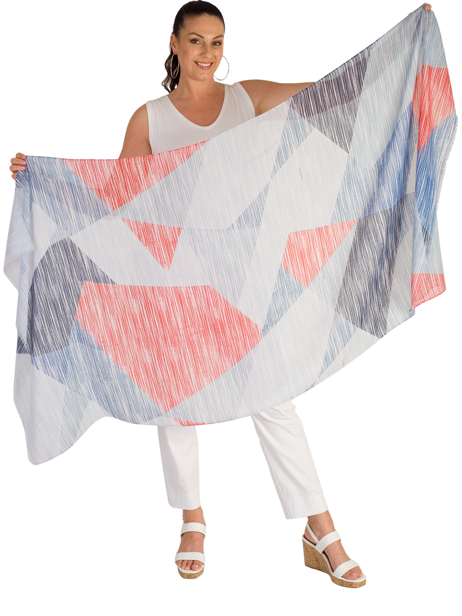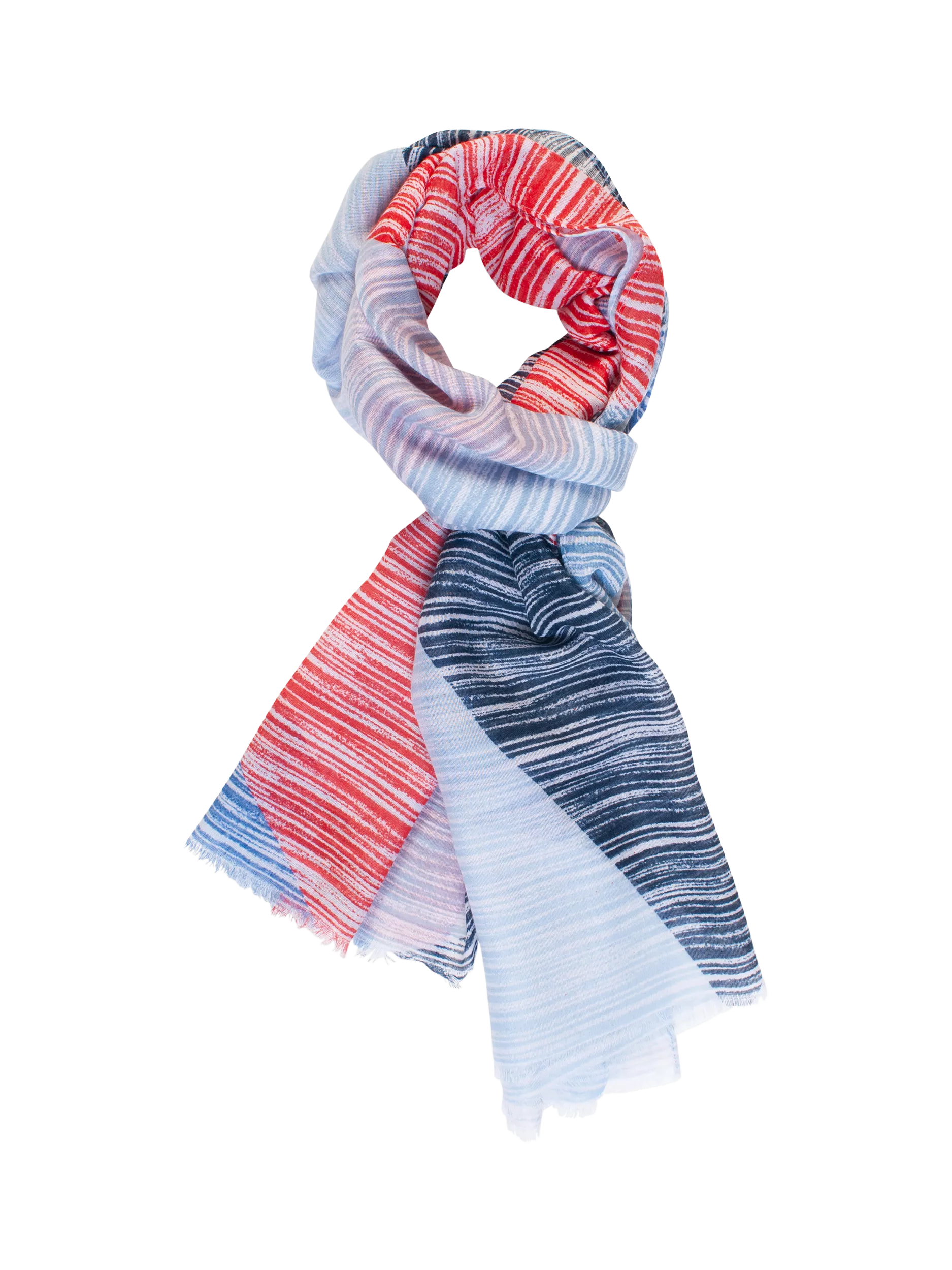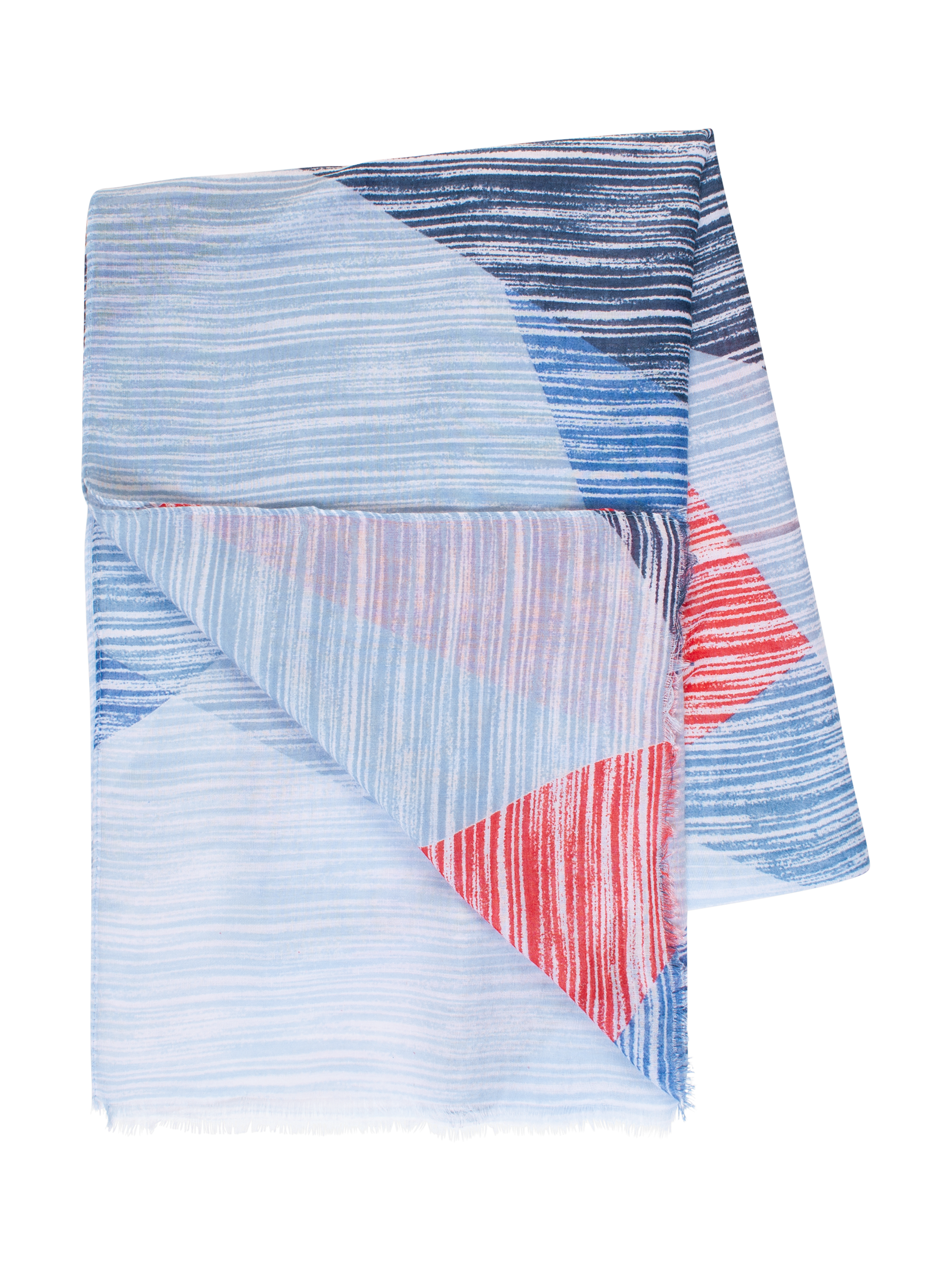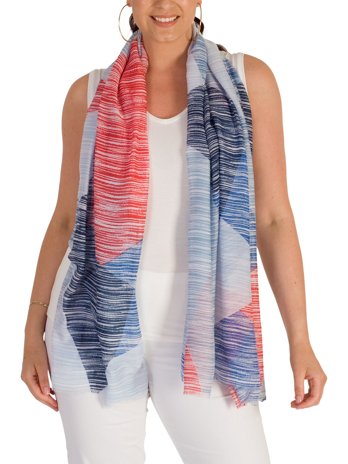 Made to complement your ensemble, this scarf from chesca features sketched geometric shapes throughout in colour blocks of red, white and shade of blue.