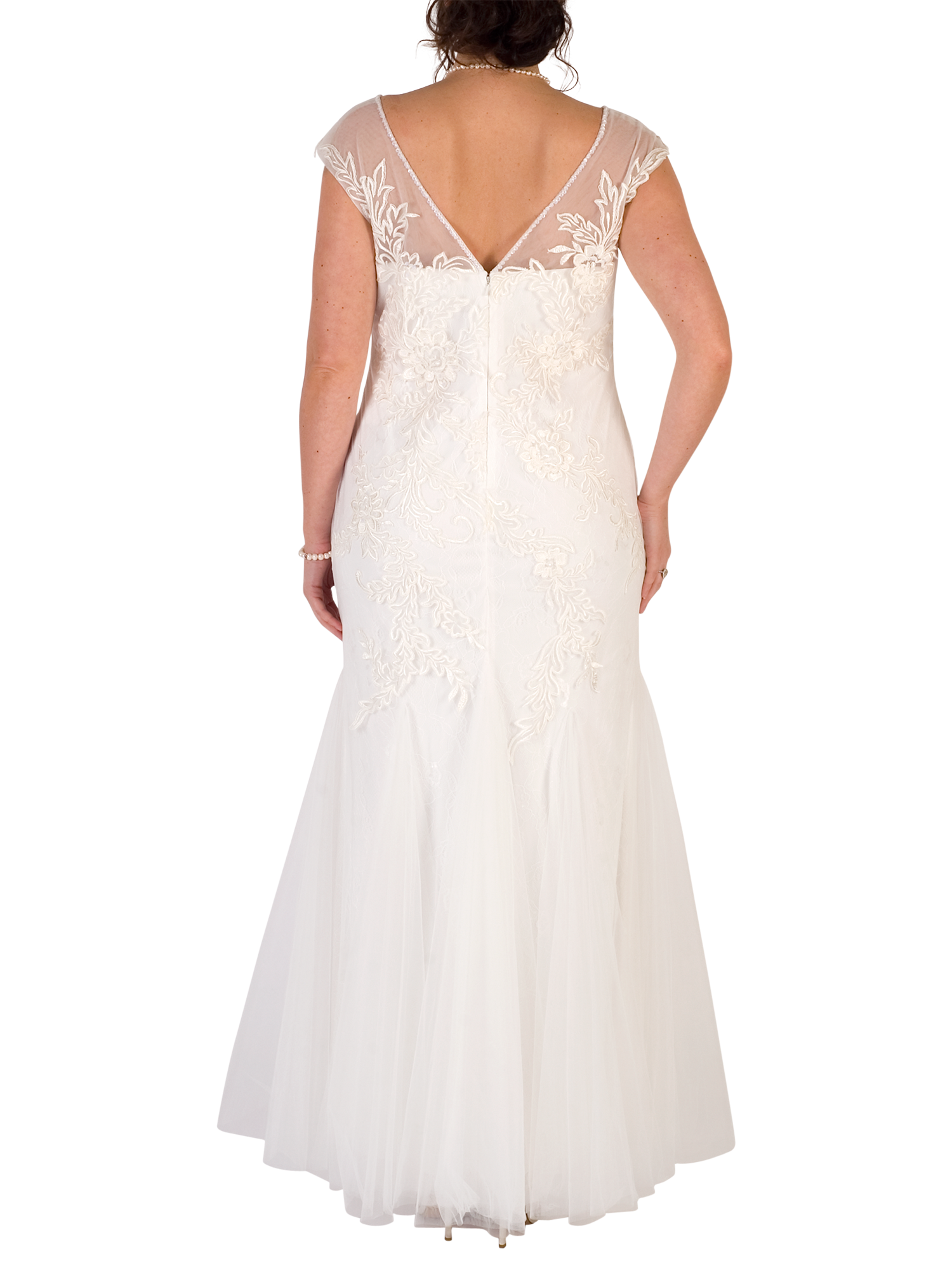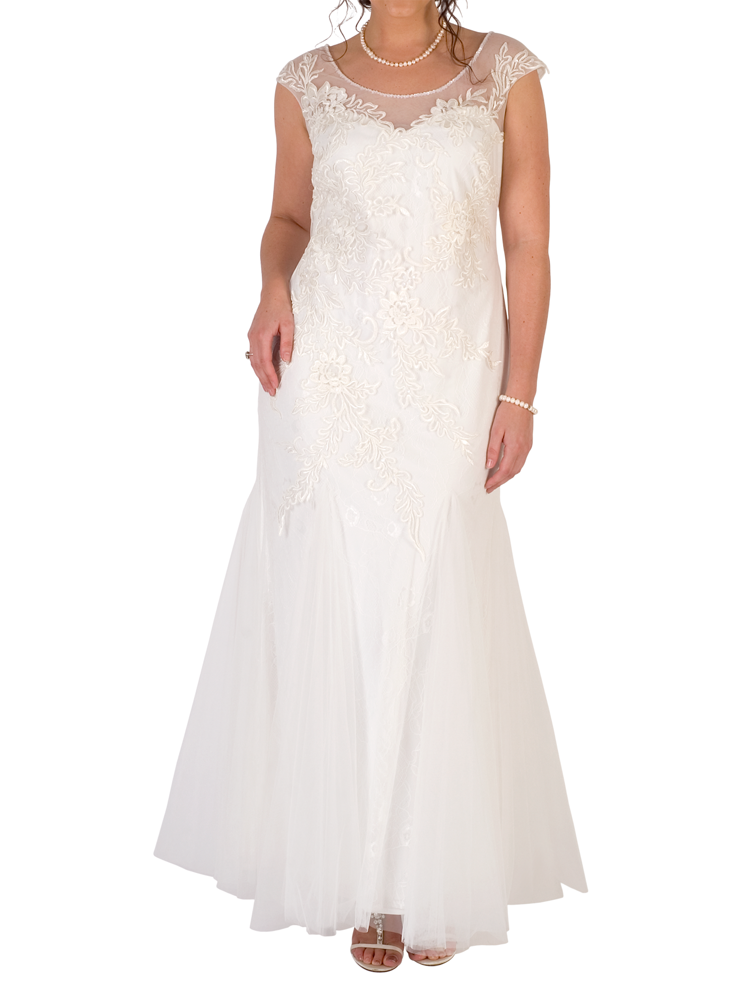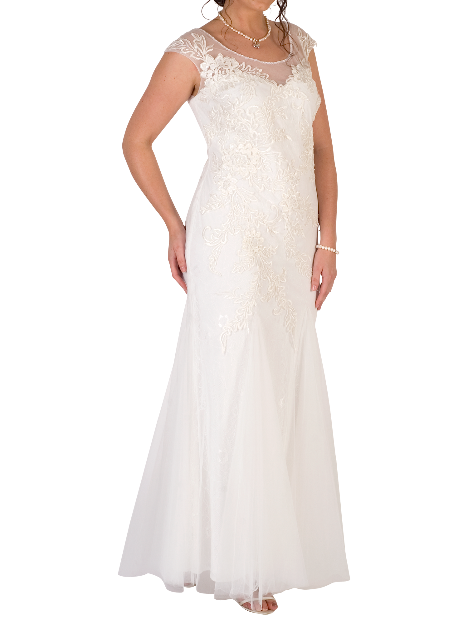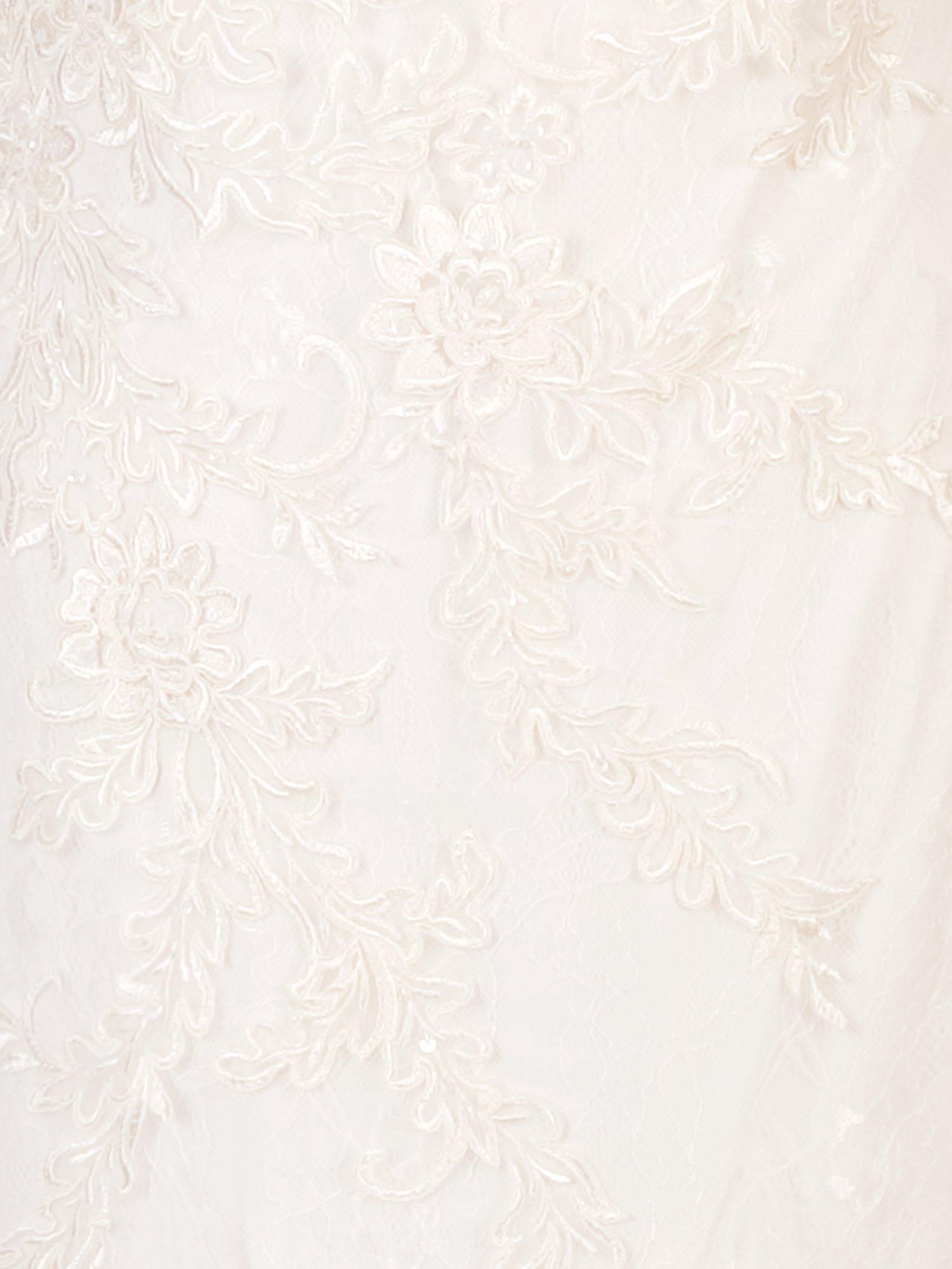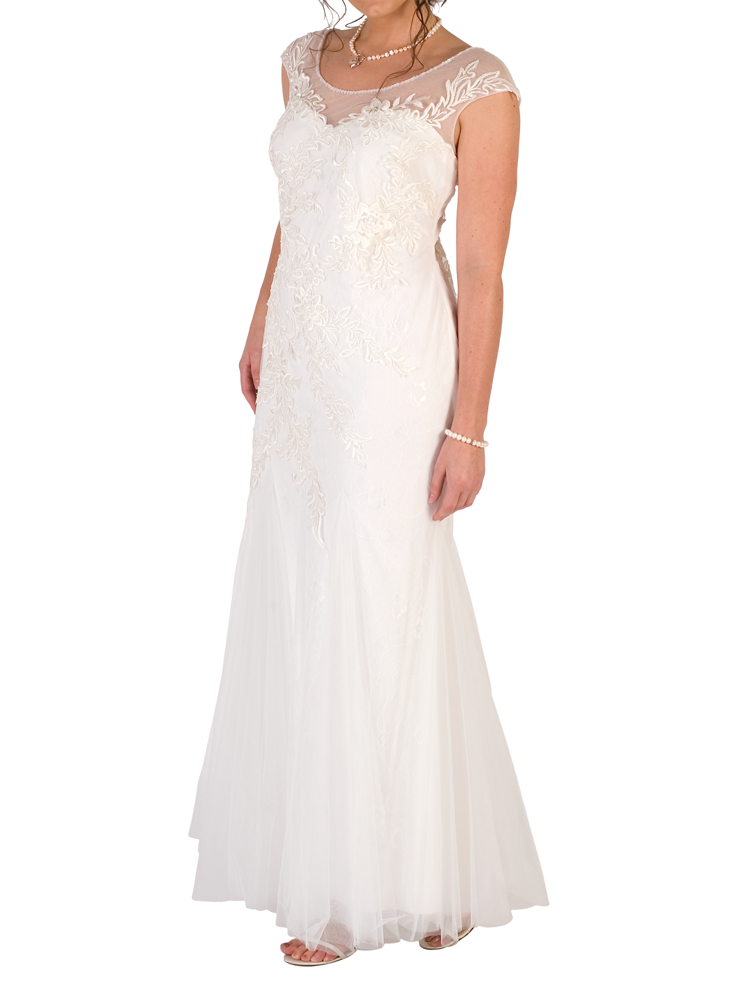 With flattering cap sleeves, this dress consists of a sweetheart neckline bodice under a stunning tulle overlay which is adorned in a pretty floral-inspired embellishment. Fastened with a discreet zip on the reverse.