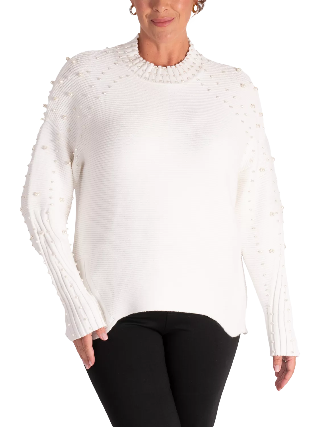Adorned with pearl embellishment along the sleeves, neckline, and shoulders, this oversized knitted jumper exudes sophistication and femininity. Crafted from a soft ribbed knit, it features a classic high neck and long dropped sleeves for a timeless and relaxed fit. Wear yours with slimline trousers and heels for a sophisticated edge.