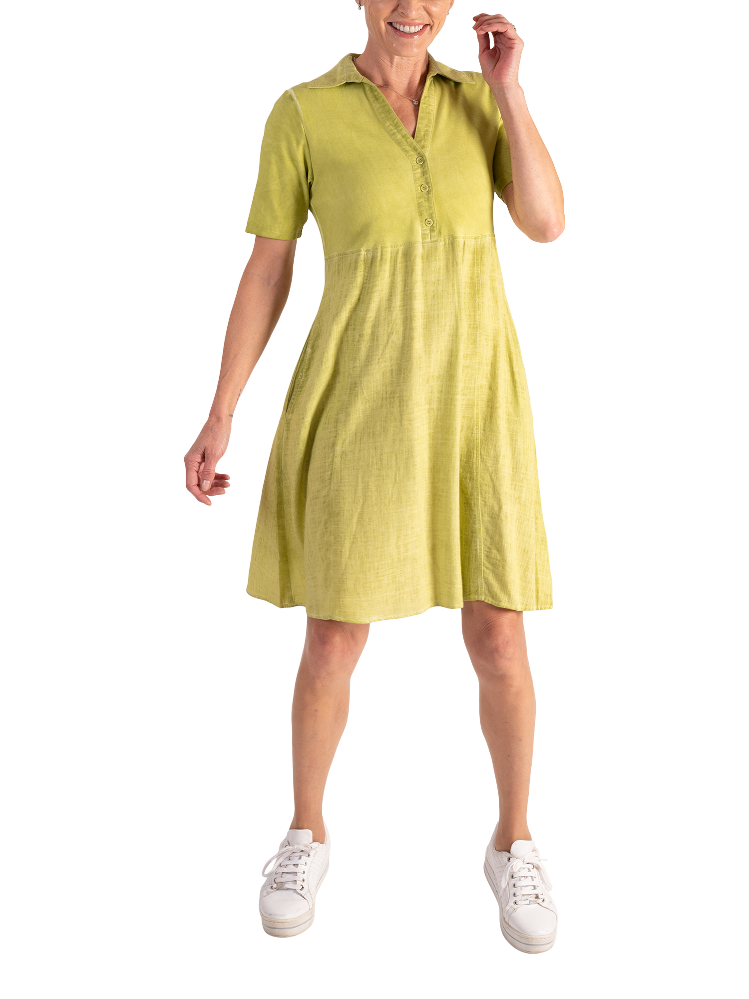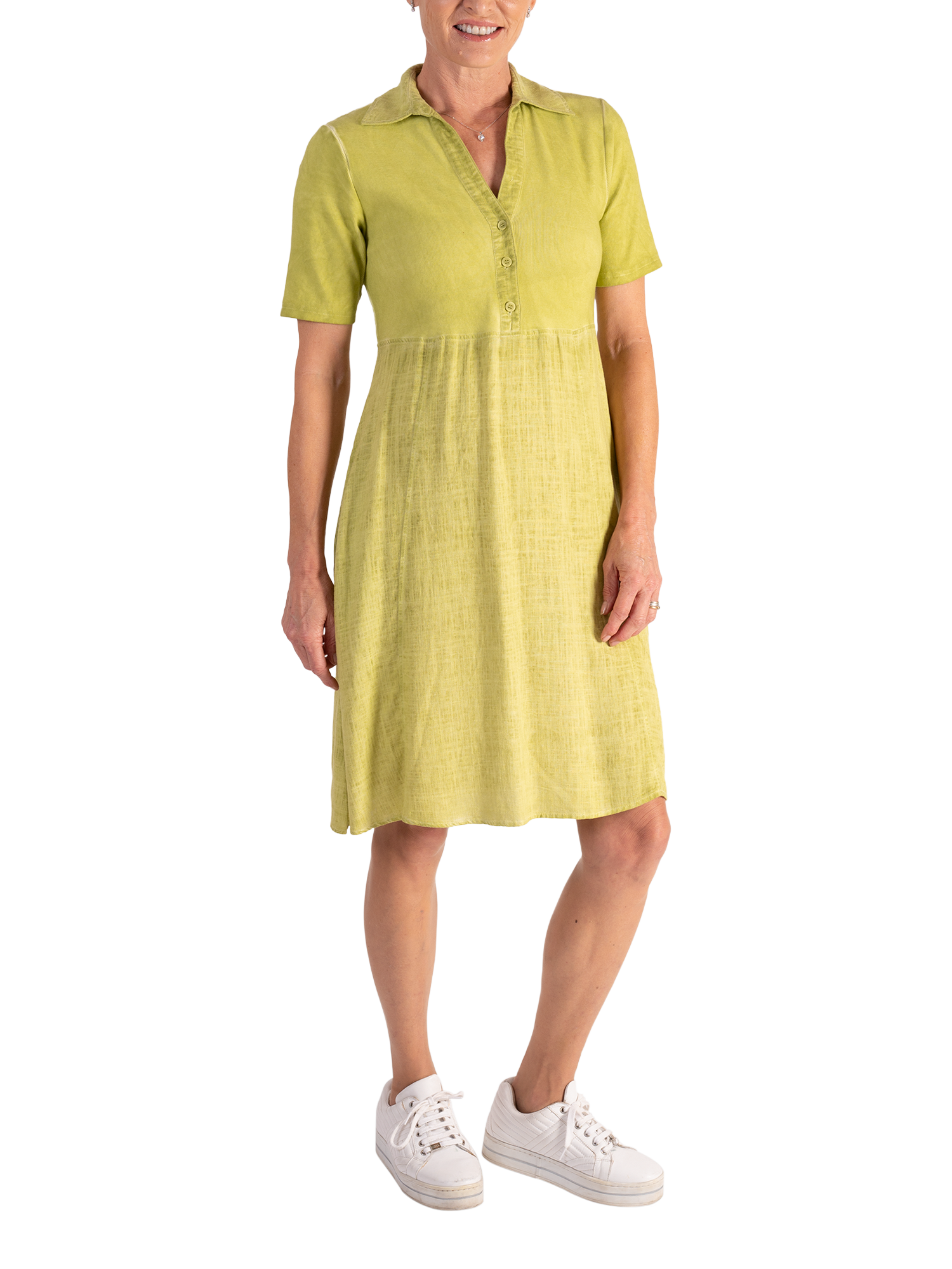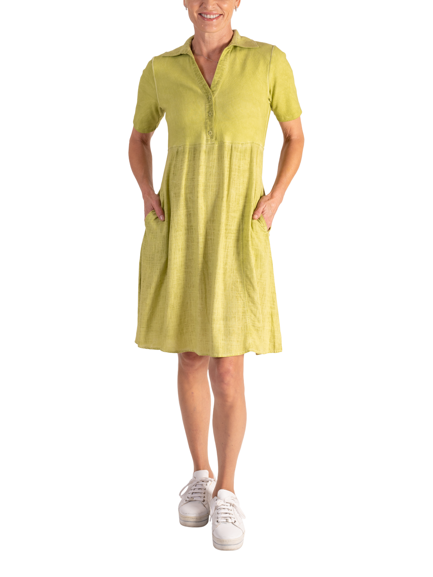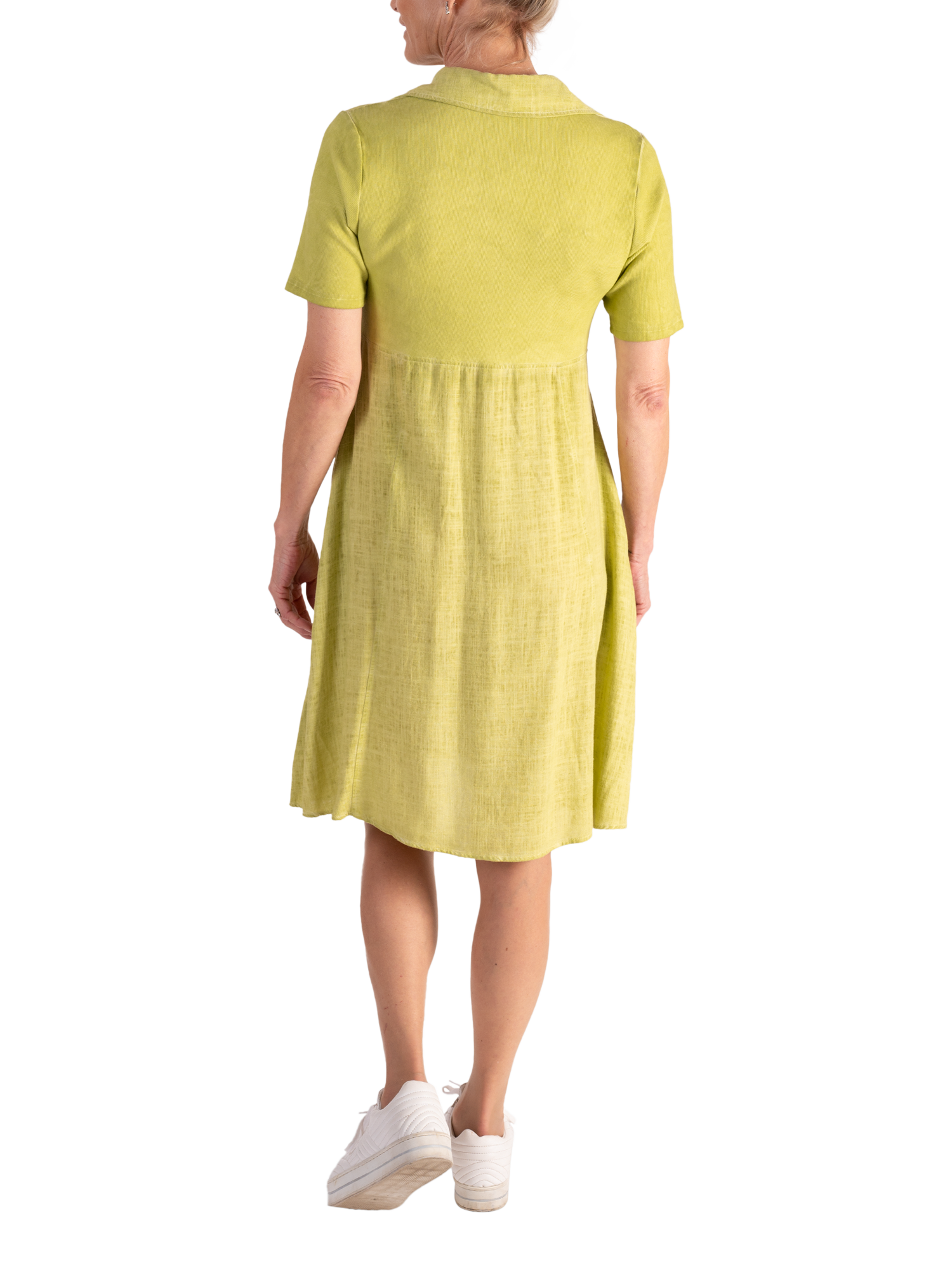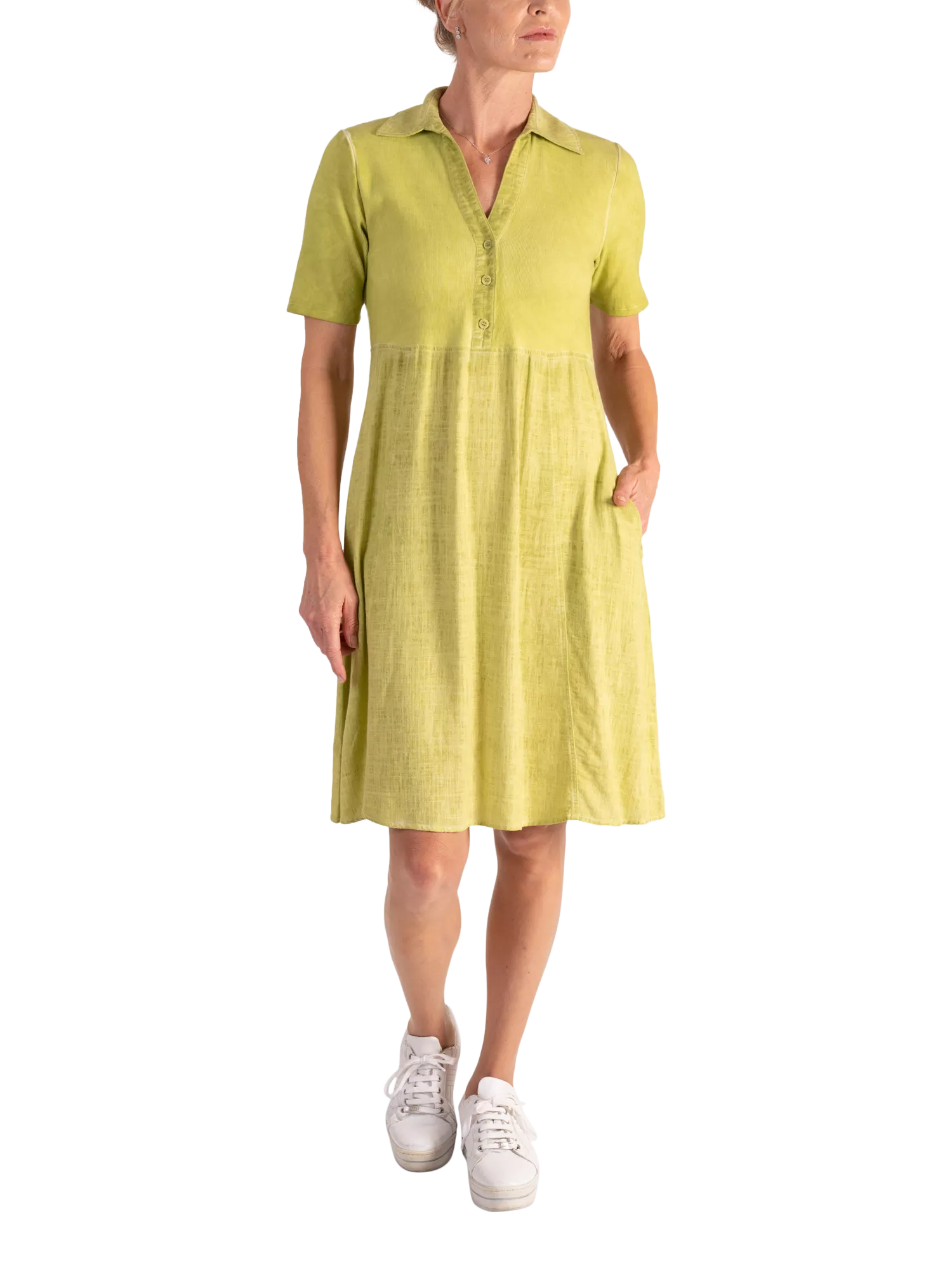 Effortlessly skimming your frame, this knee-length fit and flare dress is created from a mix of two of our favourite fabrics. Classically framed with a shirt collared neckline and three buttoned placket, top is crafted from a ribbed cotton jersey fabric, whilst two side seam pockets are hidden in the lightweight linen blend skirt.