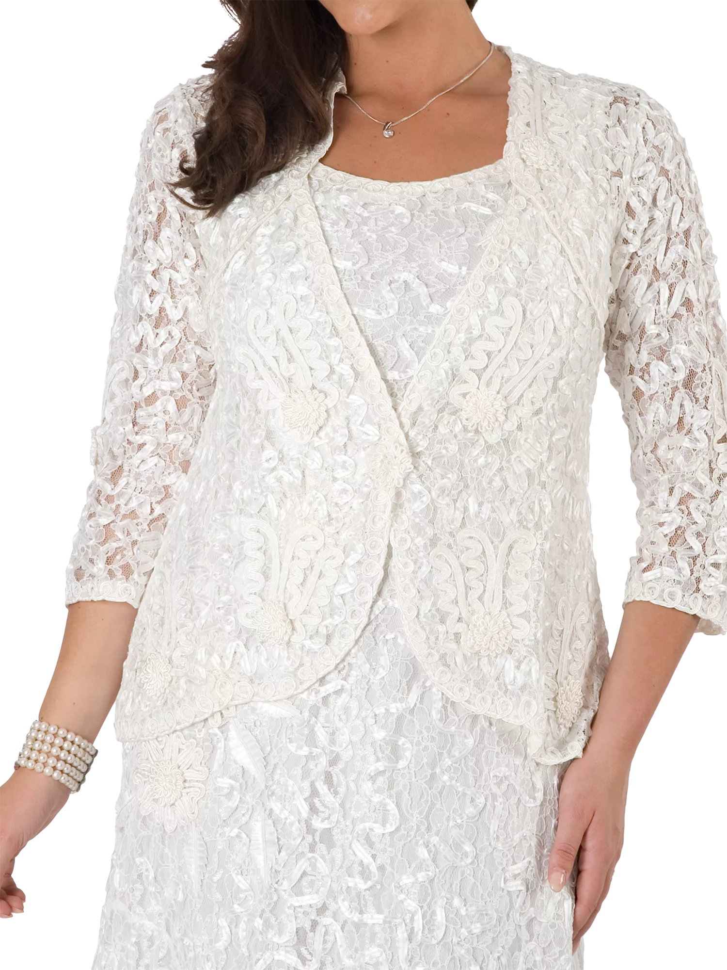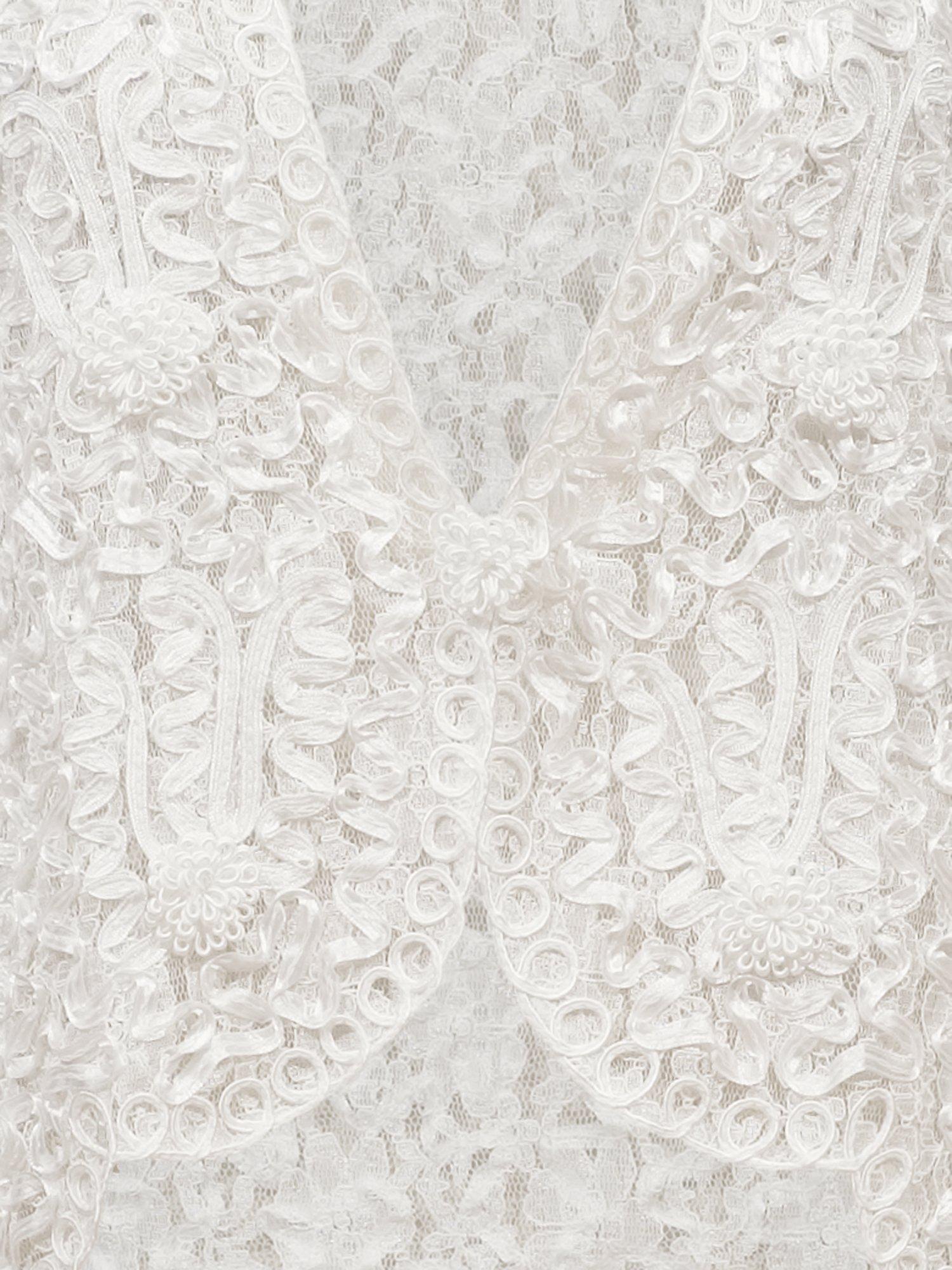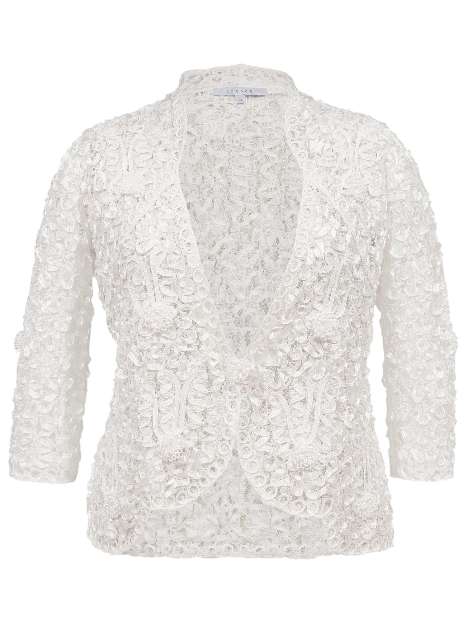 A luxury lace detail jacket by chesca, featuring a fitted style for ultimate shape and slim, three-quarter-length sleeves.