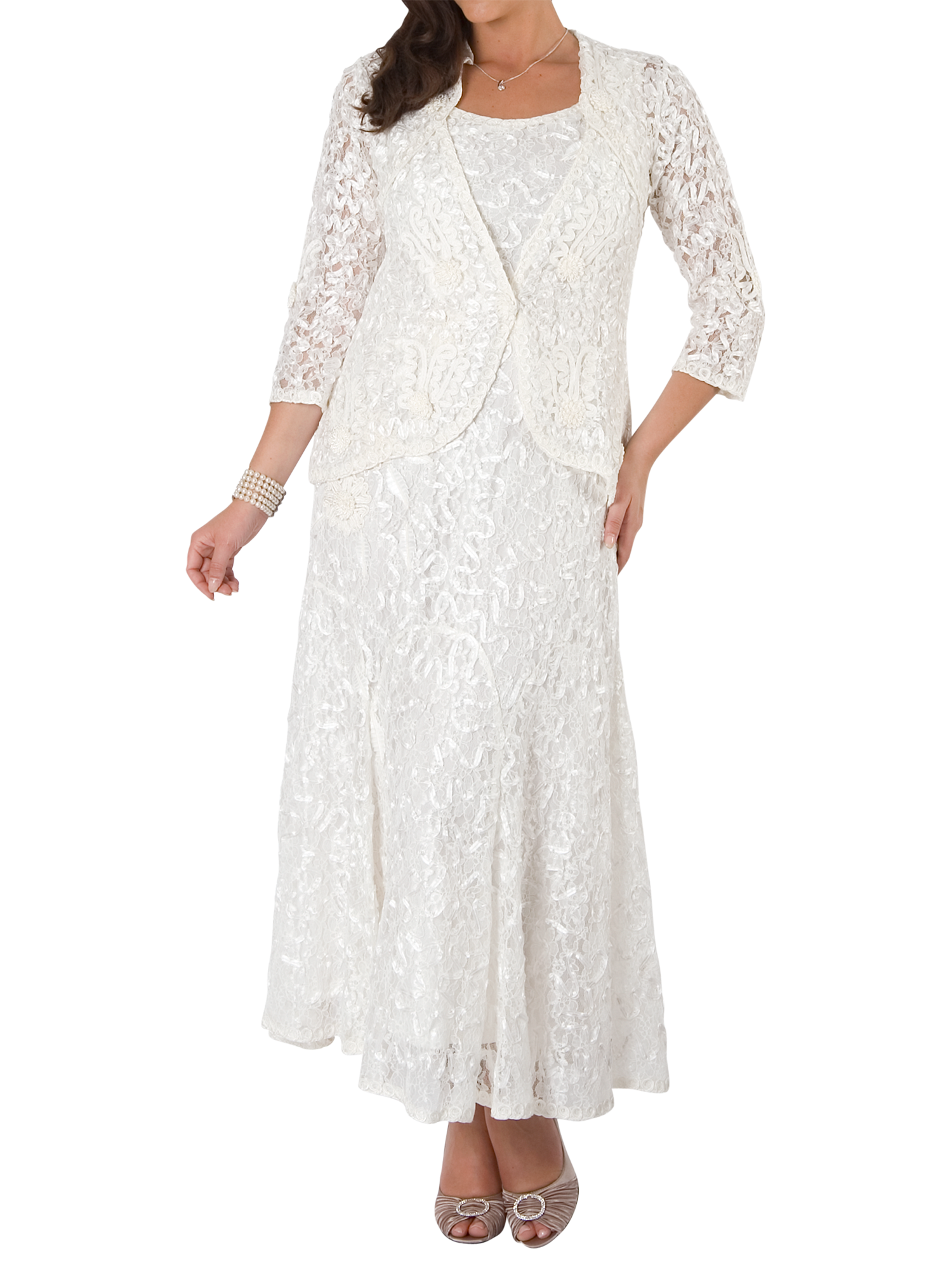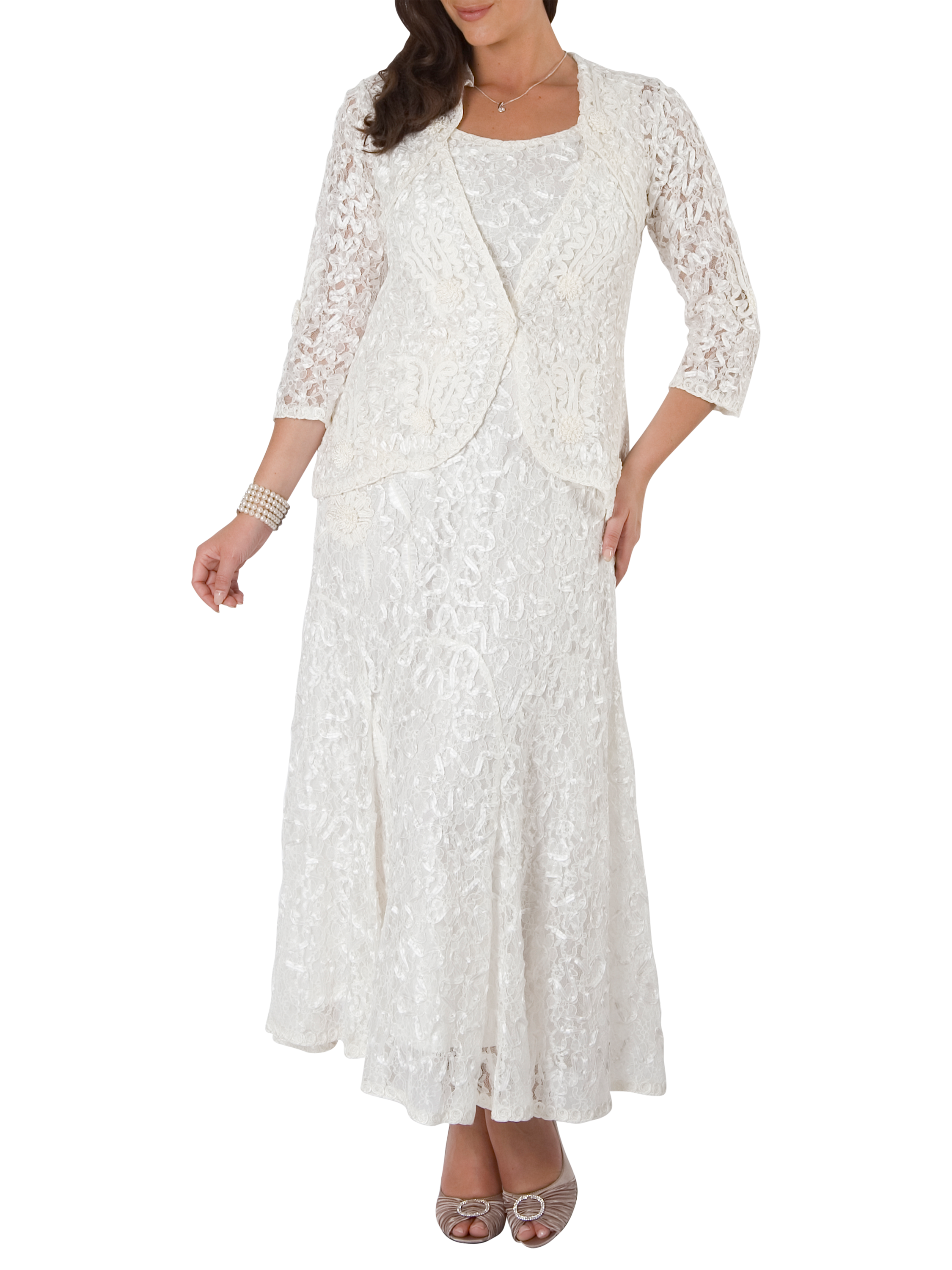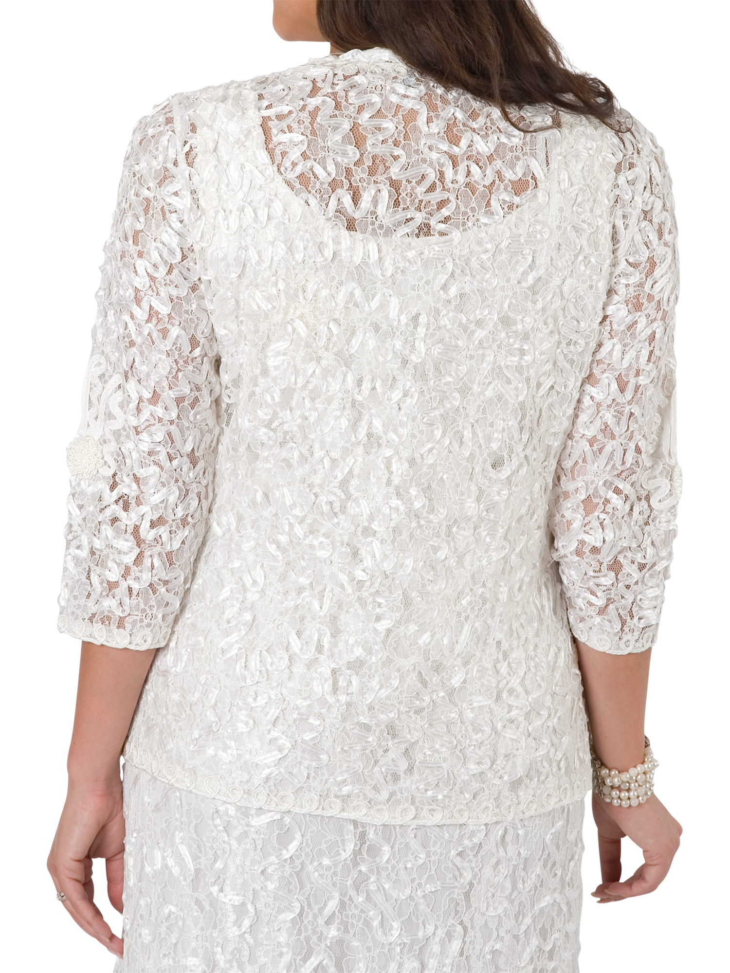A luxury lace detail jacket by chesca, featuring a fitted style for ultimate shape and slim, three-quarter-length sleeves.