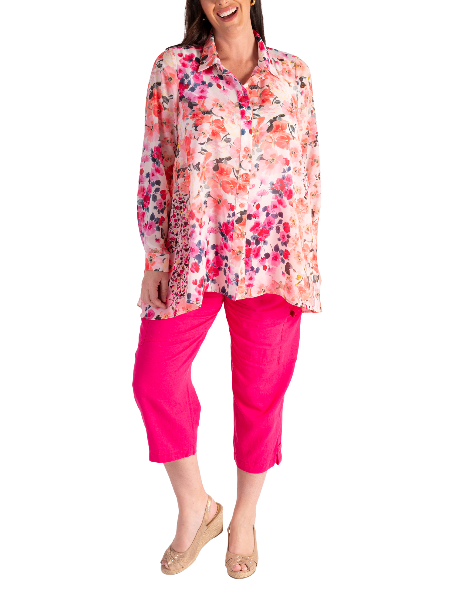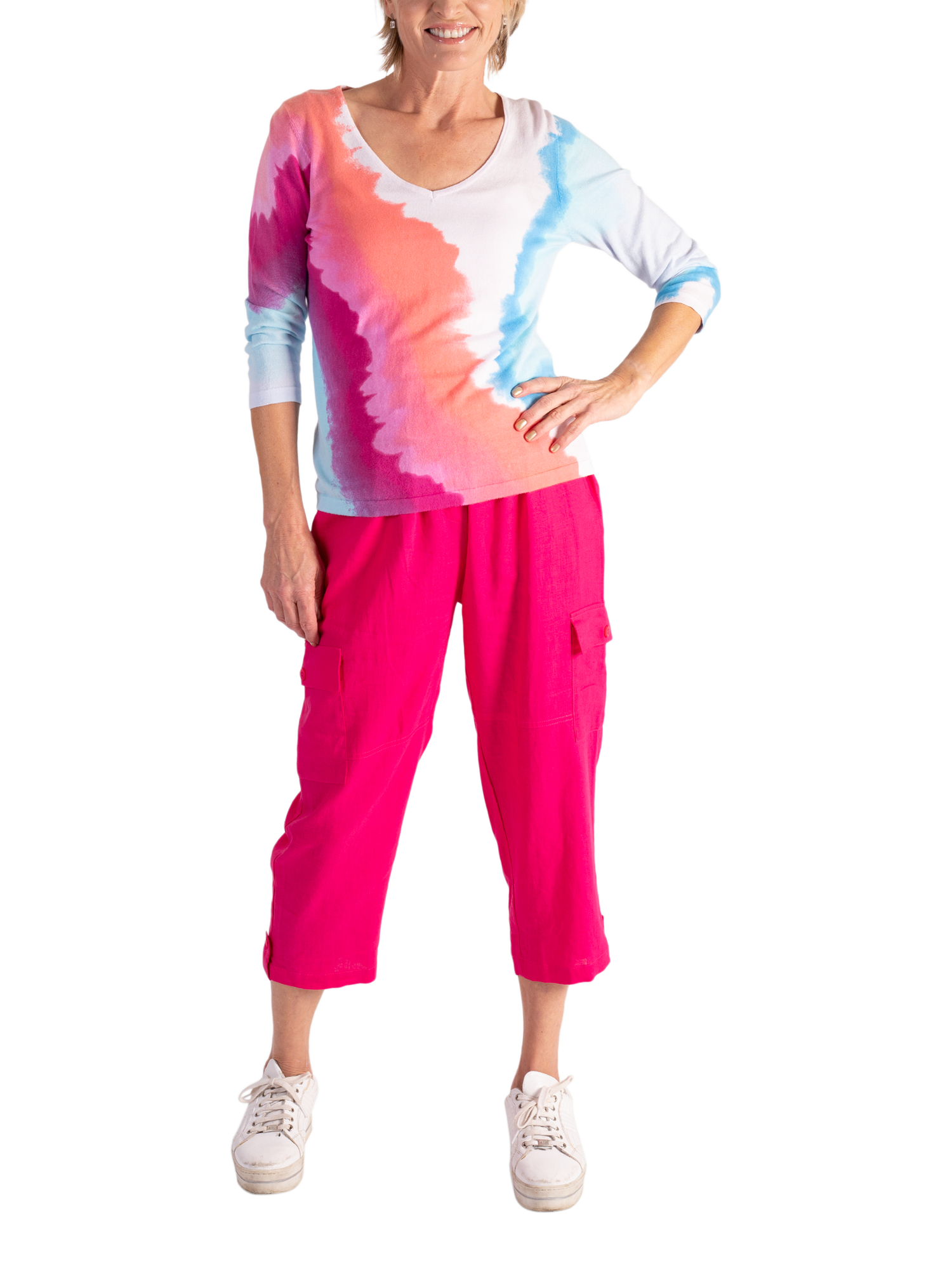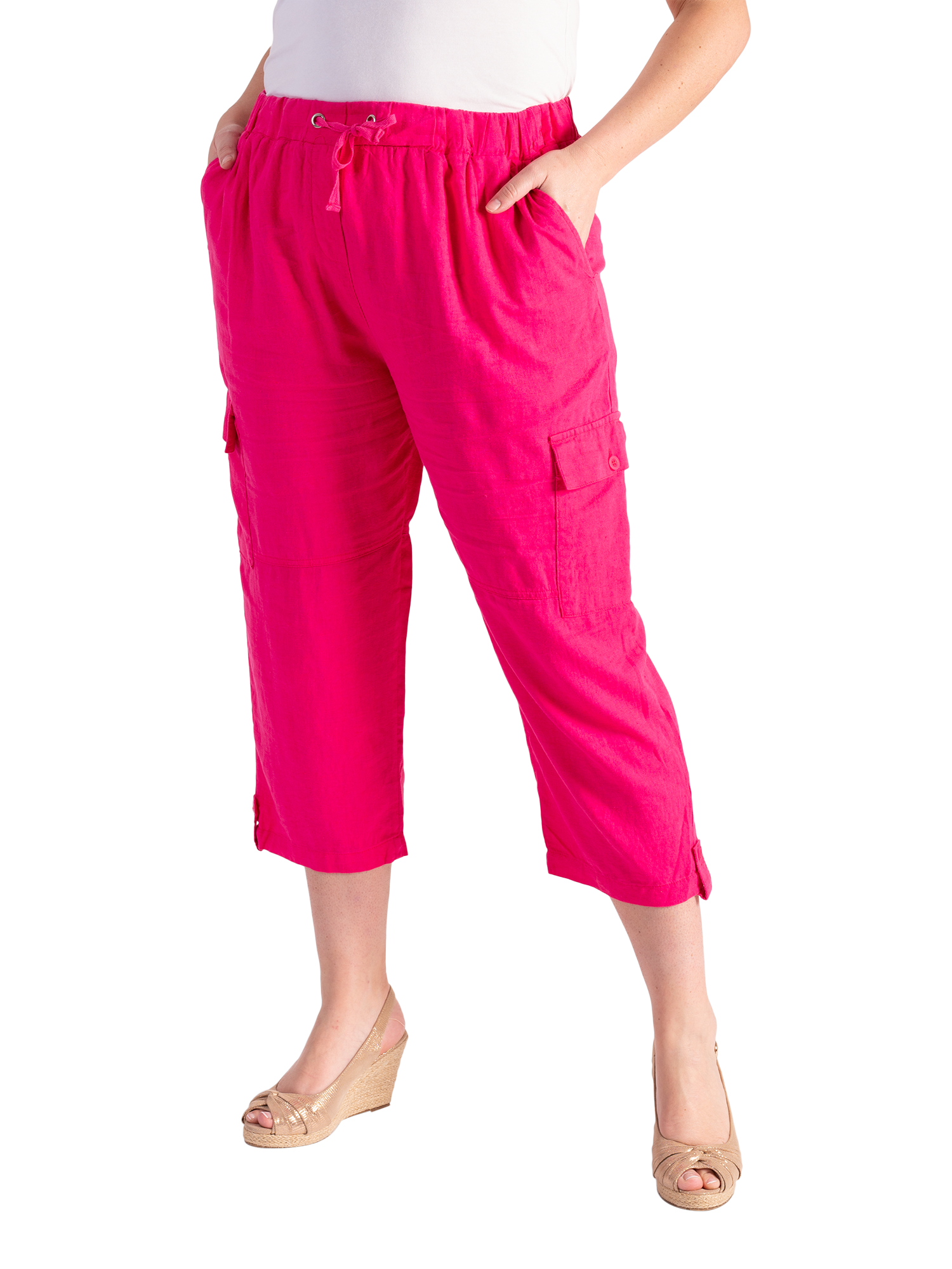 Ideal for warmer days, these relaxed cropped cargo pants have a pull-on elasticated waist and feature two side button-tab pockets. Fashioned from a linen mix fabric for ease of comfort, they play nicely with both plain and patterned separates thanks to their plain ground and are perfect to take on holiday or for spending summer days in the city. Inside leg measures 55cm, waistband to hem measures 87cm.